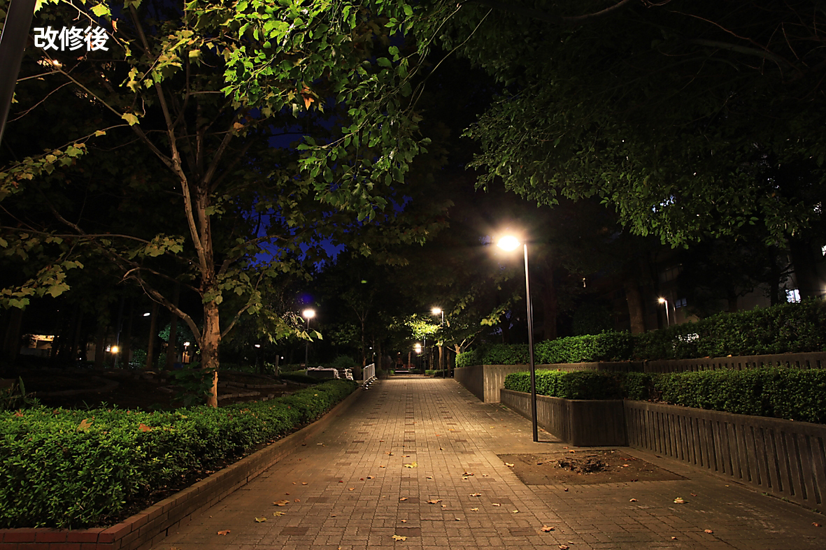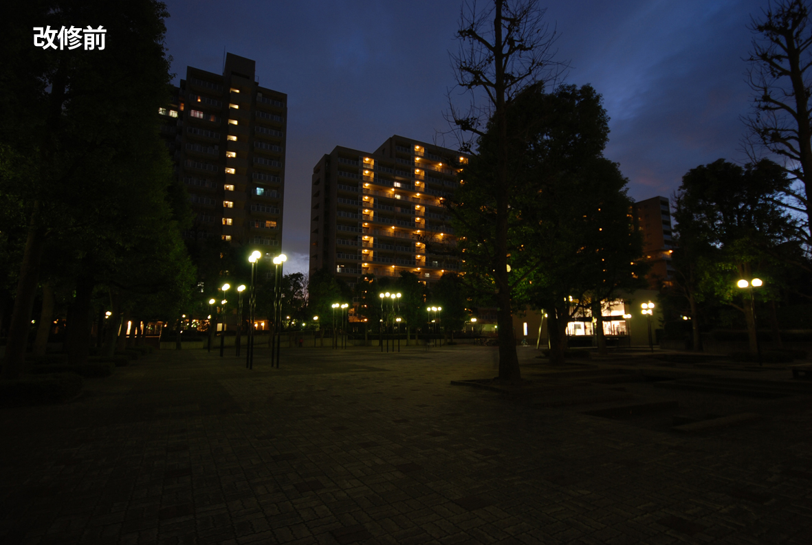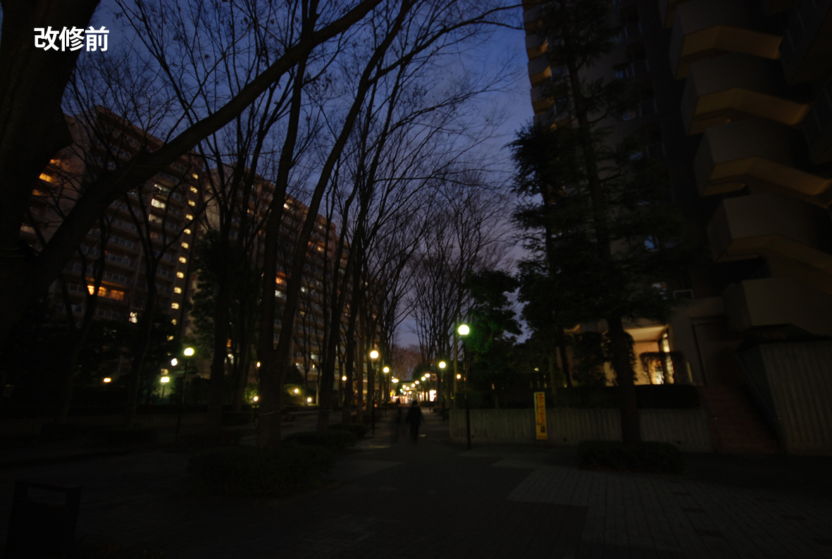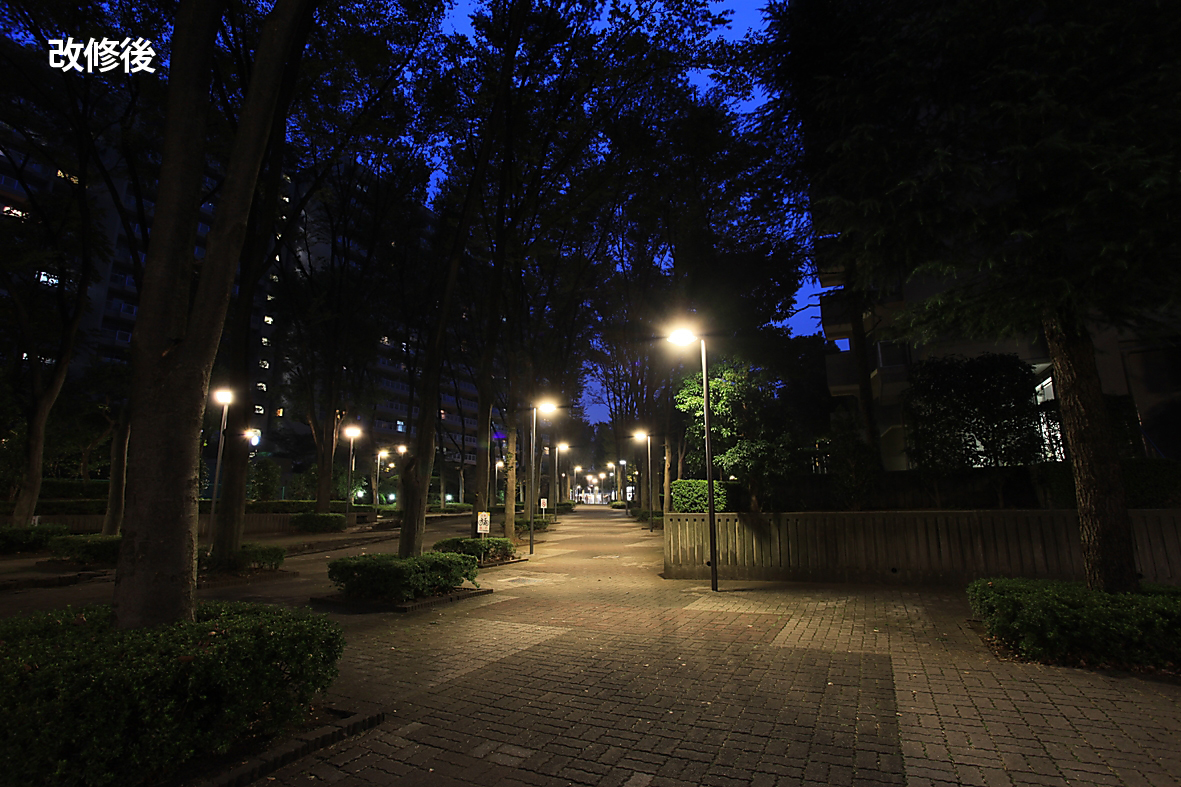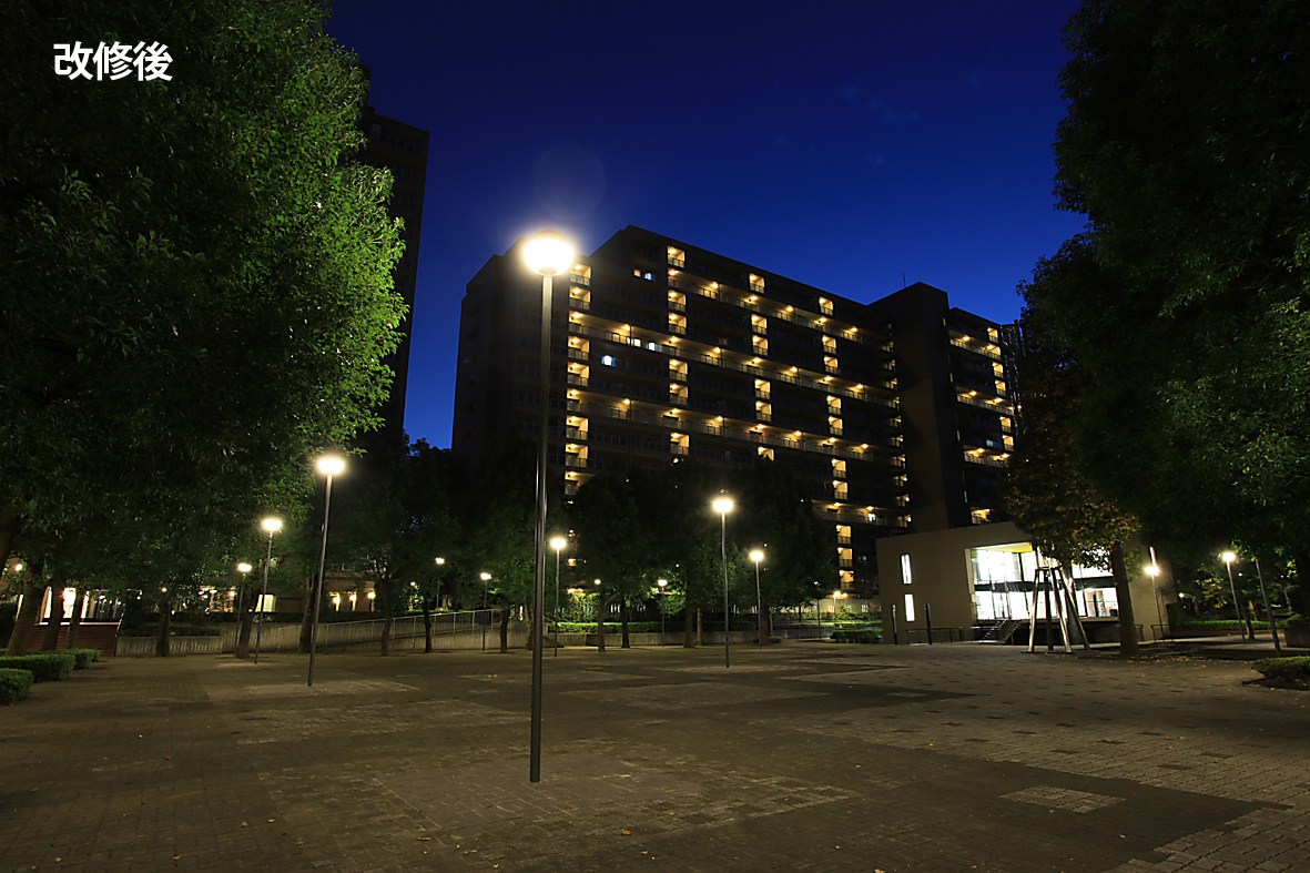 大規模な集合住宅の外構照明のリニューアル計画。設置から約20年以上経過した外構照明は現在の照明基準から考えると暗く、防犯・安全面での不安と、器具の老朽化が懸念されていた。弊社はコンサルタントとしてプロジェクトに参加し、現状の問題点の調査・分析、適切な光源の選定・器具の配置等のアドバイス、改修計画案の策定、住民との協議、施工監理等を行った。イニシャル・ランニングコスト削減のため、長寿命・高効率のコンパクトメタルハライドランプ、無電極ランプを採用し、従来の照明器具よりも少ない灯数でありながら、従来以上の明るい夜の景観を実現した。 試算によると従来に比べ電気代・年間のCO2排出量共に約1/2に削減できる見込みとなっている。(1年後の竣工検査ではほぼランニングコストの目標値が達成された事が確認されました。)