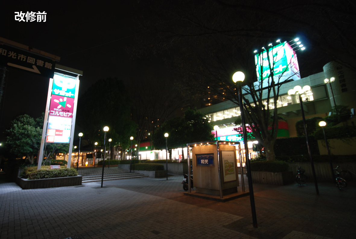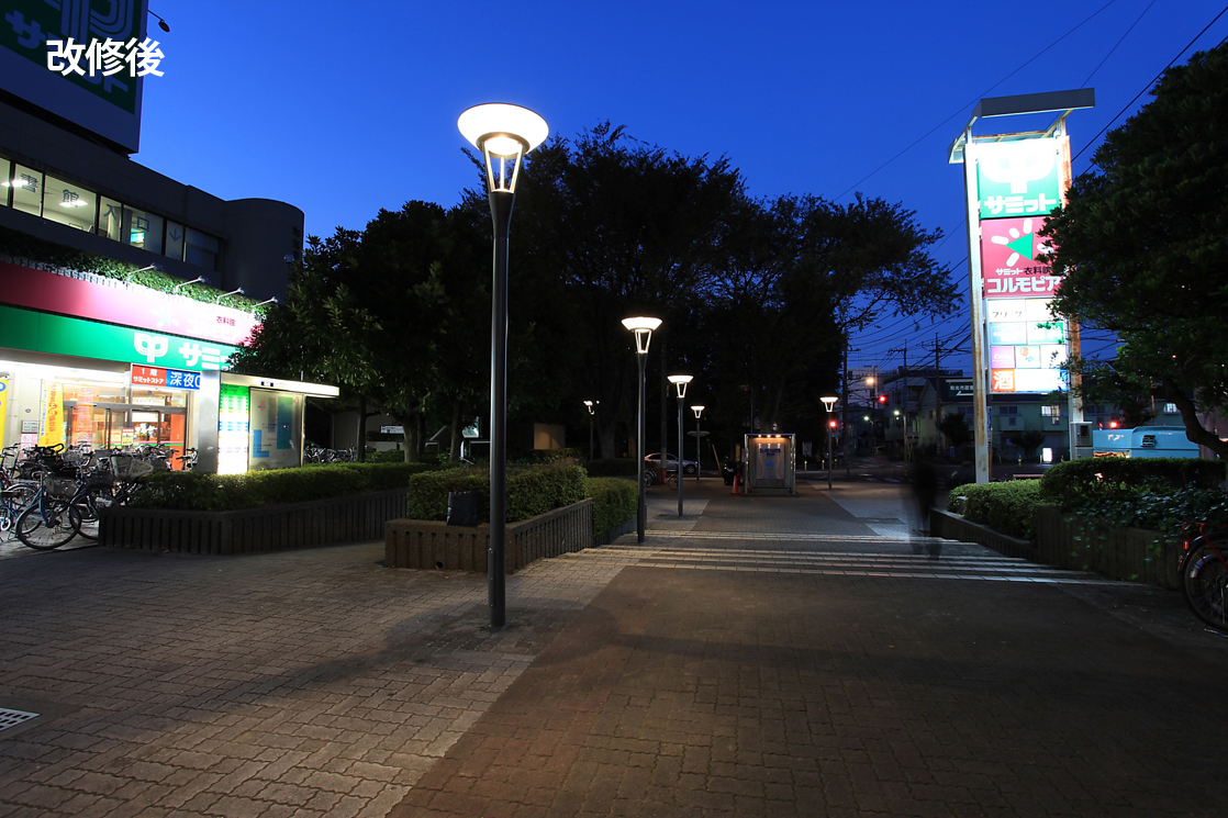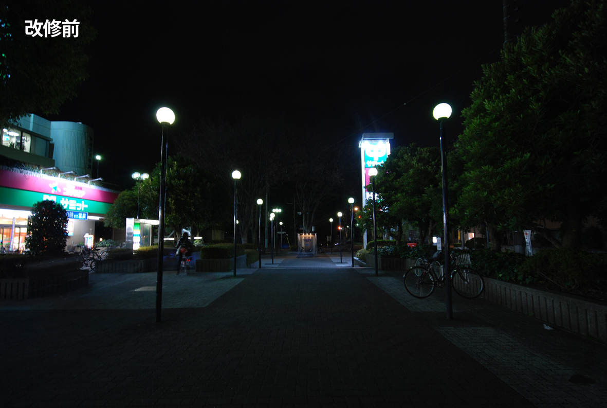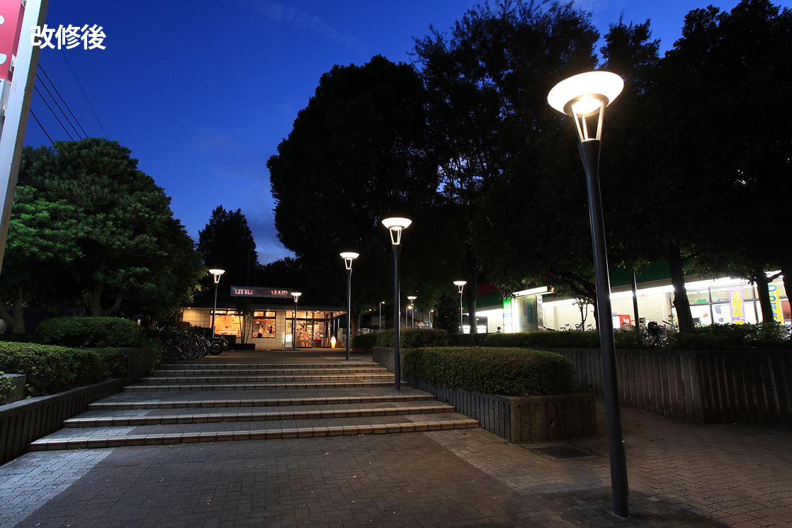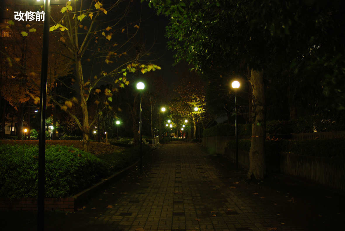 大規模な集合住宅の外構照明のリニューアル計画。設置から約20年以上経過した外構照明は現在の照明基準から考えると暗く、防犯・安全面での不安と、器具の老朽化が懸念されていた。弊社はコンサルタントとしてプロジェクトに参加し、現状の問題点の調査・分析、適切な光源の選定・器具の配置等のアドバイス、改修計画案の策定、住民との協議、施工監理等を行った。イニシャル・ランニングコスト削減のため、長寿命・高効率のコンパクトメタルハライドランプ、無電極ランプを採用し、従来の照明器具よりも少ない灯数でありながら、従来以上の明るい夜の景観を実現した。 試算によると従来に比べ電気代・年間のCO2排出量共に約1/2に削減できる見込みとなっている。(1年後の竣工検査ではほぼランニングコストの目標値が達成された事が確認されました。)