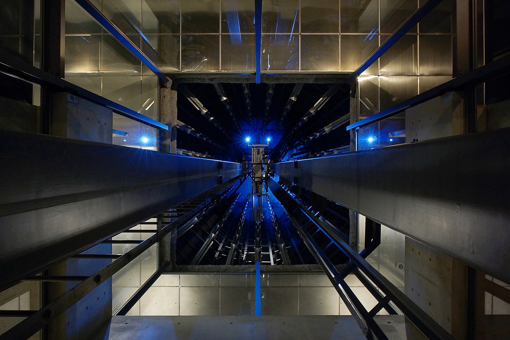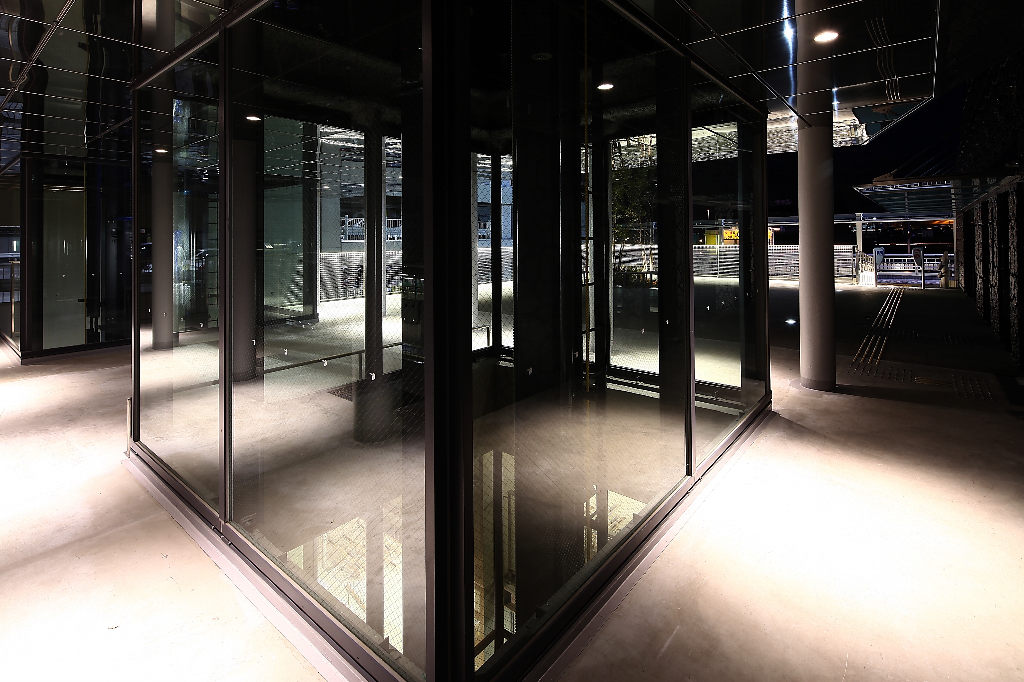 屋上庭園は光の影のコントラストを意識しながら落ち着いた雰囲気のある空間作りを心がけた。機械式駐輪場のエレベターには照明が取り付けられており、自転車が運ばれるたびに光の軌跡が上下に移動する様子も照明の見所の一つである。