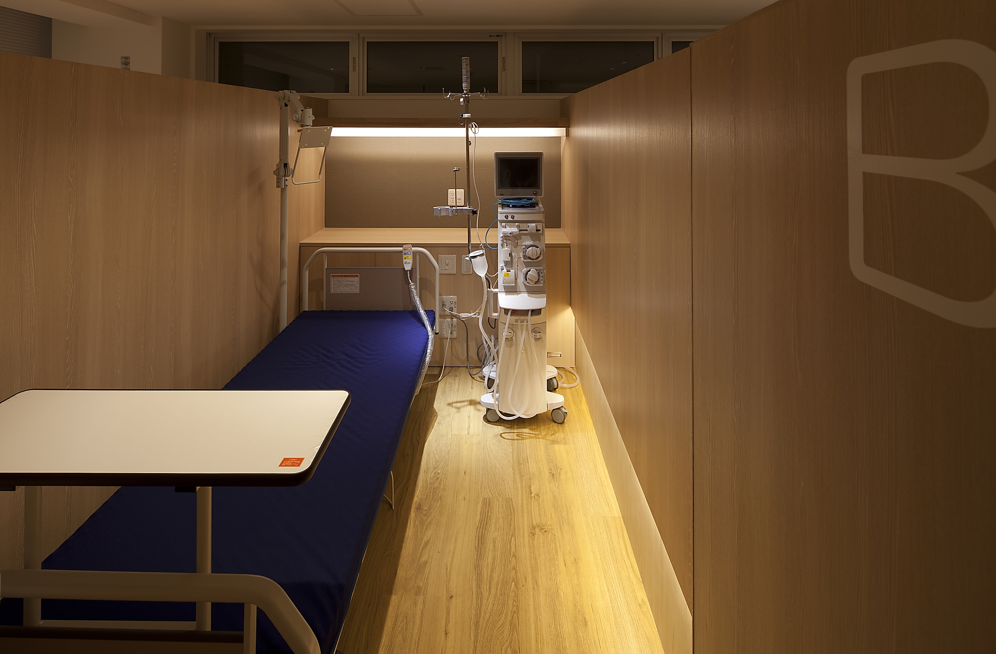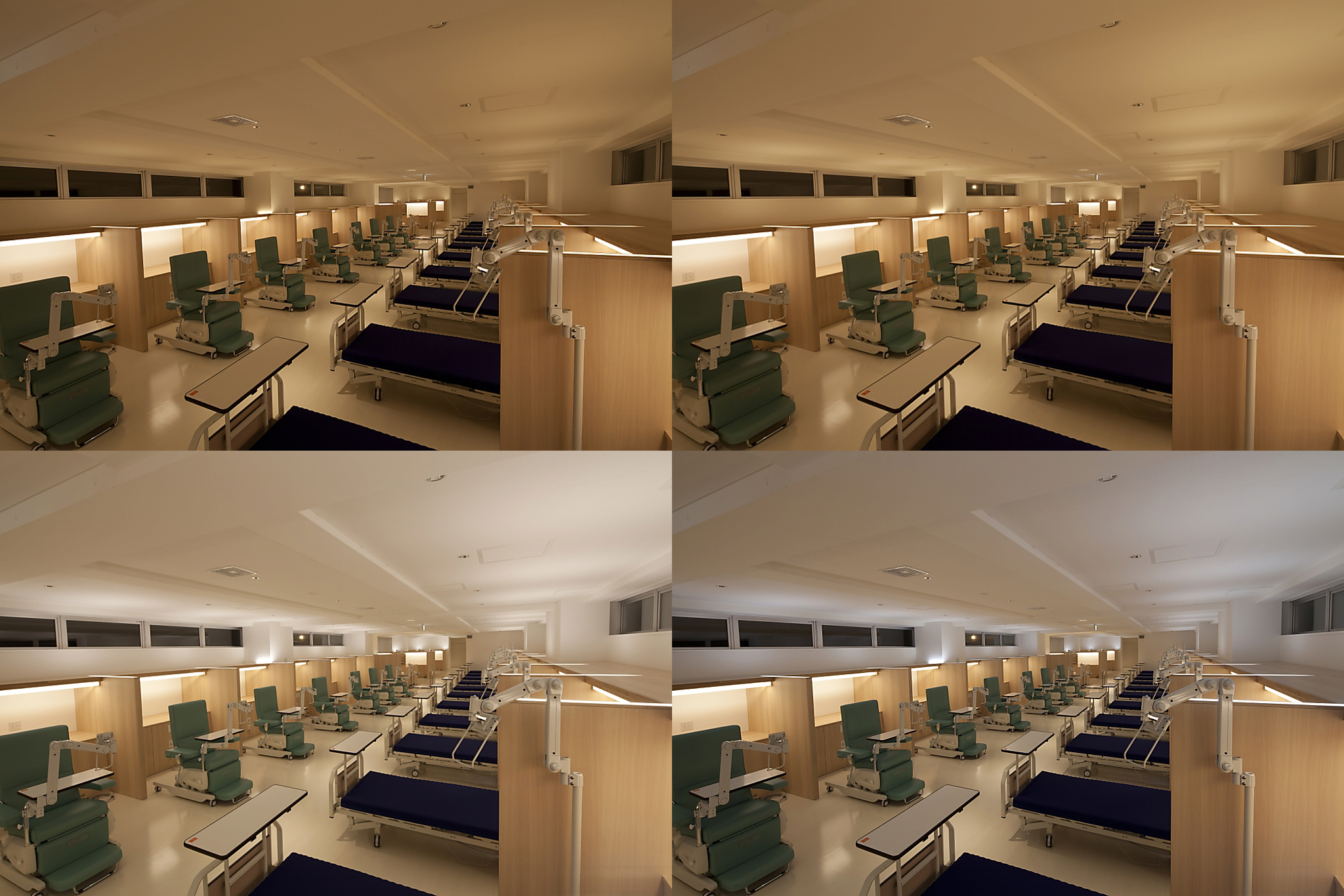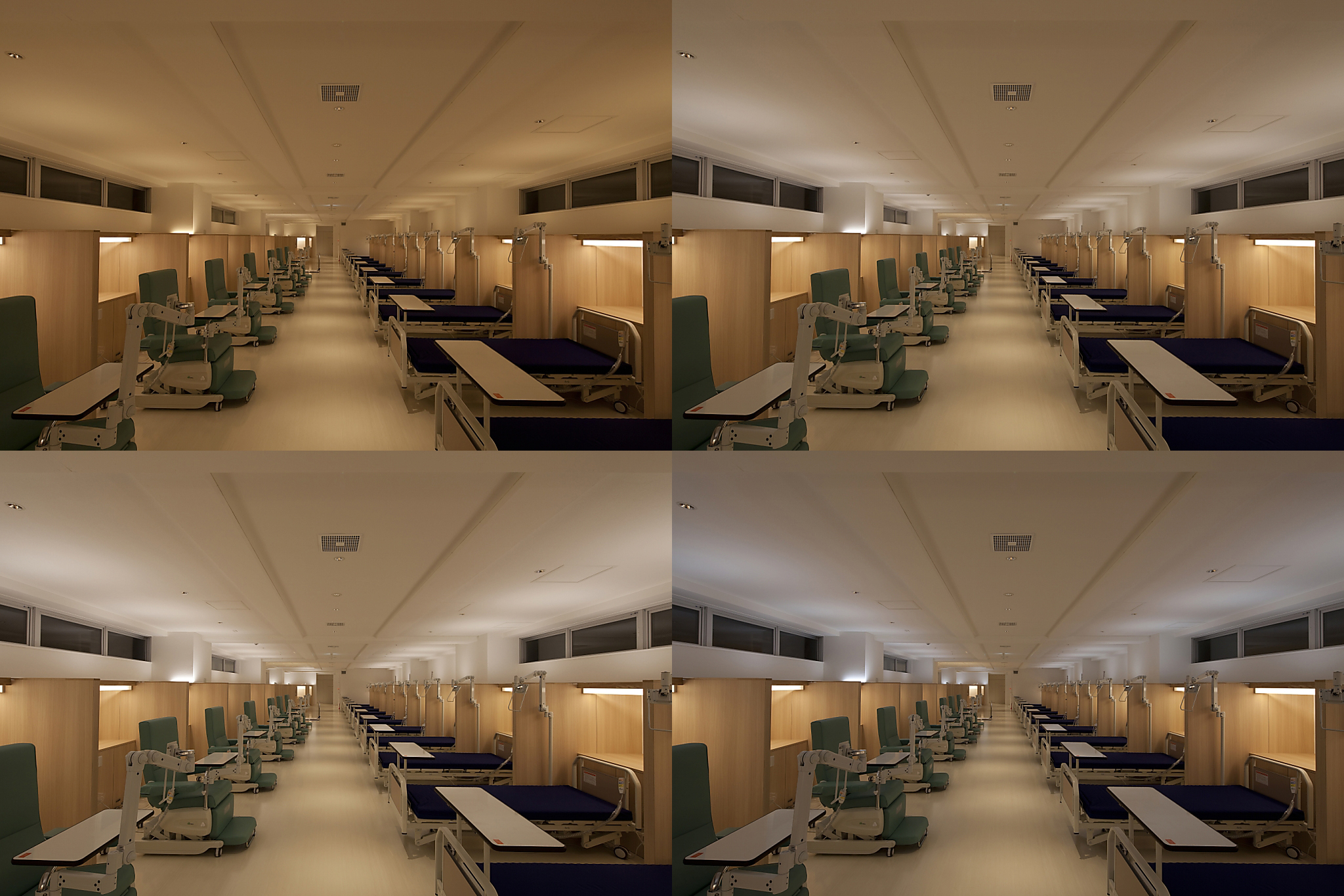 外観は白色のブラインドをLEDの間接照明で下から照らし、日が沈むとやさしい行灯のような光が街に灯る。また透析室では人間の生体リズムに合わせて時間ともに光の色温度を変化させるサーカディアンライティングを取り入れている。患者さんに直接光源が見えないように間接照明で構成された透析室は、午前中は電球色、正午から夕方までは昼白色~温白色、夕方以降は再び電球色へと光の色温度が緩やかに変化する。