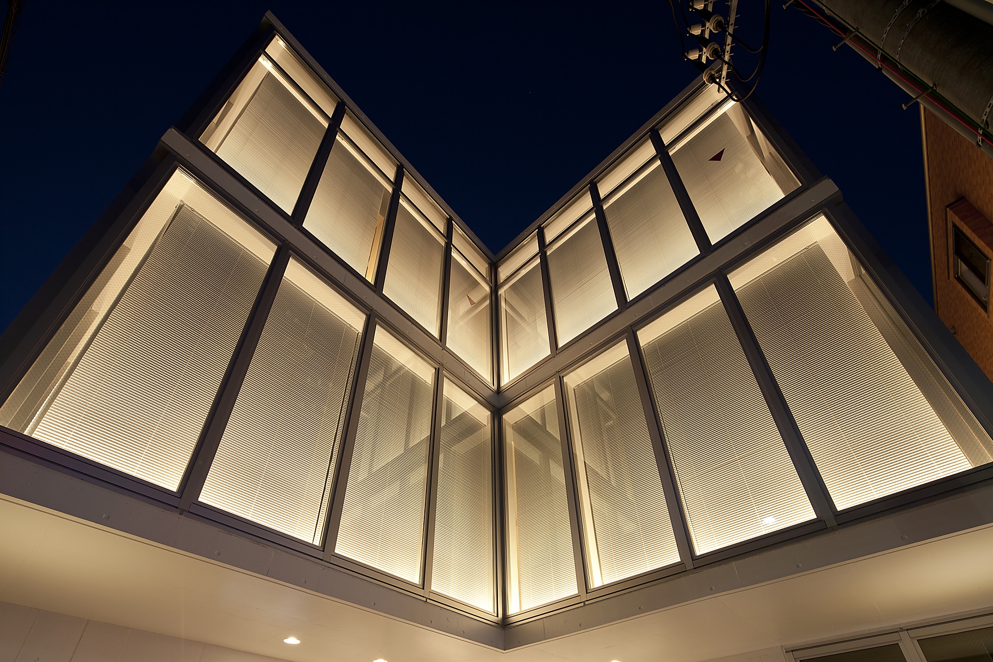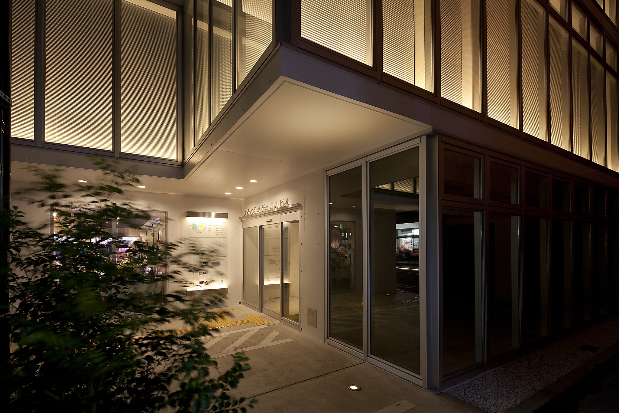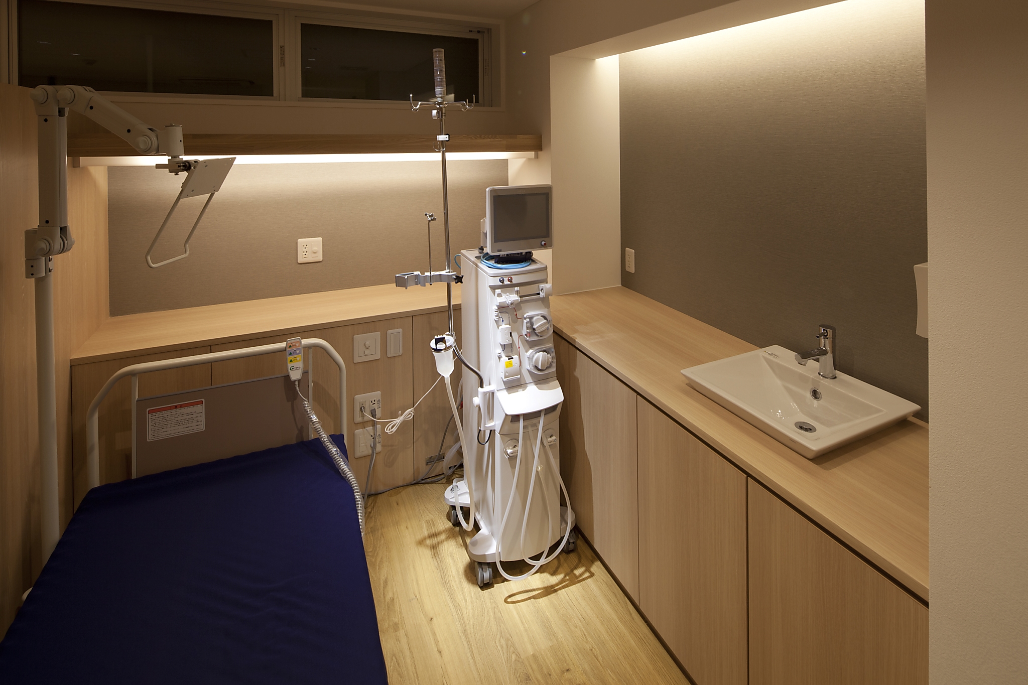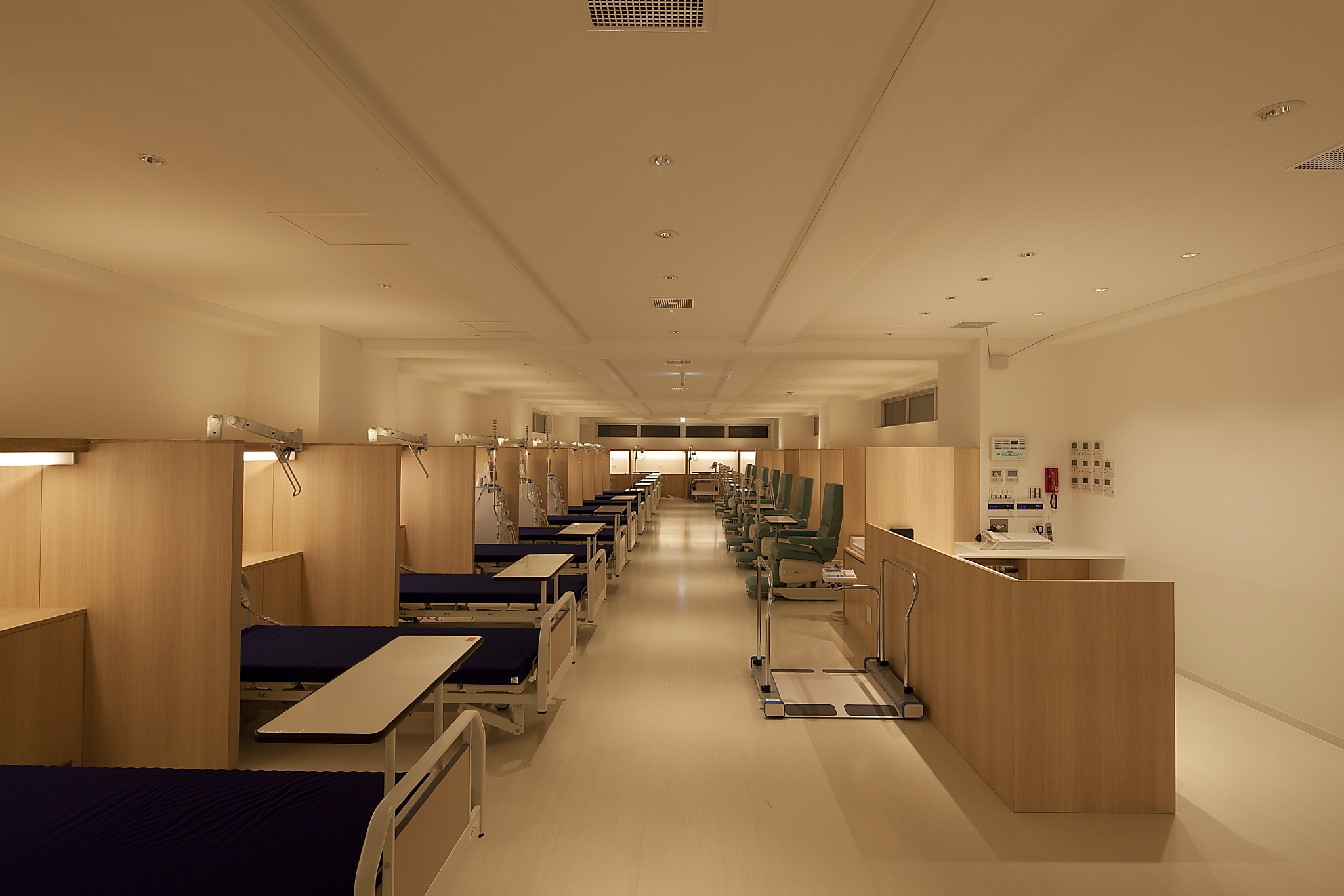 外観は白色のブラインドをLEDの間接照明で下から照らし、日が沈むとやさしい行灯のような光が街に灯る。また透析室では人間の生体リズムに合わせて時間ともに光の色温度を変化させるサーカディアンライティングを取り入れている。患者さんに直接光源が見えないように間接照明で構成された透析室は、午前中は電球色、正午から夕方までは昼白色~温白色、夕方以降は再び電球色へと光の色温度が緩やかに変化する。