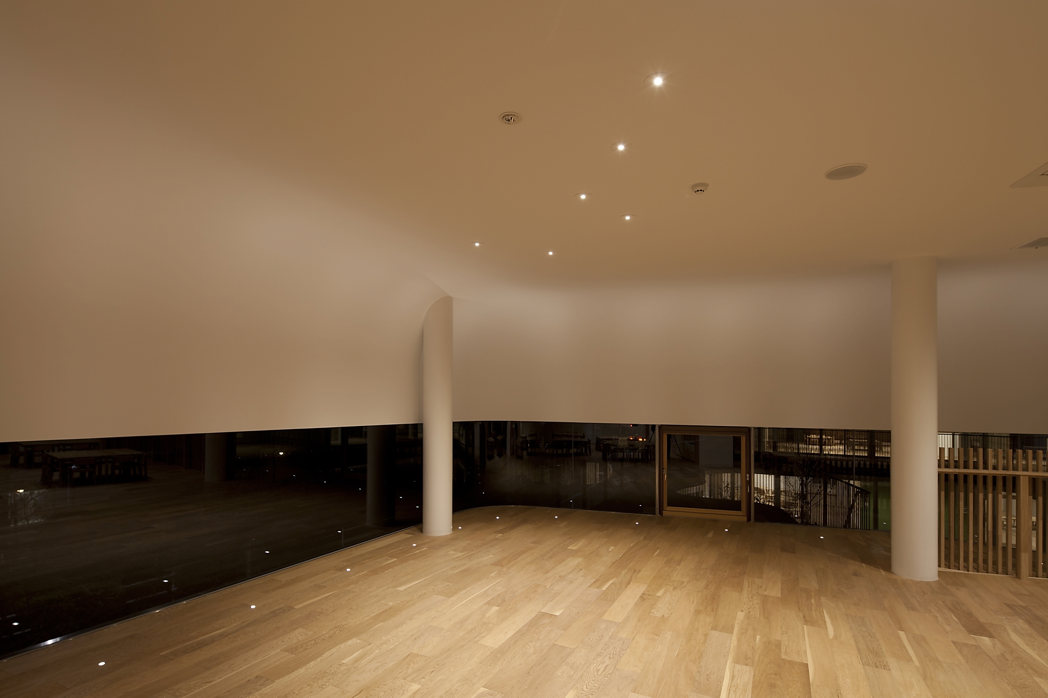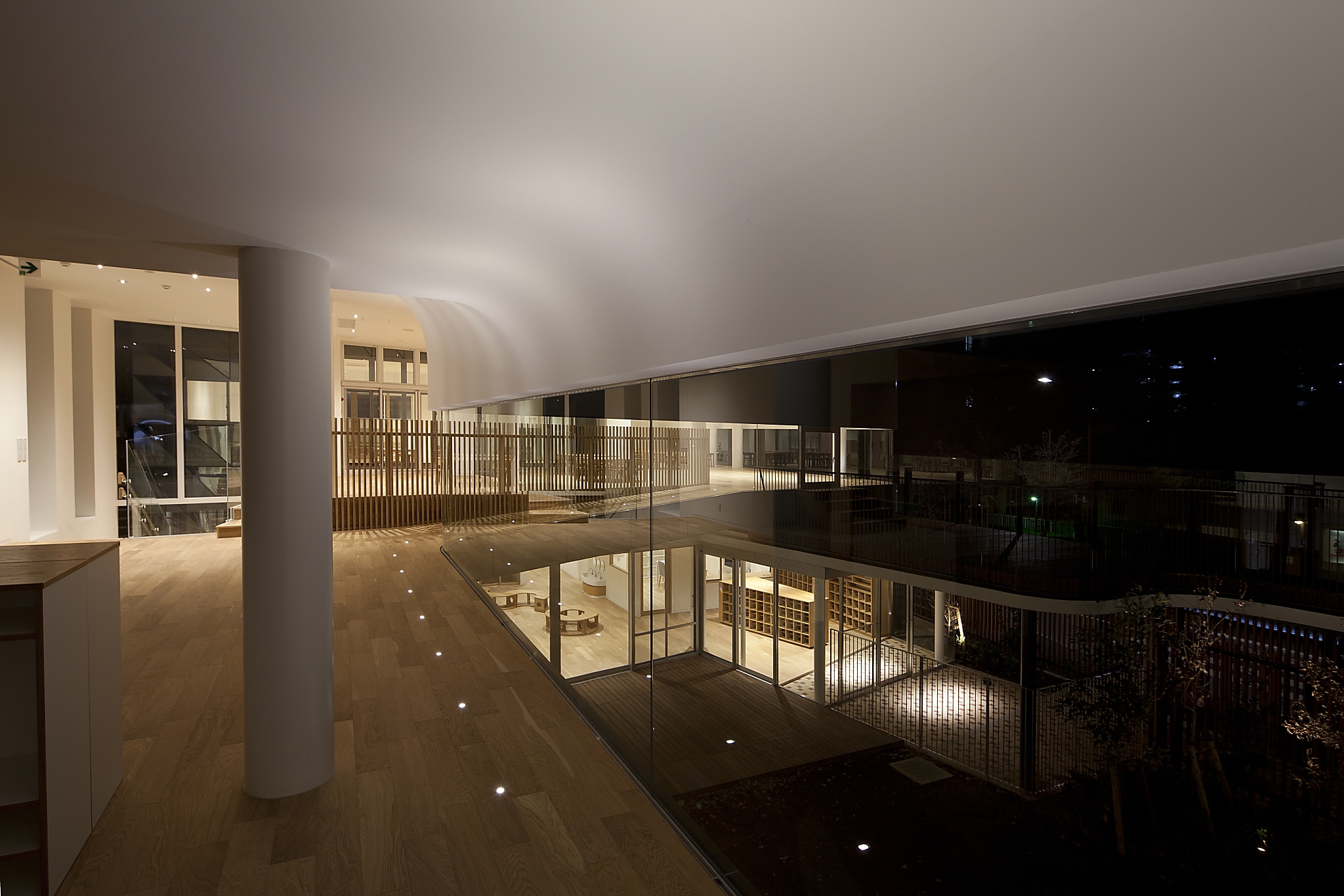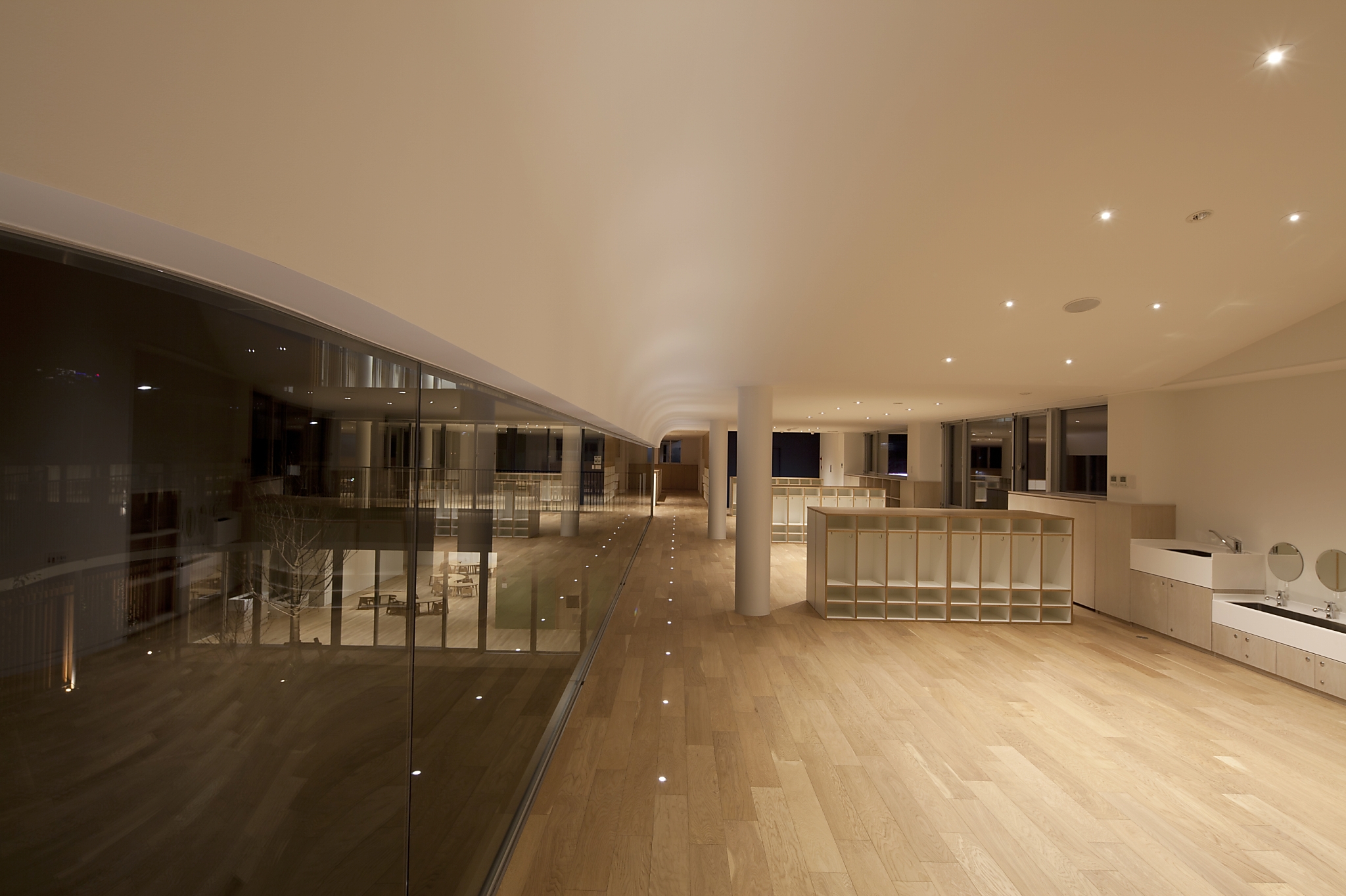 また、本来光の抑揚をつけにくい広角のダウンライトであるが、意図的に配置を集中させることでそれぞれのスペースの主要なエリアに緩やかな光だまりを作り出した。2Fの廊下には極小の床埋め込み照明がリズムよく配置され、R天井を照らすと共に、園児たちの遊び心を誘う。