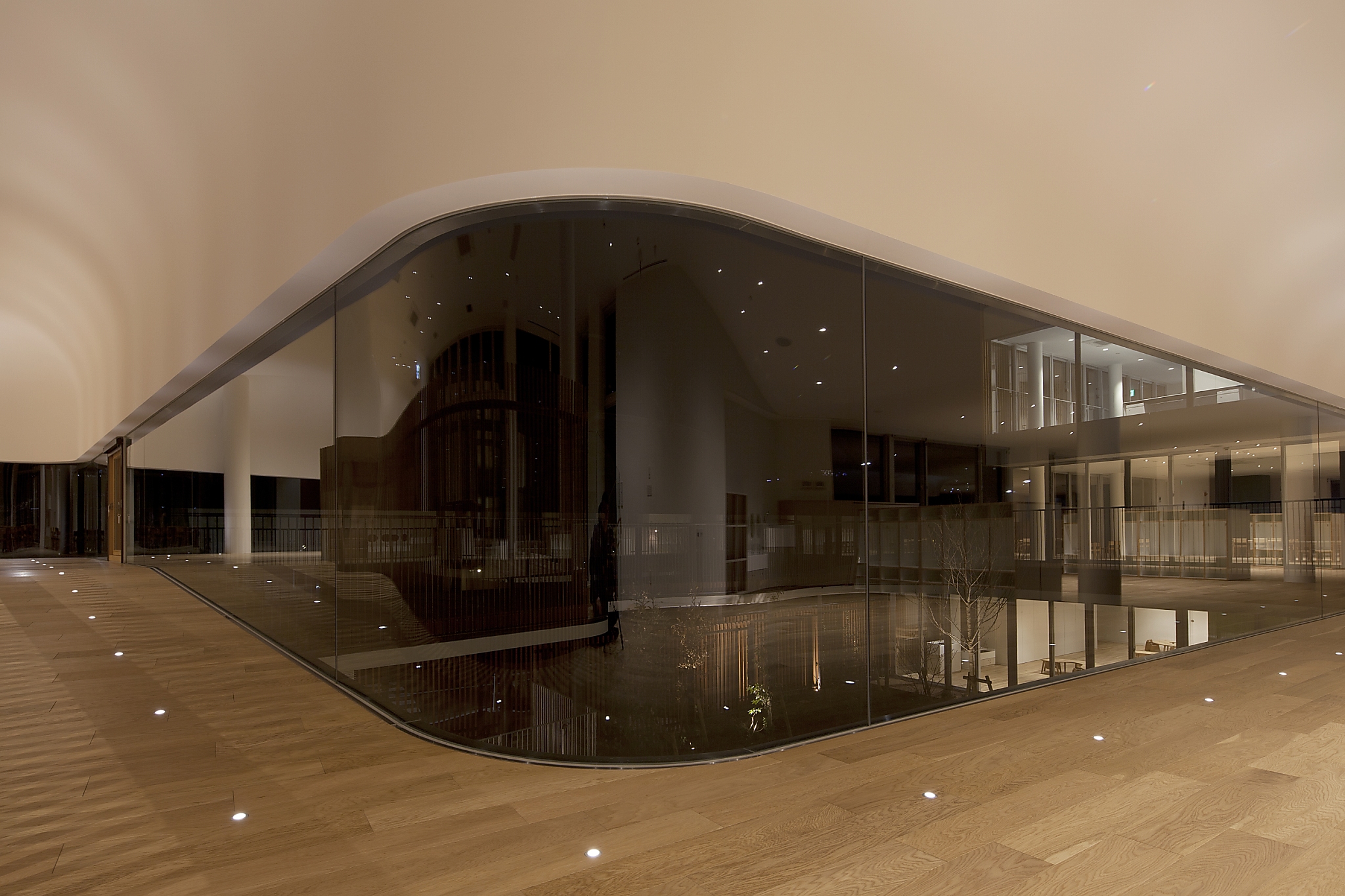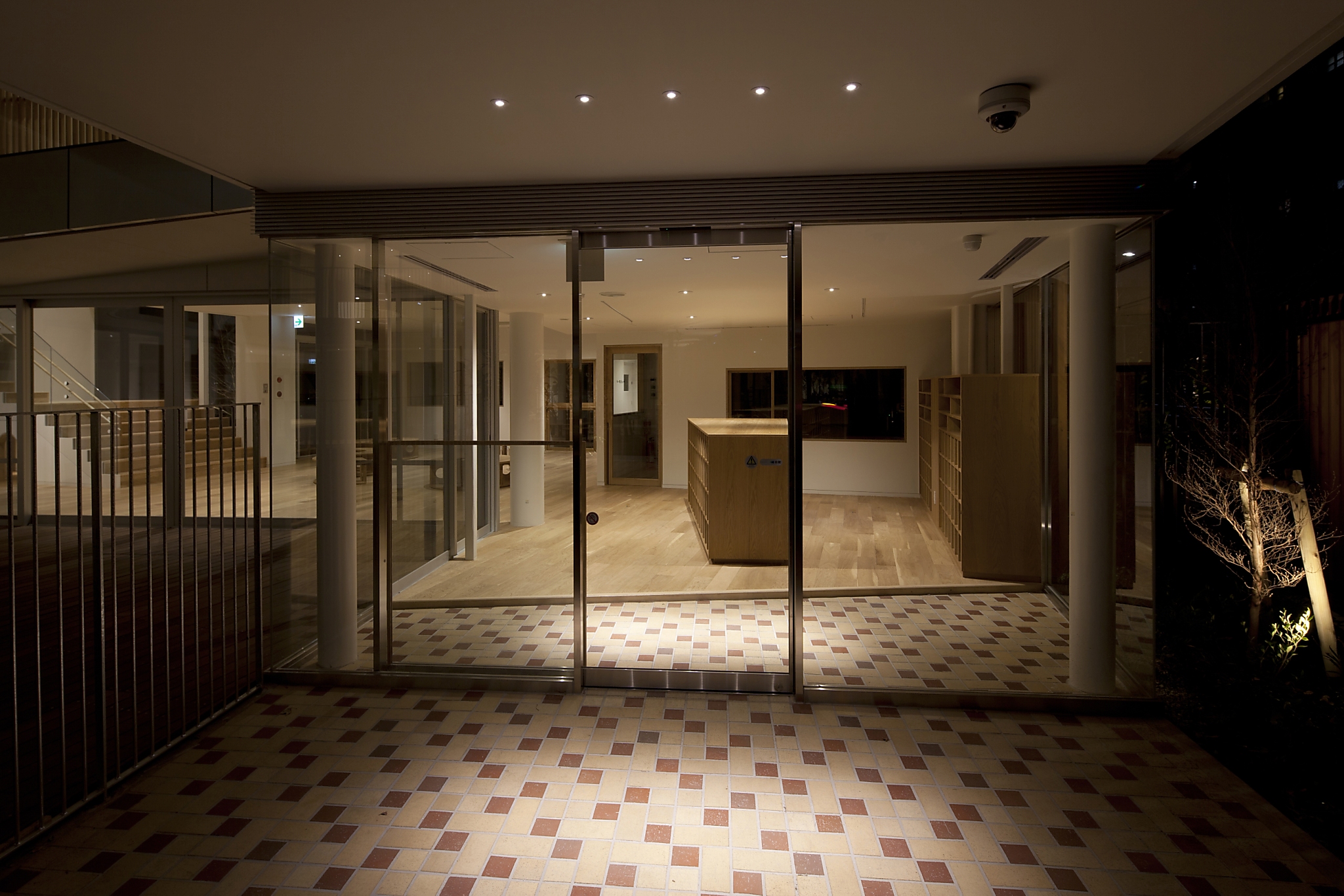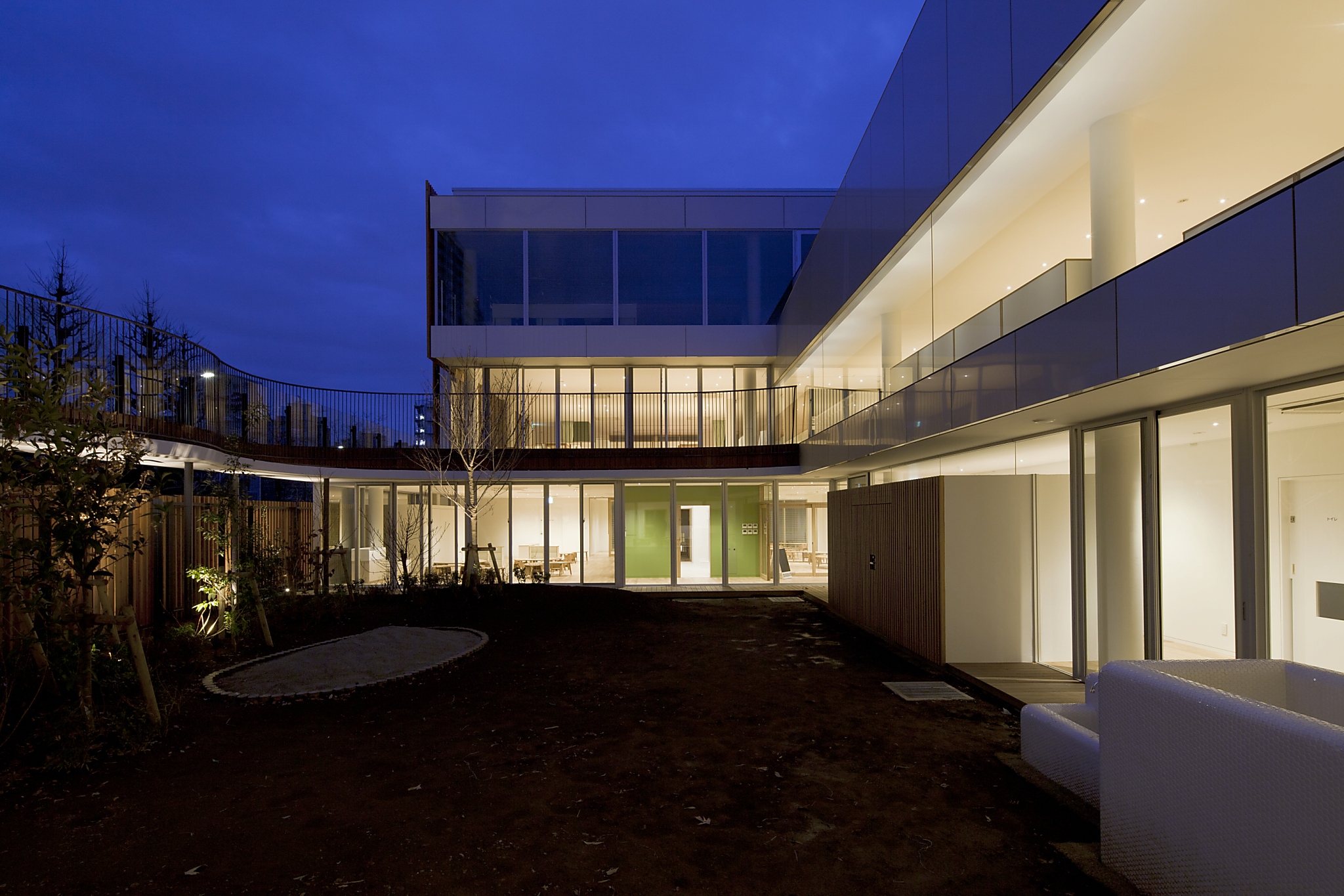 また、本来光の抑揚をつけにくい広角のダウンライトであるが、意図的に配置を集中させることでそれぞれのスペースの主要なエリアに緩やかな光だまりを作り出した。2Fの廊下には極小の床埋め込み照明がリズムよく配置され、R天井を照らすと共に、園児たちの遊び心を誘う。