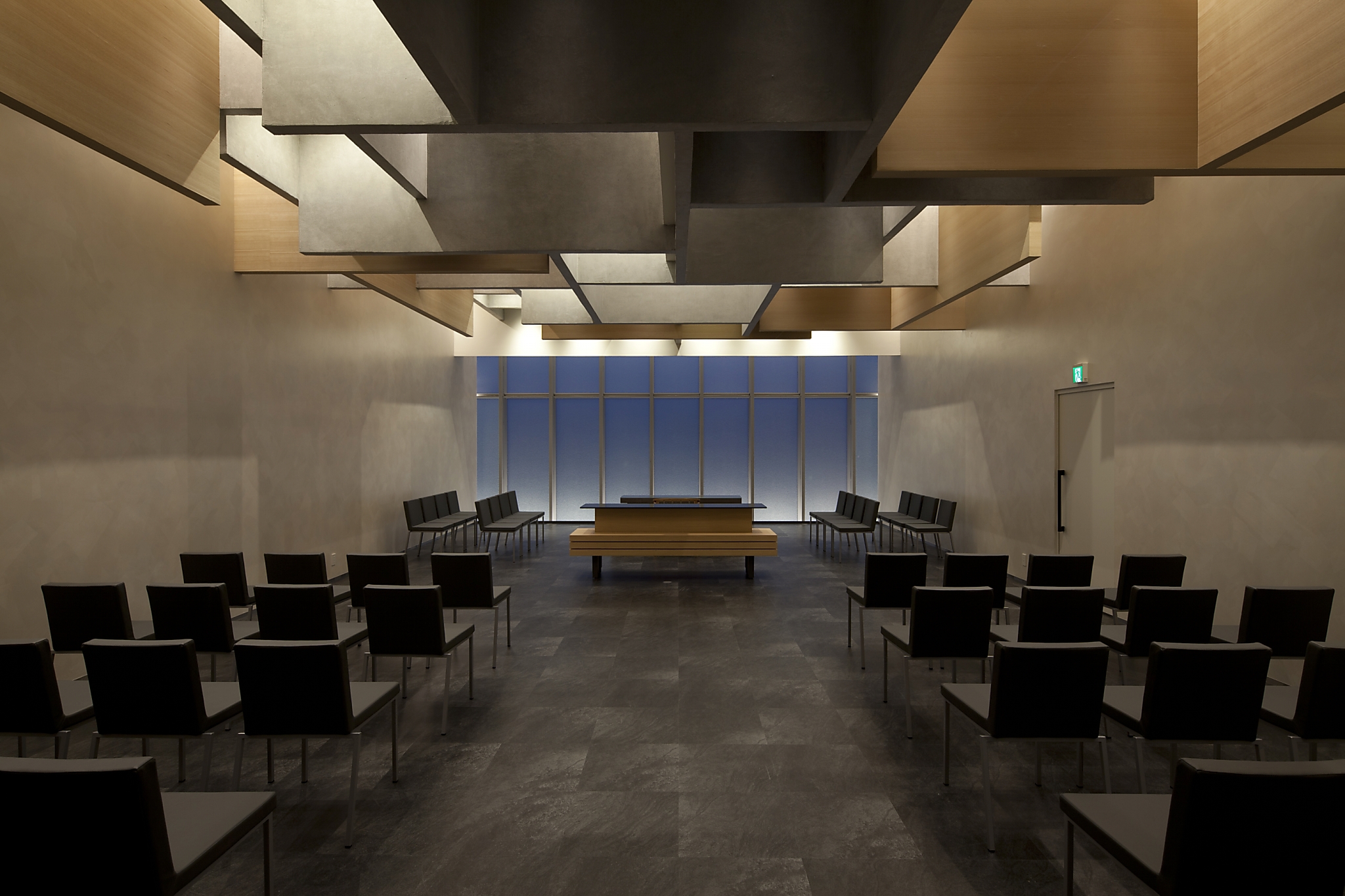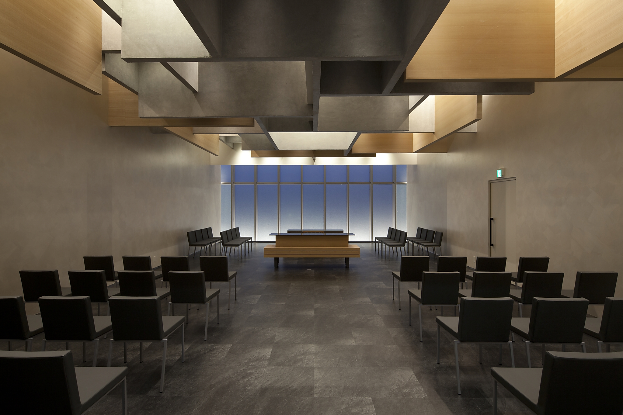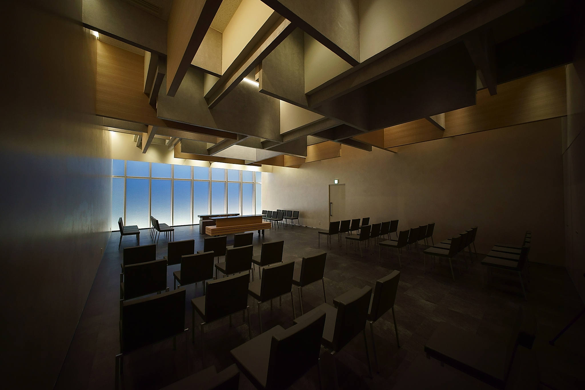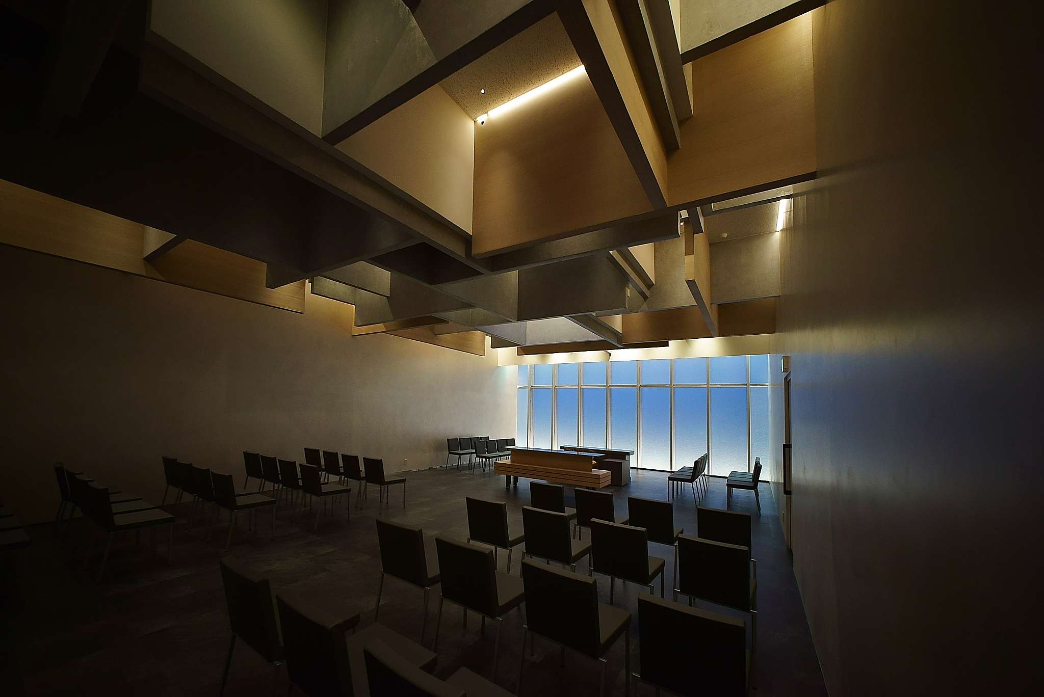 埼玉県にある葬祭場の4階にある式場の照明デザイン提案。特徴的な天井の形状を活かし、極細のLEDライン照明と極小のLEDダウンライトを用いて天井がら心地よい光が降り注いでいるような空間を目指して照明計画を行った。