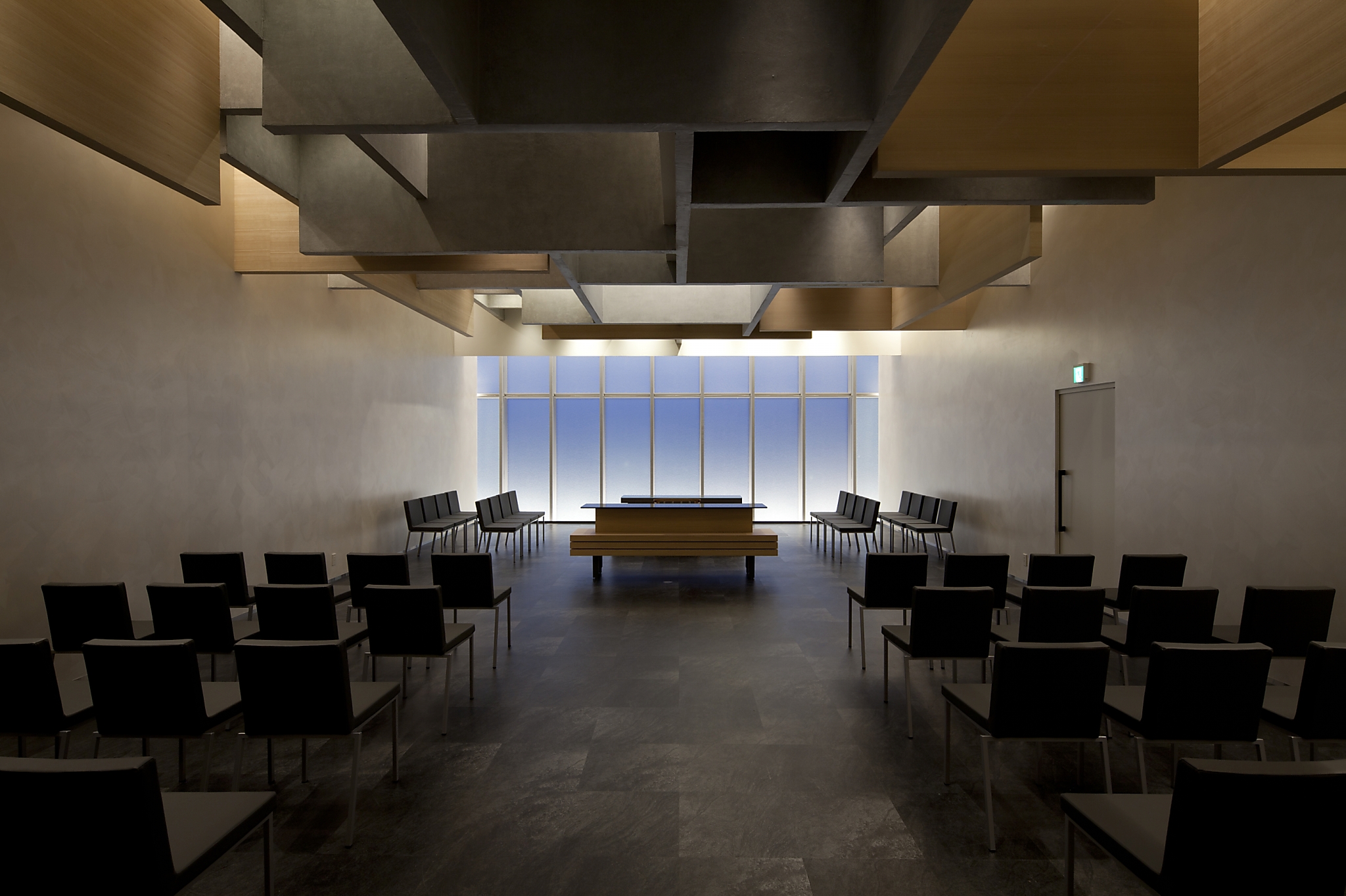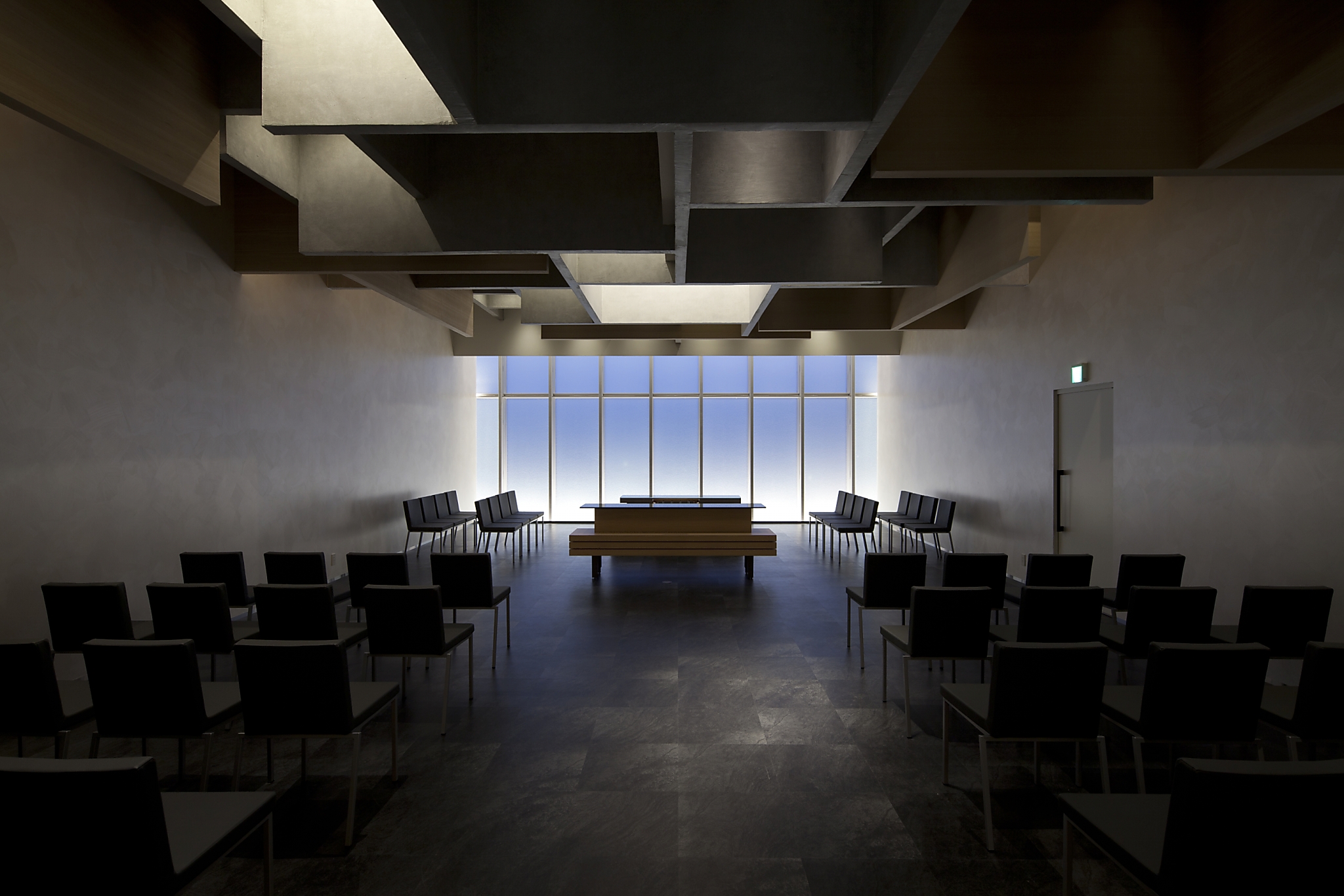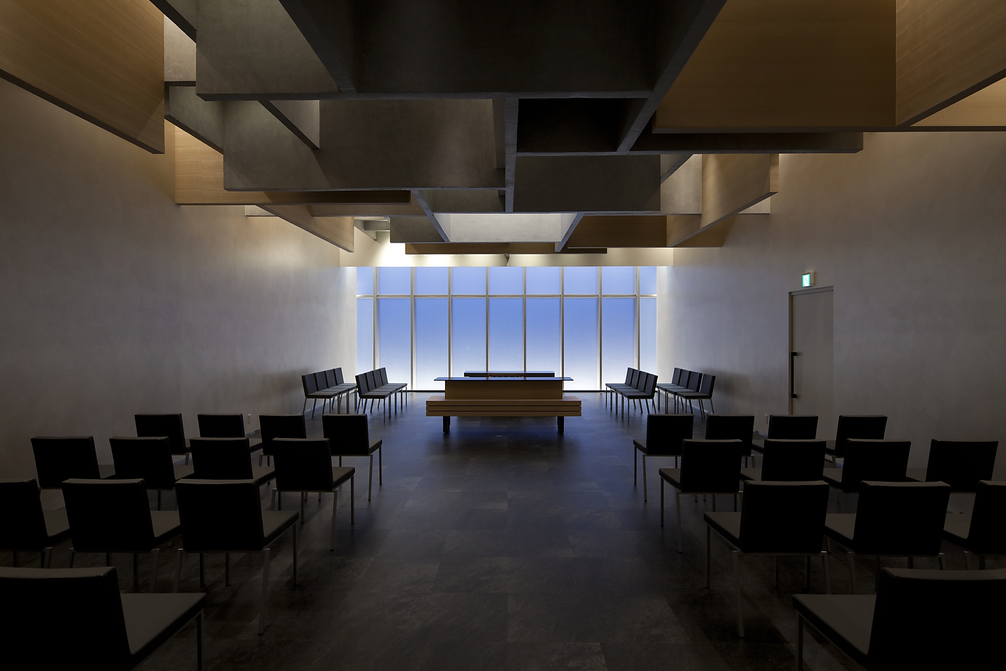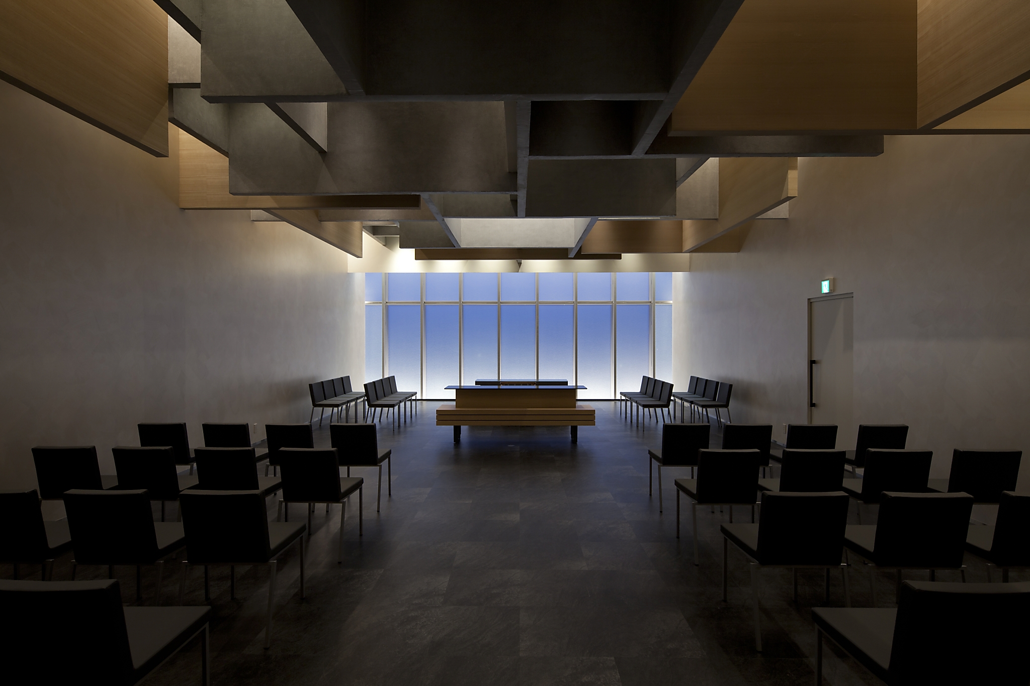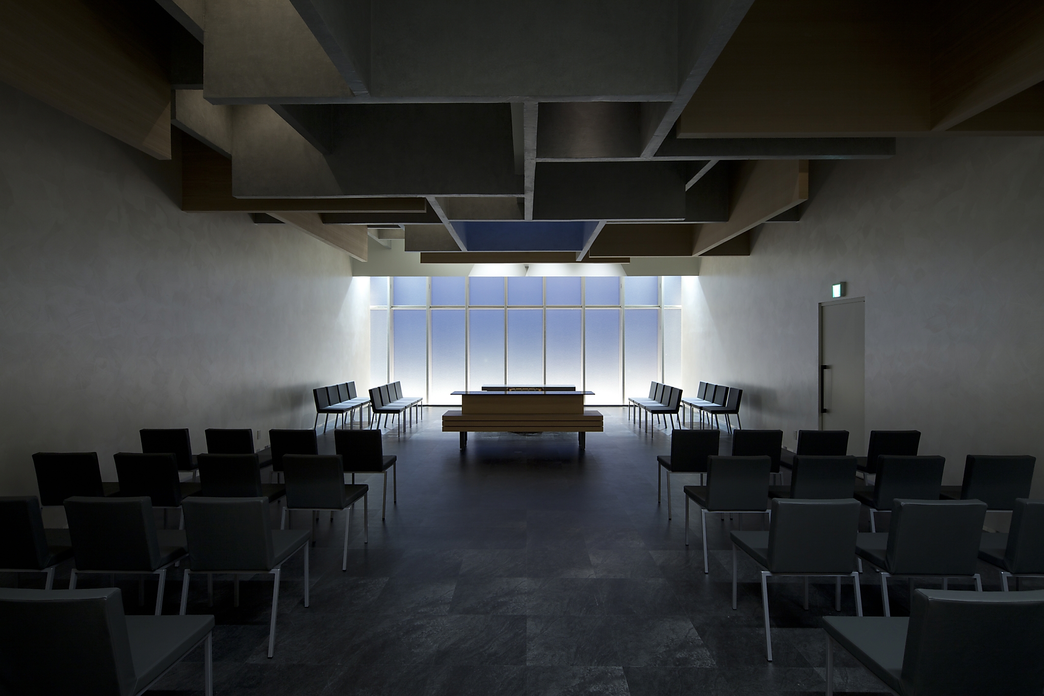 埼玉県にある葬祭場の4階にある式場の照明デザイン提案。特徴的な天井の形状を活かし、極細のLEDライン照明と極小のLEDダウンライトを用いて天井がら心地よい光が降り注いでいるような空間を目指して照明計画を行った。
