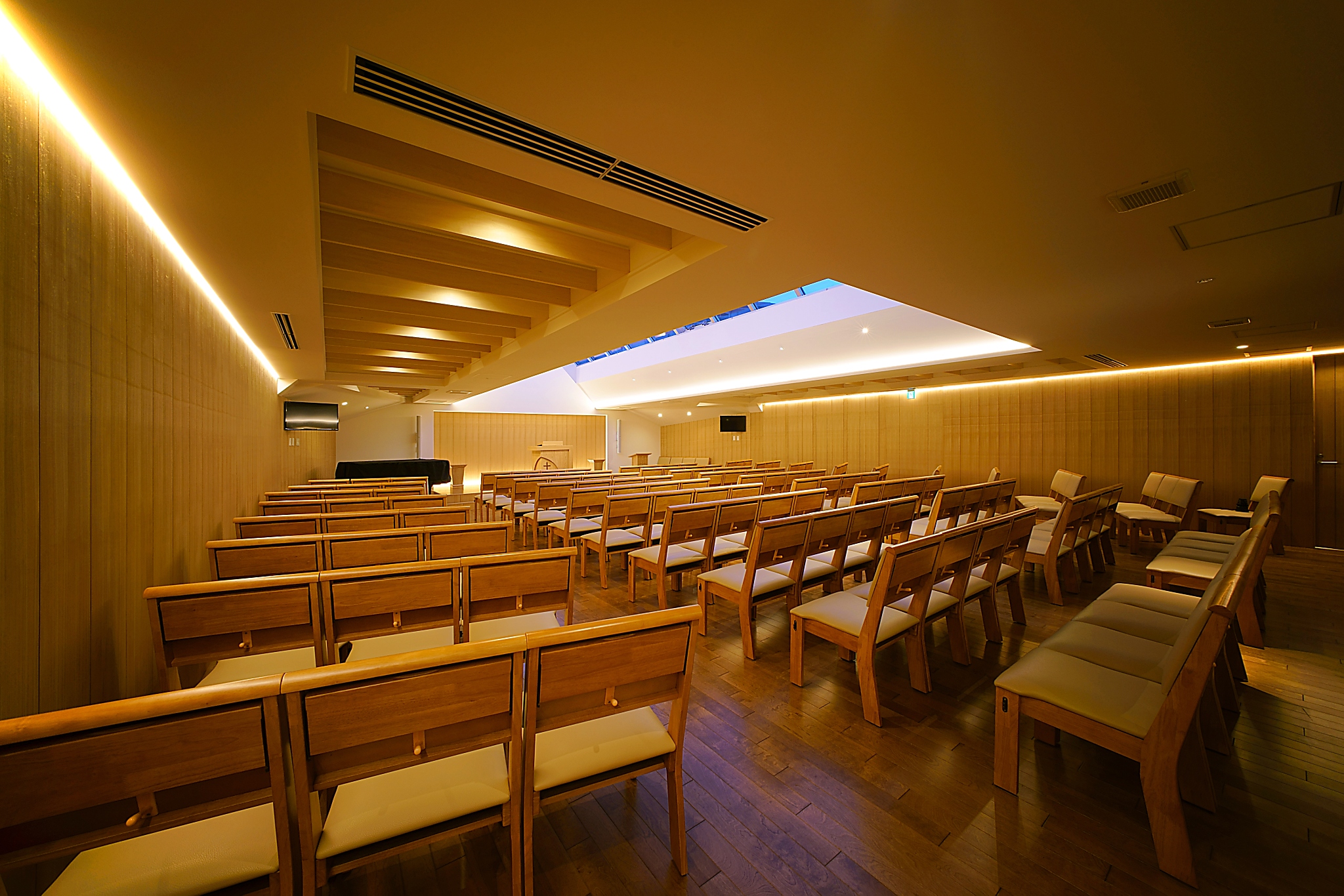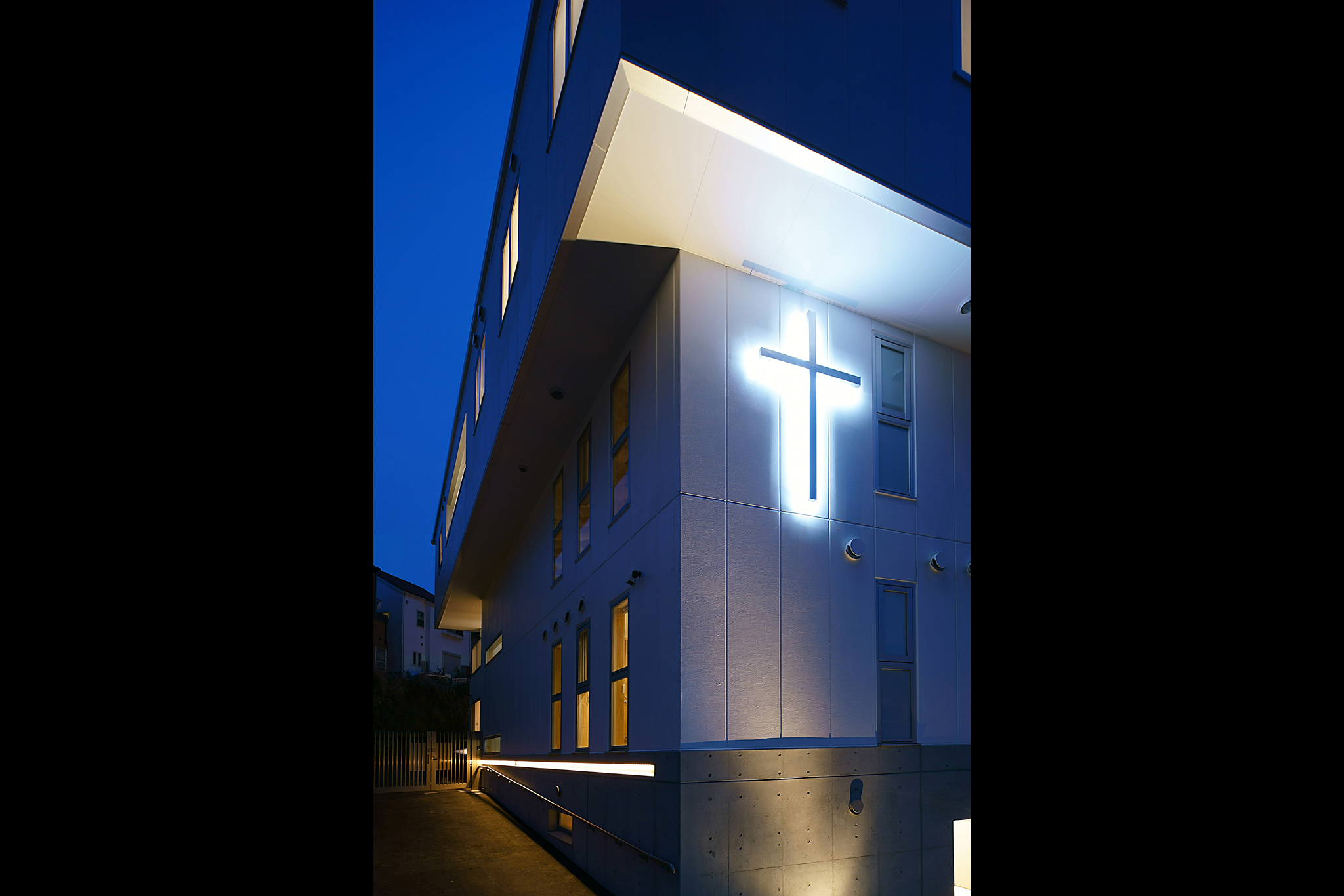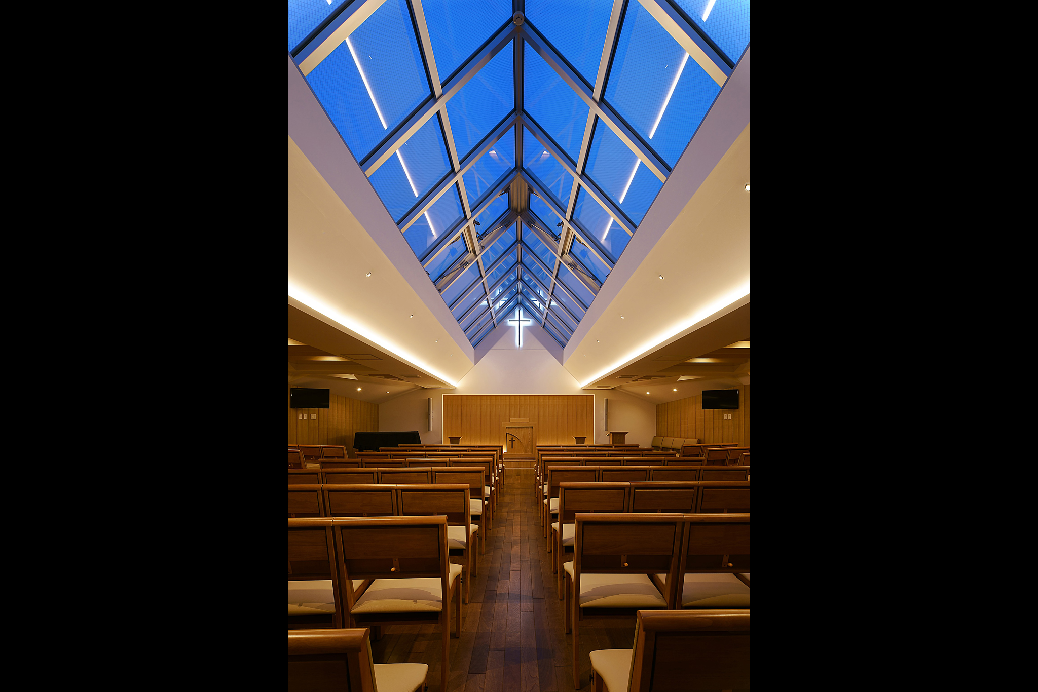 最も象徴的な空間は教会の礼拝堂である。極細のLEDライン照明を間接照明として壁面とトップライトに設け、光のラインで十字架に向かうパースペクティブを強調し、神々しさを感じる光のシーンを作り出すことを心掛けた。日中はトップライトから降り注ぐデイライトが美しく、夜と昼では全く異なる光の表情を楽しむことができる。