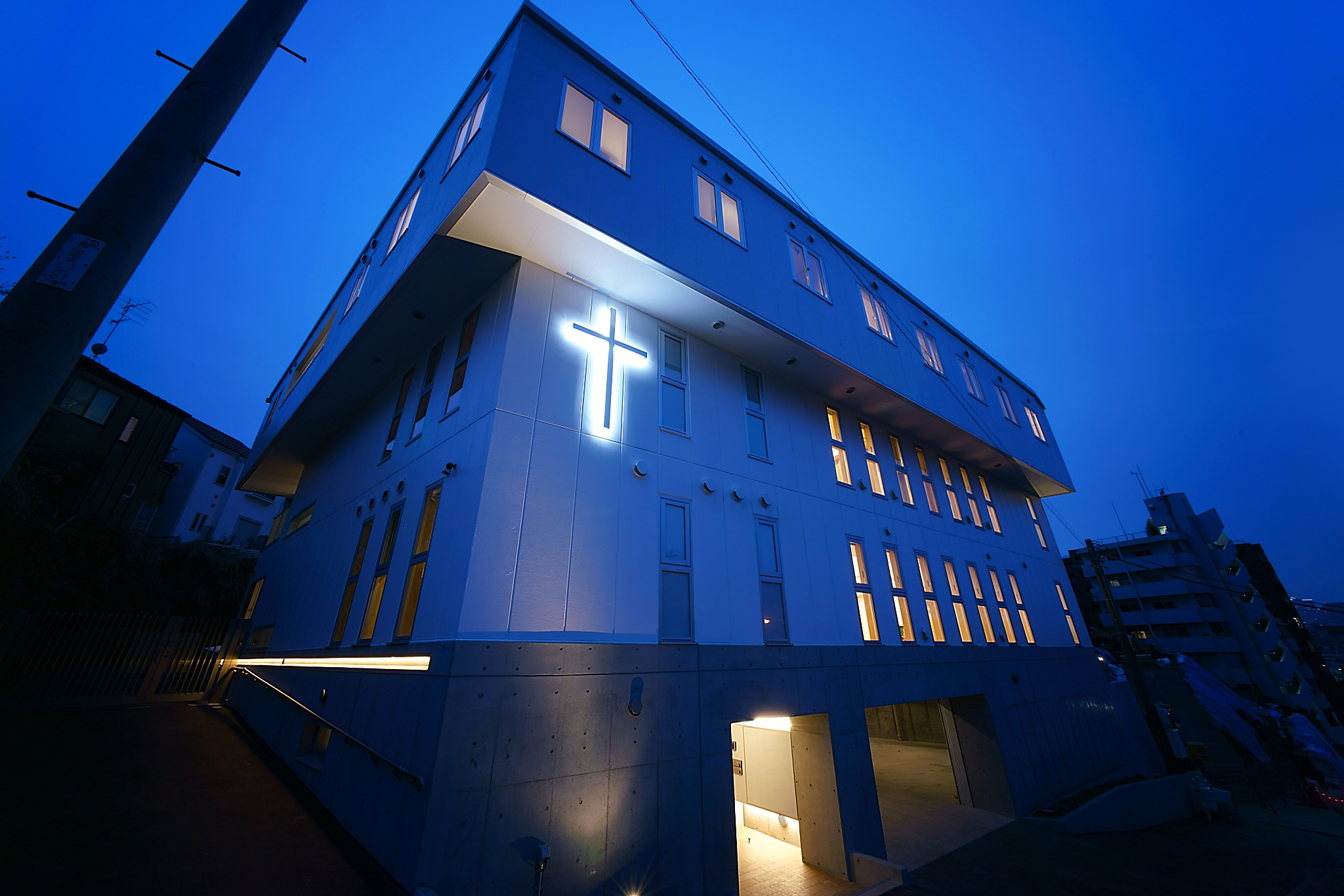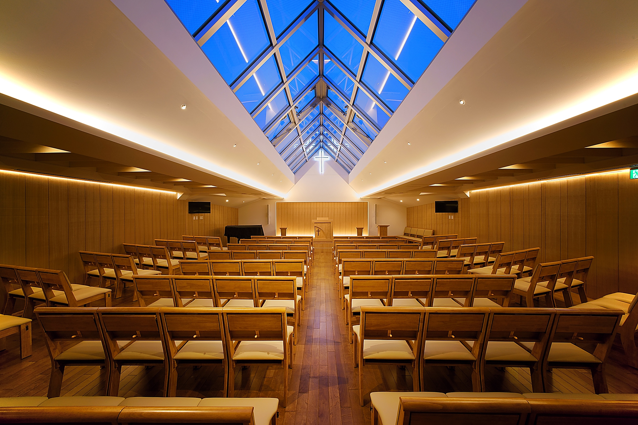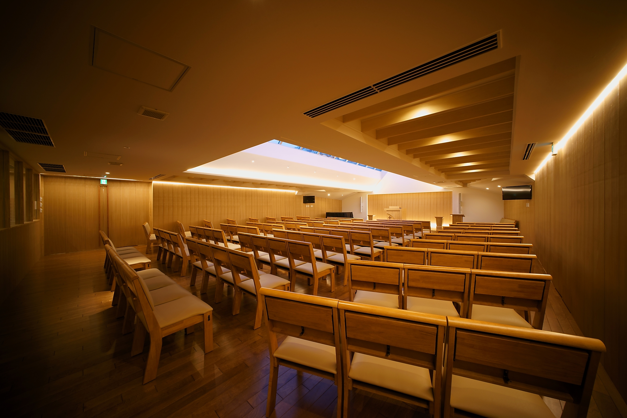 最も象徴的な空間は教会の礼拝堂である。極細のLEDライン照明を間接照明として壁面とトップライトに設け、光のラインで十字架に向かうパースペクティブを強調し、神々しさを感じる光のシーンを作り出すことを心掛けた。日中はトップライトから降り注ぐデイライトが美しく、夜と昼では全く異なる光の表情を楽しむことができる。