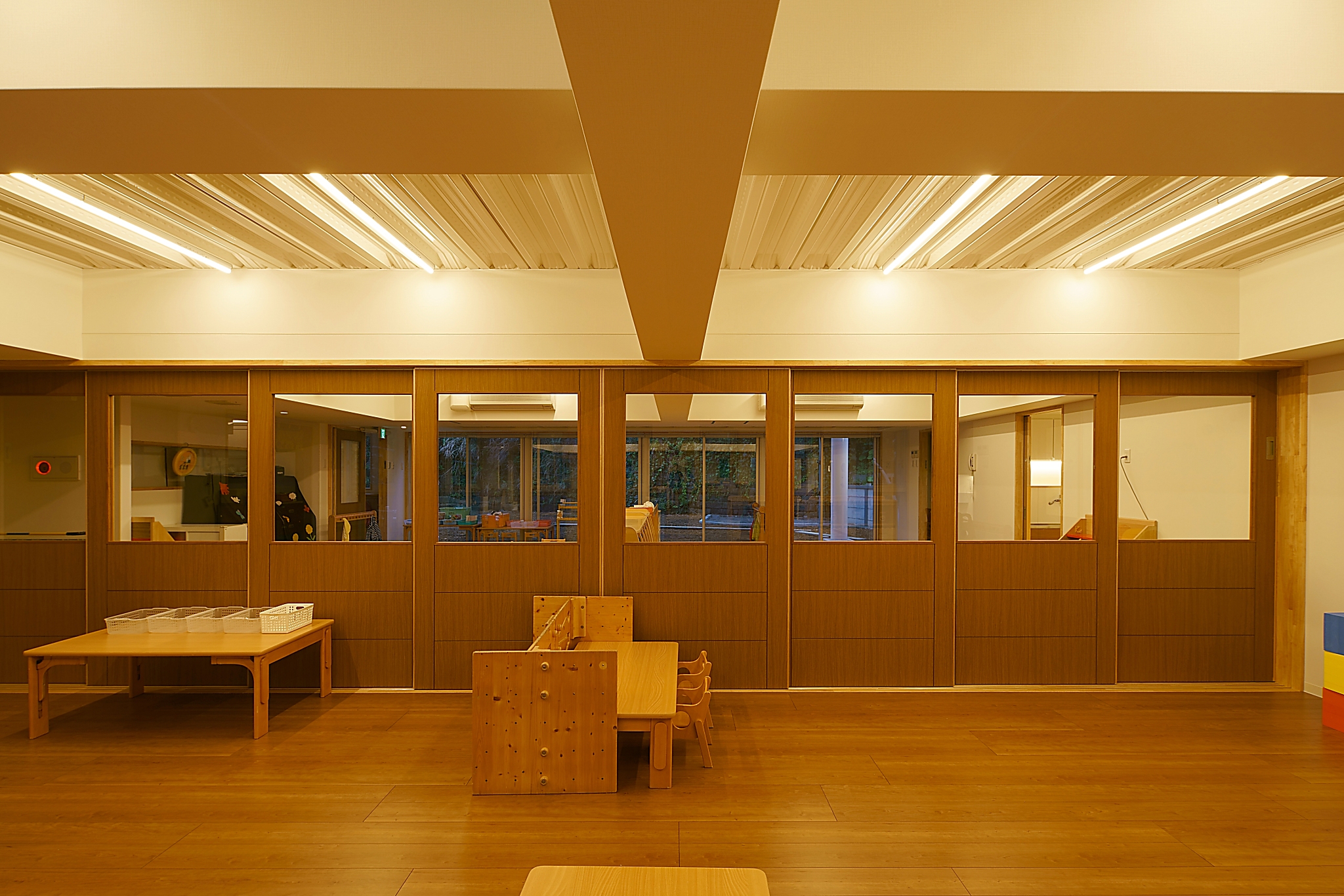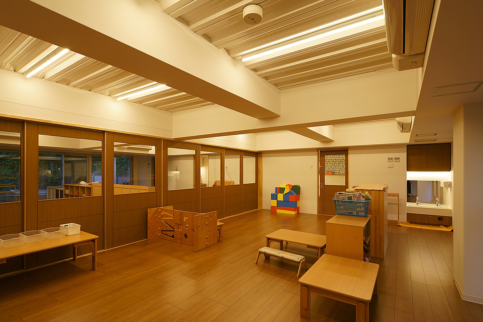 神奈川県横浜市にある保育園と教会の複合施設。保育室は特徴的な凹凸のある天井仕上げのパターンに合わせて効果的にLEDライン照明を配置し、柔らかな拡散光で空間全体を包み込む。