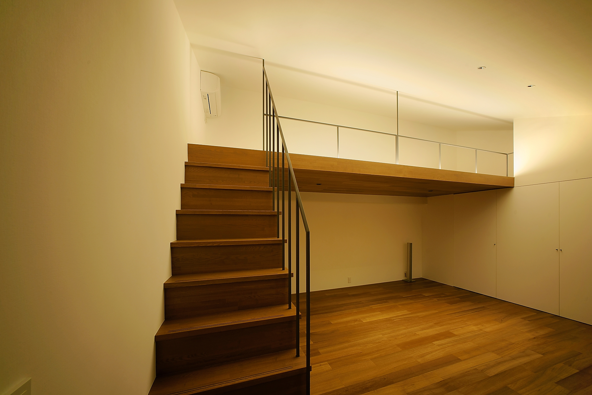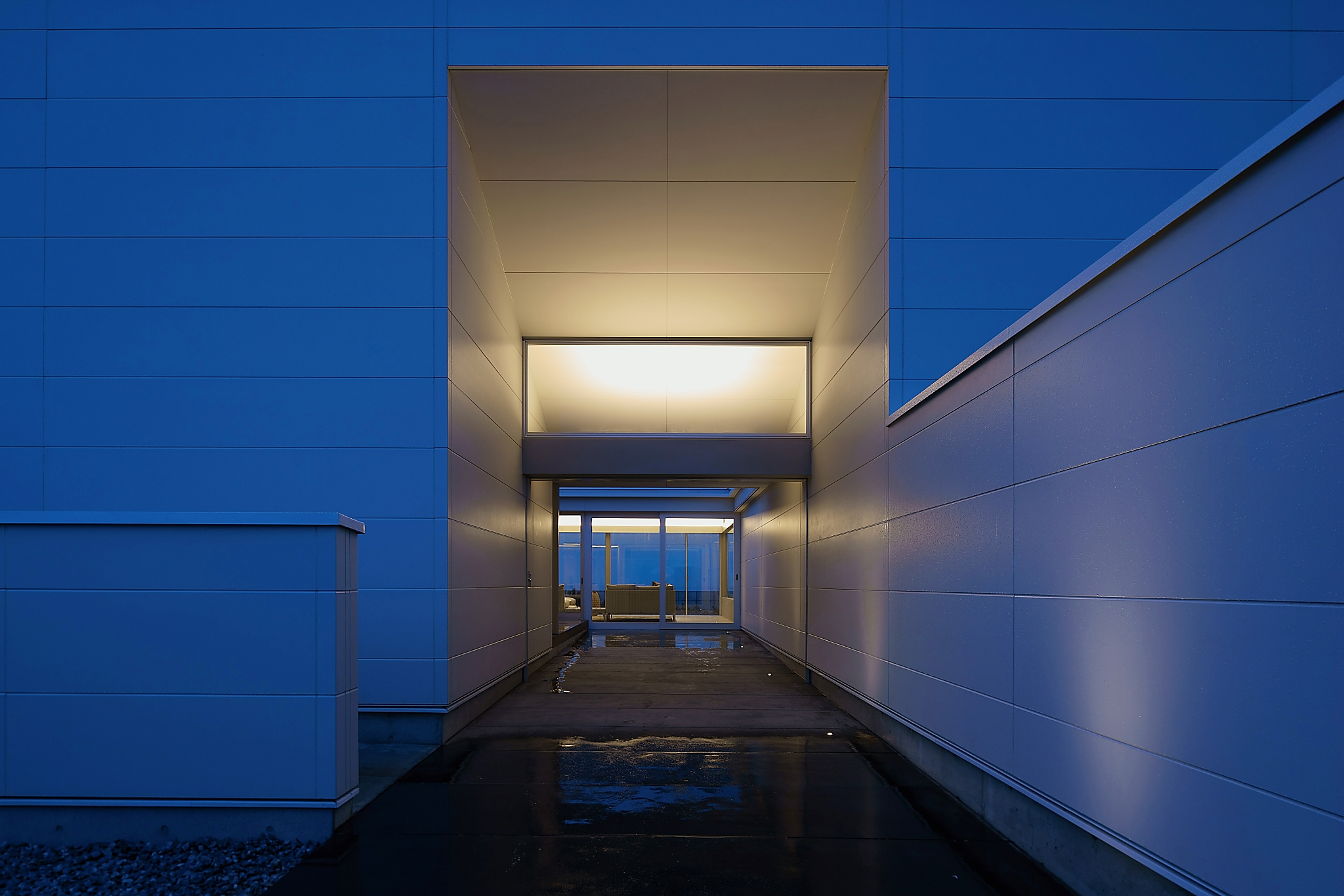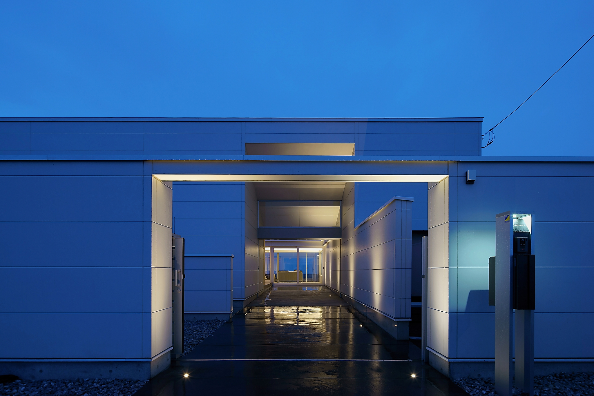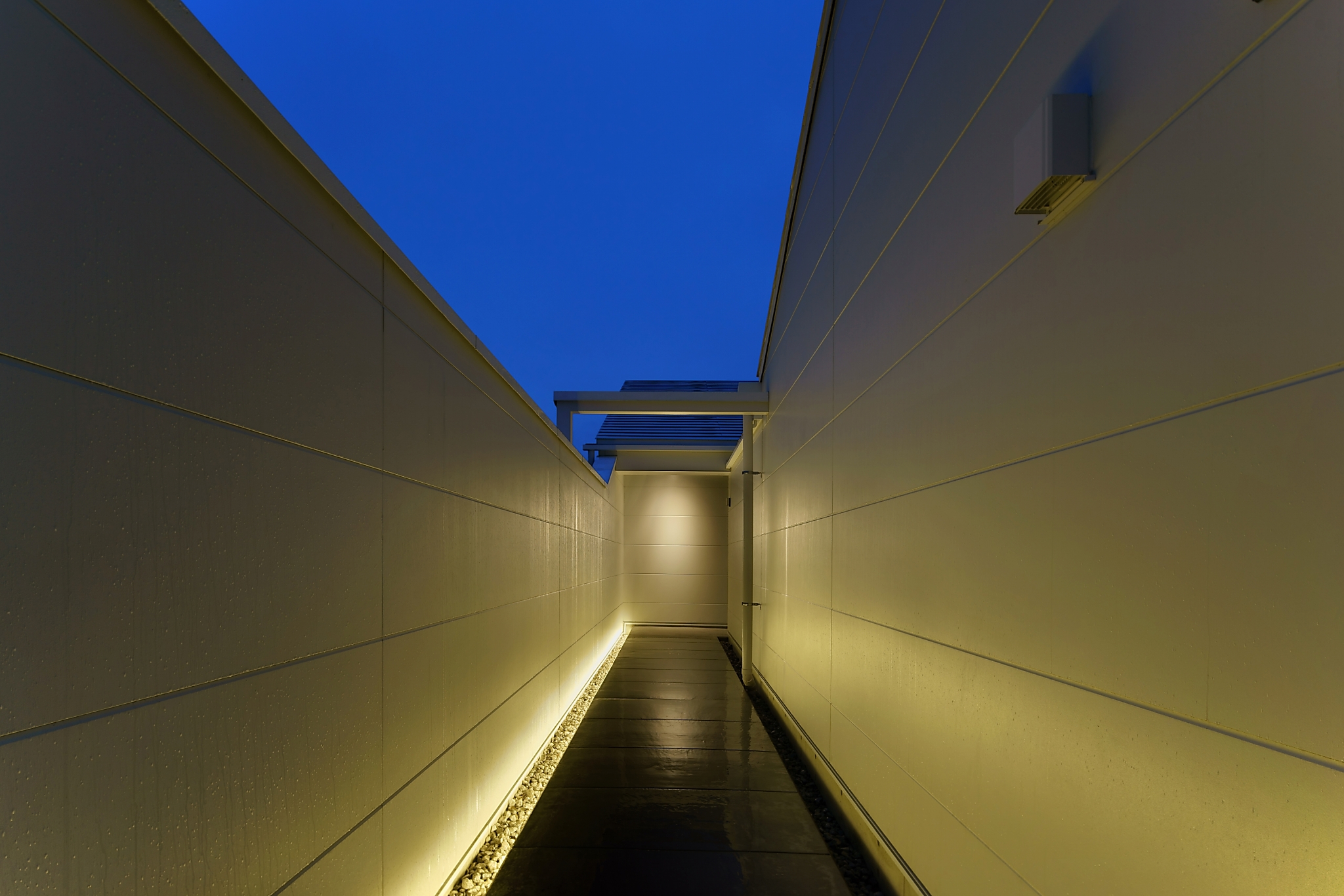 また、屋外では車好きのオーナーのために中庭の駐車スペースに車を導くような極小のアッパーライトによる連続照明を用いたり、長いアプローチのパースペクティブを強調する足元の間接照明などによって非日常感を演出している。