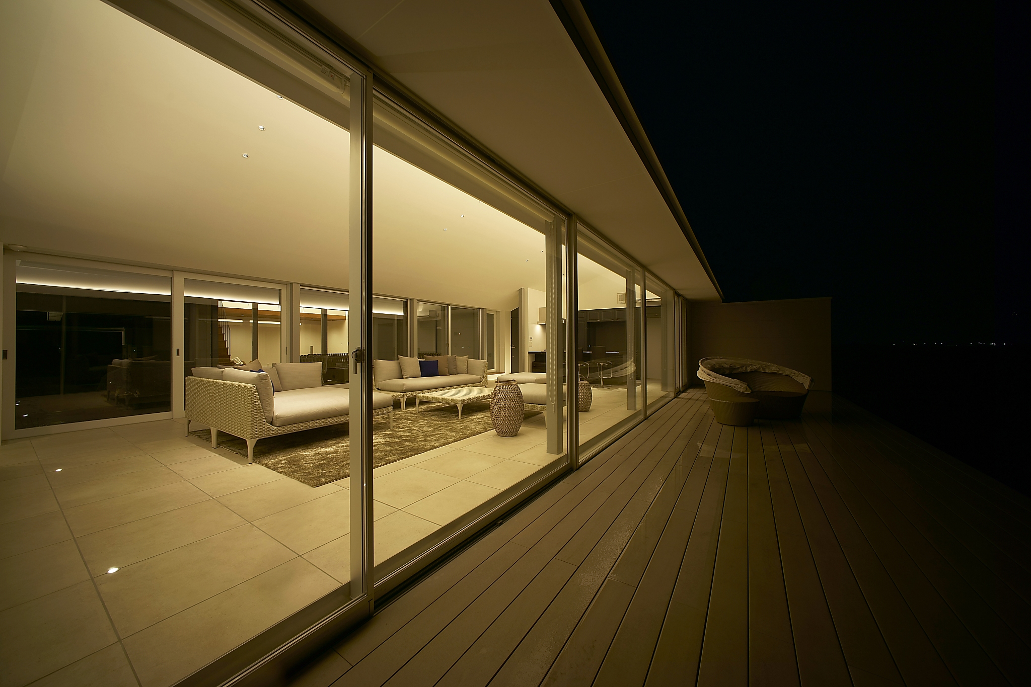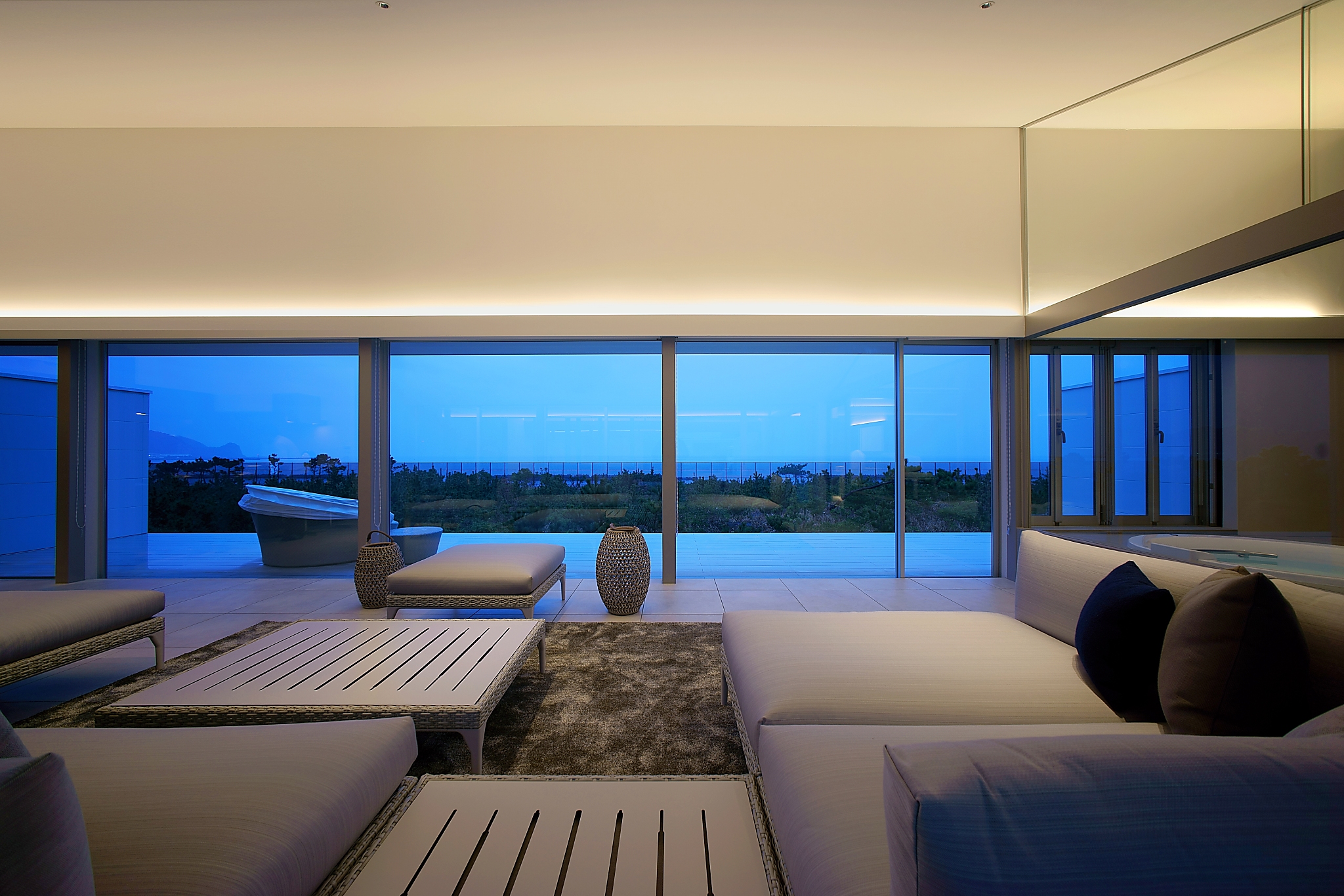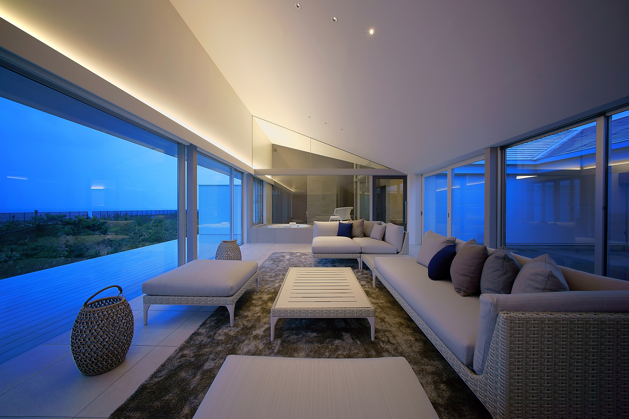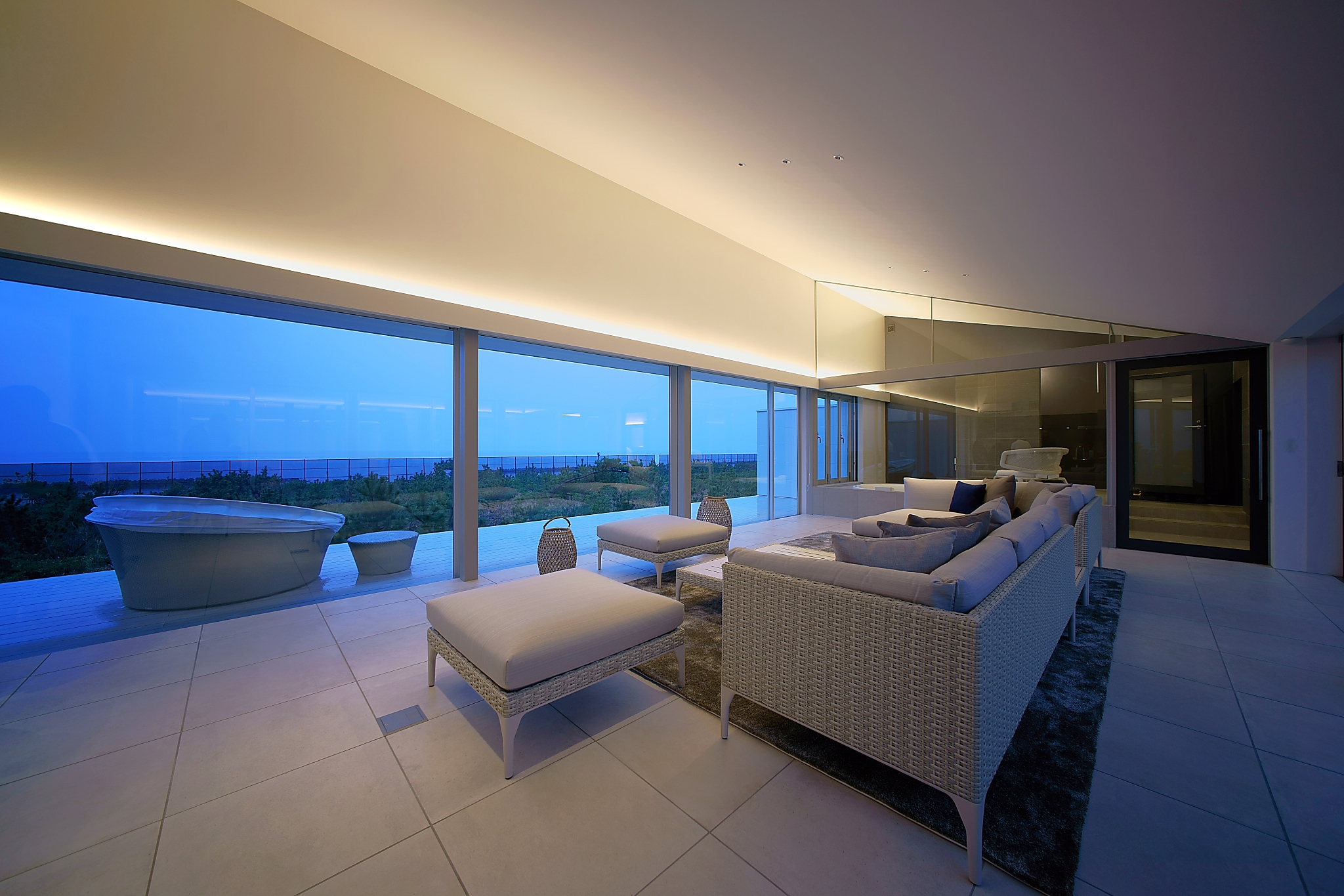 LDKと浴室をつなぐ天井を照らす間接照明は、室内用のLEDライン照明と浴室で使用可能なLEDライン照明を組み合わせて空間の連続性を損なわないプランとなっている。LDKの大きな開口部でフレーミングされた富津の海の眺めは、しばし言葉を失ってしまうほ美しく、ゆっくりと日が沈んで夜に移り変わる時間帯は室内の光がガラスの映り込んで眺望を邪魔しないように、照明は調光によって明るさを落としたり、間接照明を消して、床面だけを照らすグレアレスダウンライトのみ点灯するなど、様々な光のシーンを作ることができる。