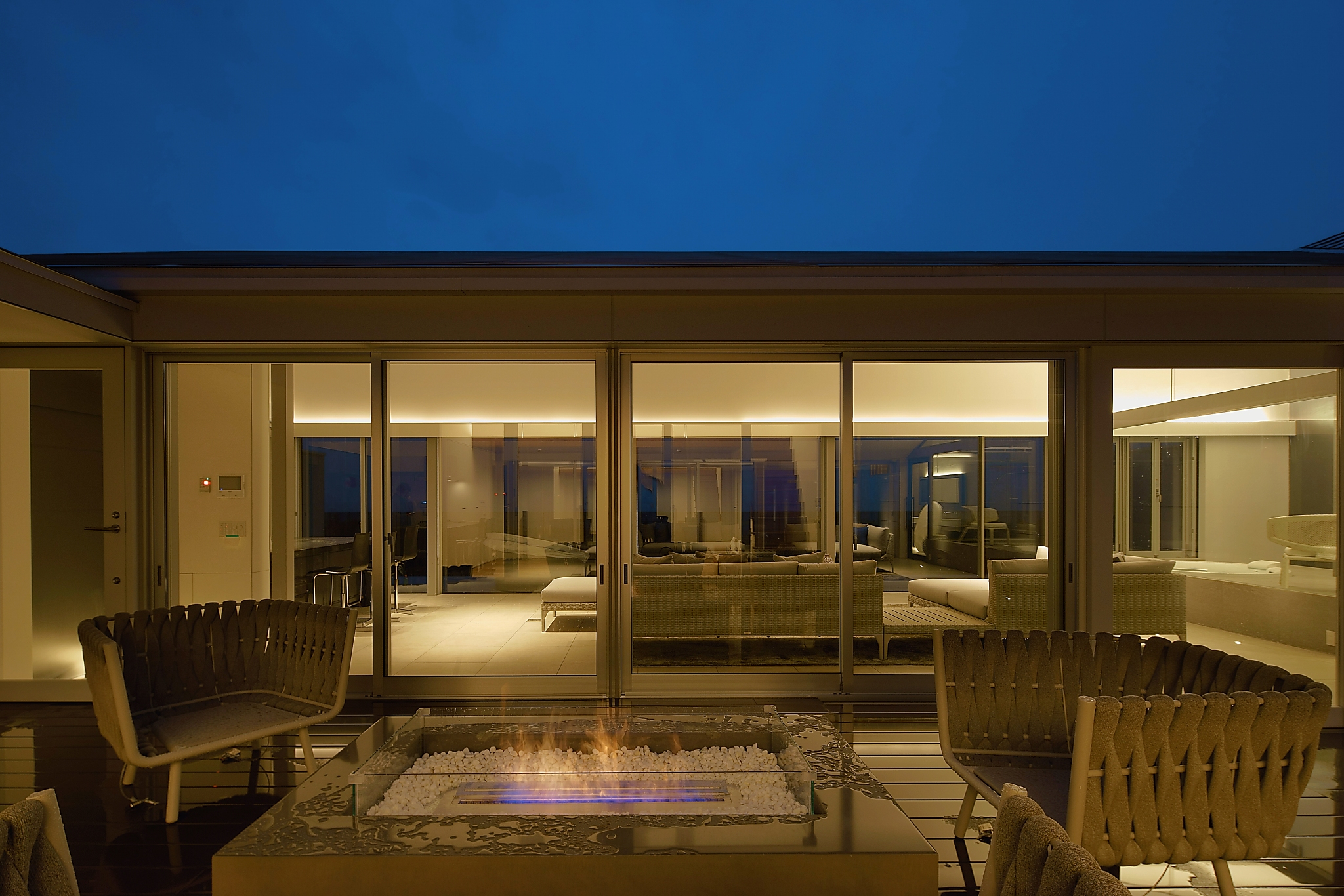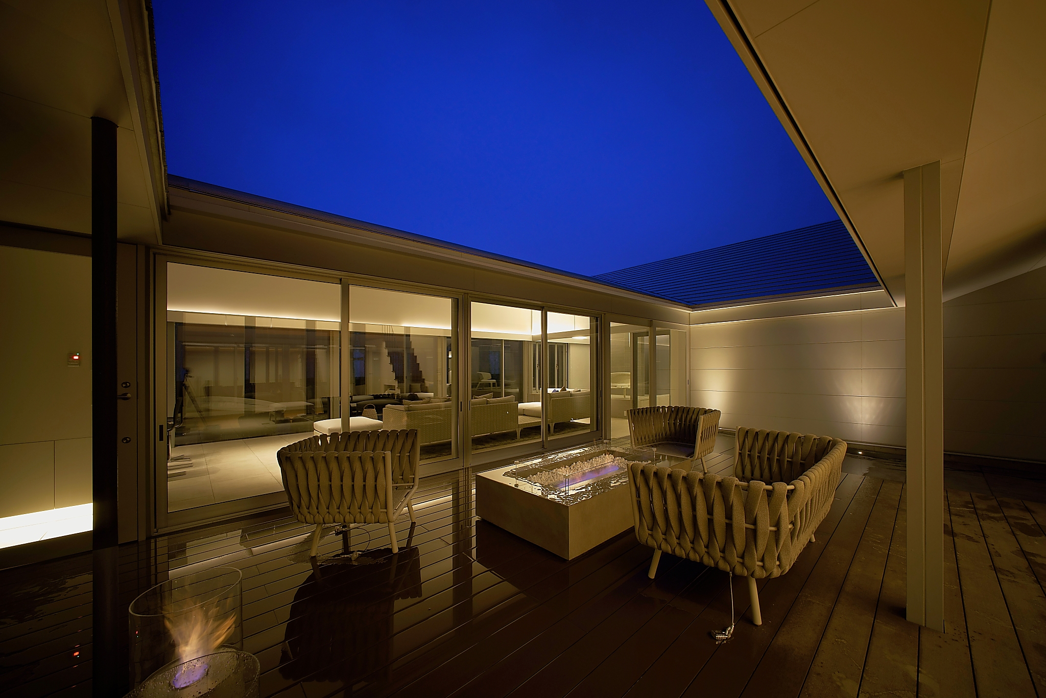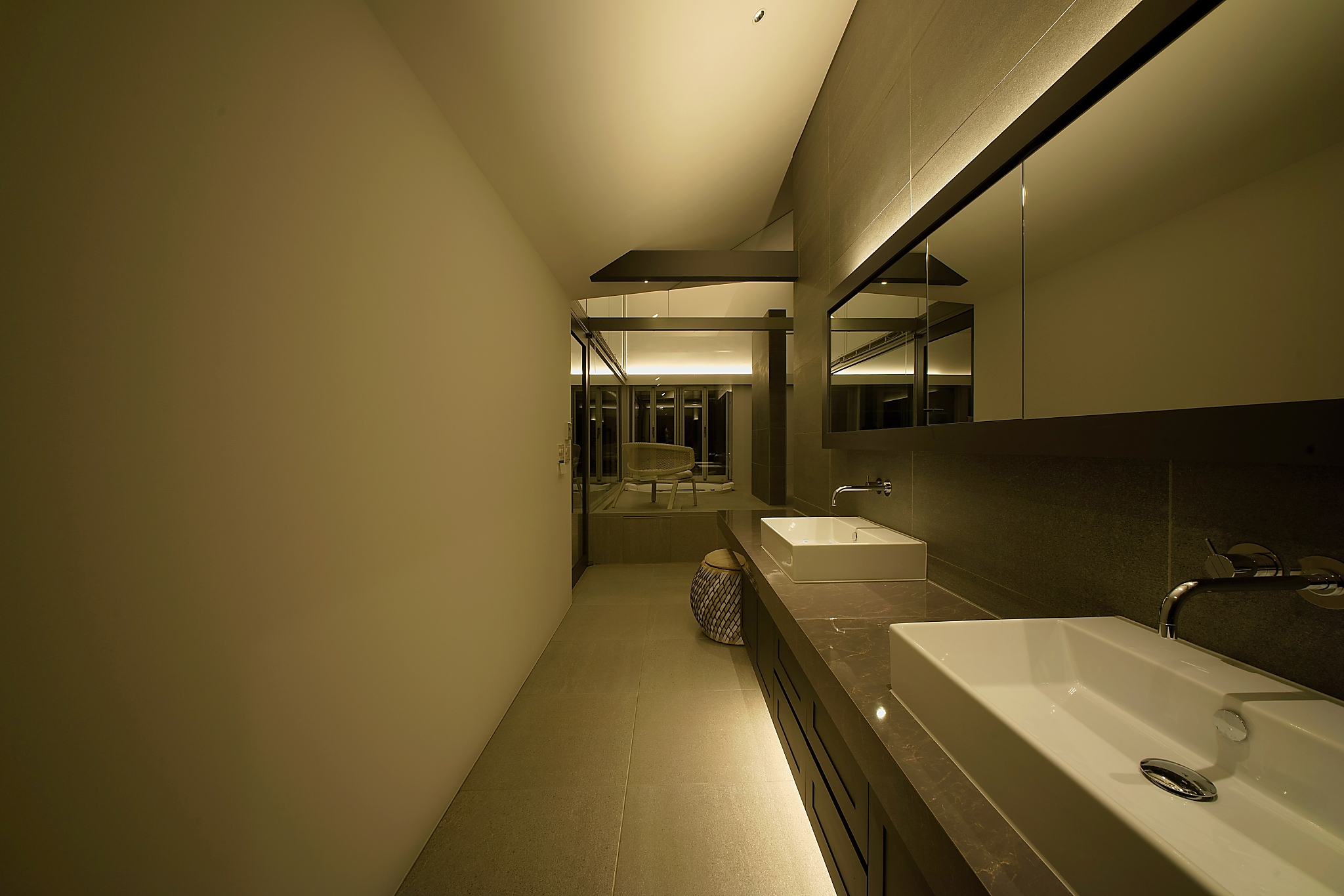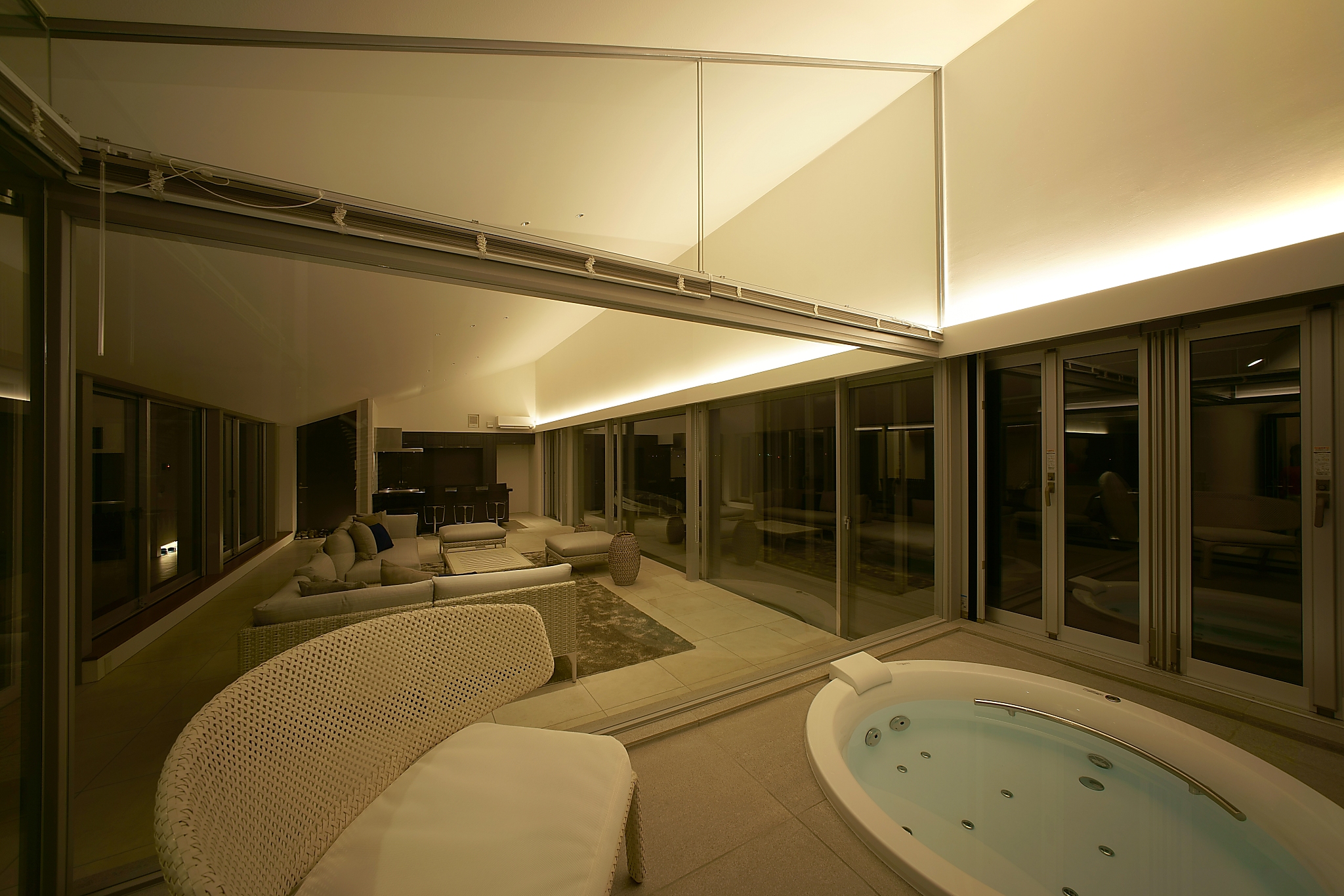 LDKと浴室をつなぐ天井を照らす間接照明は、室内用のLEDライン照明と浴室で使用可能なLEDライン照明を組み合わせて空間の連続性を損なわないプランとなっている。LDKの大きな開口部でフレーミングされた富津の海の眺めは、しばし言葉を失ってしまうほ美しく、ゆっくりと日が沈んで夜に移り変わる時間帯は室内の光がガラスの映り込んで眺望を邪魔しないように、照明は調光によって明るさを落としたり、間接照明を消して、床面だけを照らすグレアレスダウンライトのみ点灯するなど、様々な光のシーンを作ることができる。