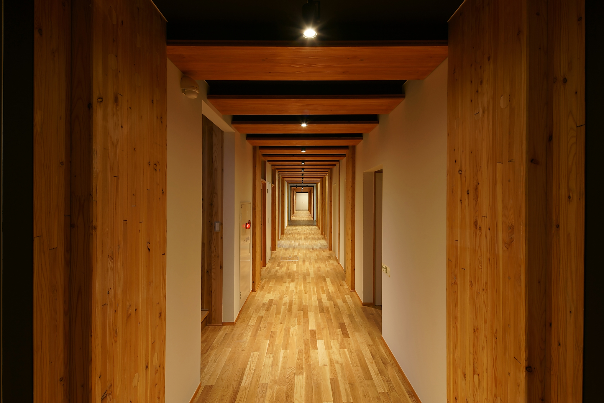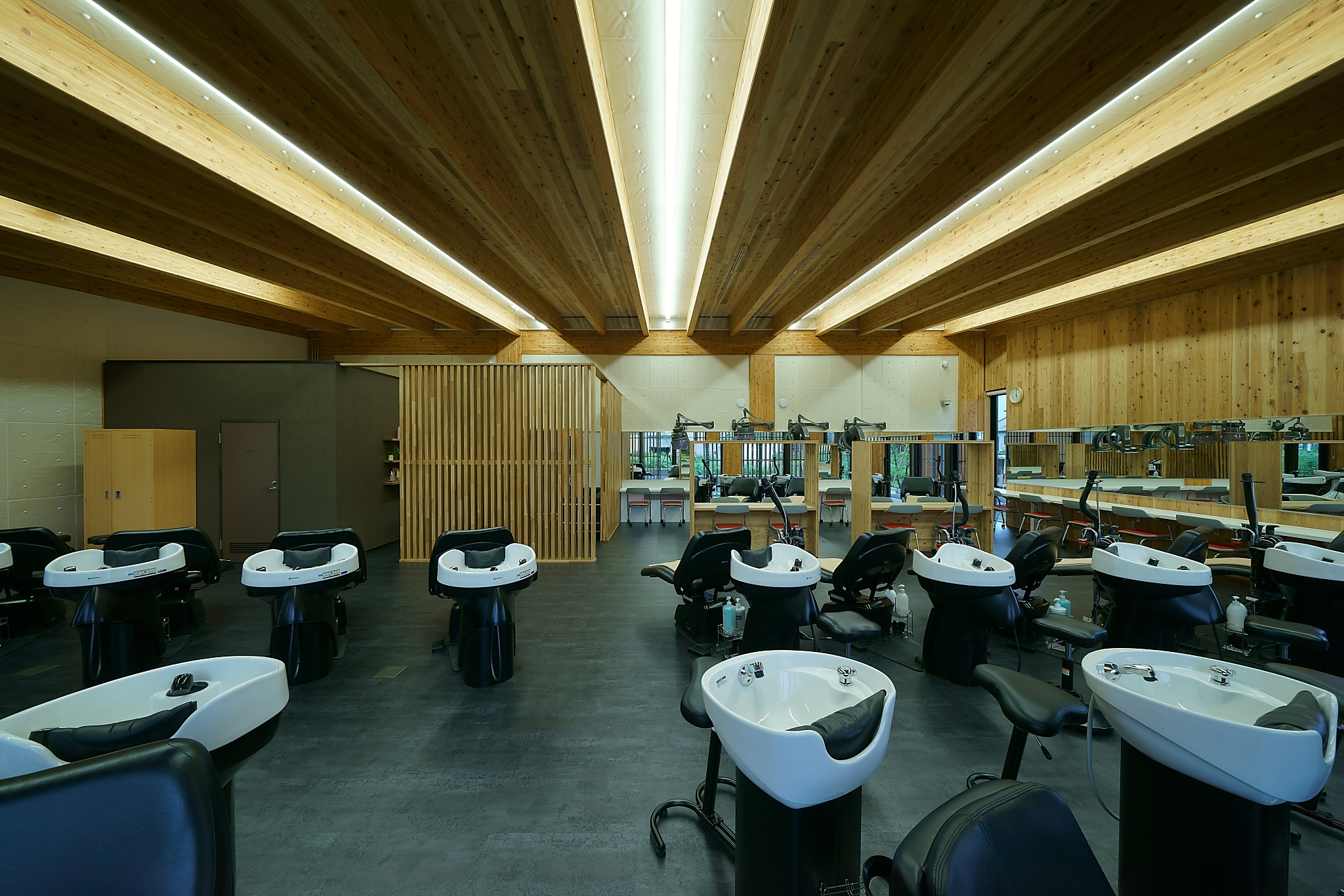 福島県郡山市にあるヘアメイクの専門学校。まだ国内でも例が少ないCLT壁パネルとCLT屋根パネルを使用した大規模木造建築。(CLTとはCross Laminated Timberの略称で、ひき板の各層を繊維方向が互いに直交するように積層接着したパネルの事を指す。)