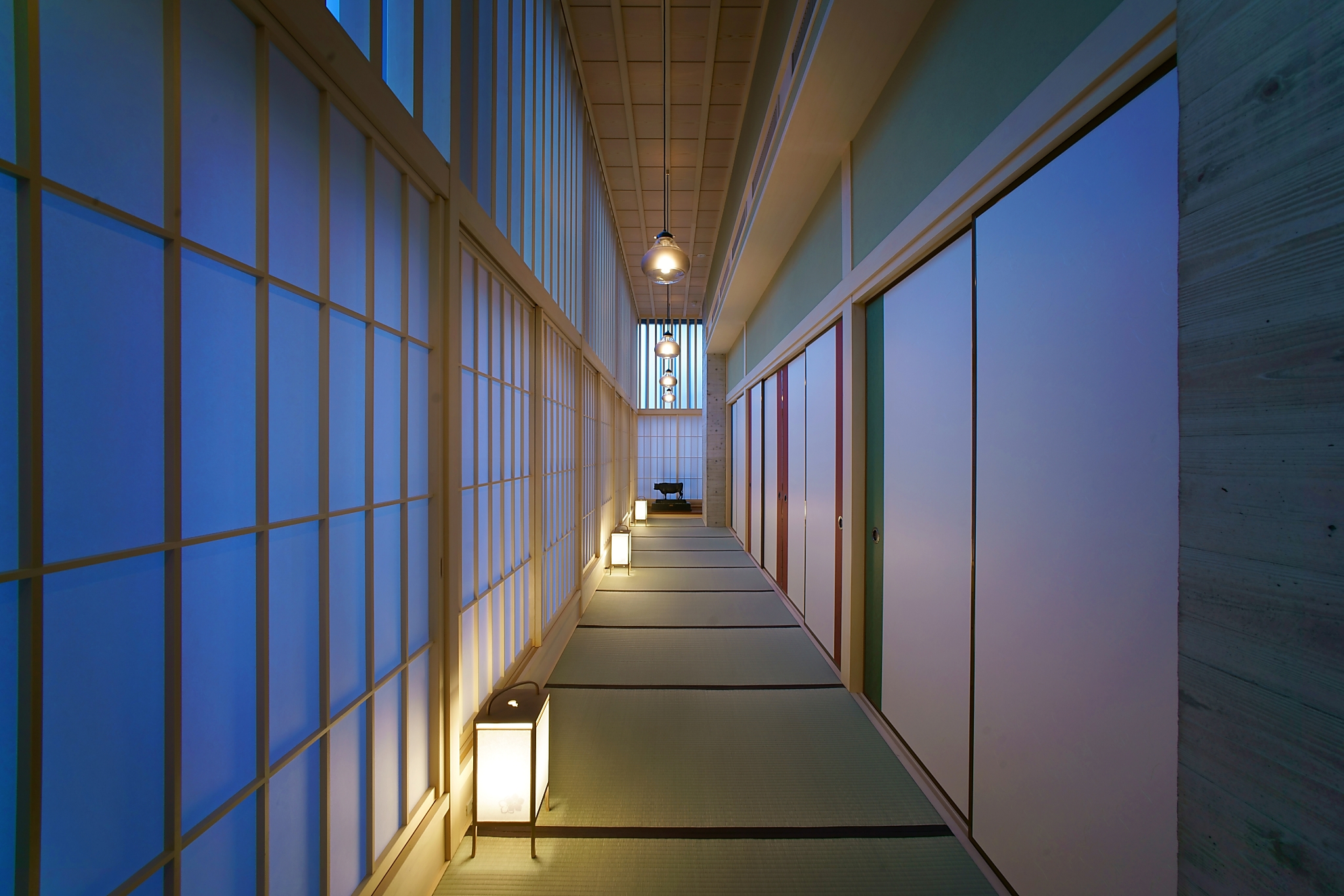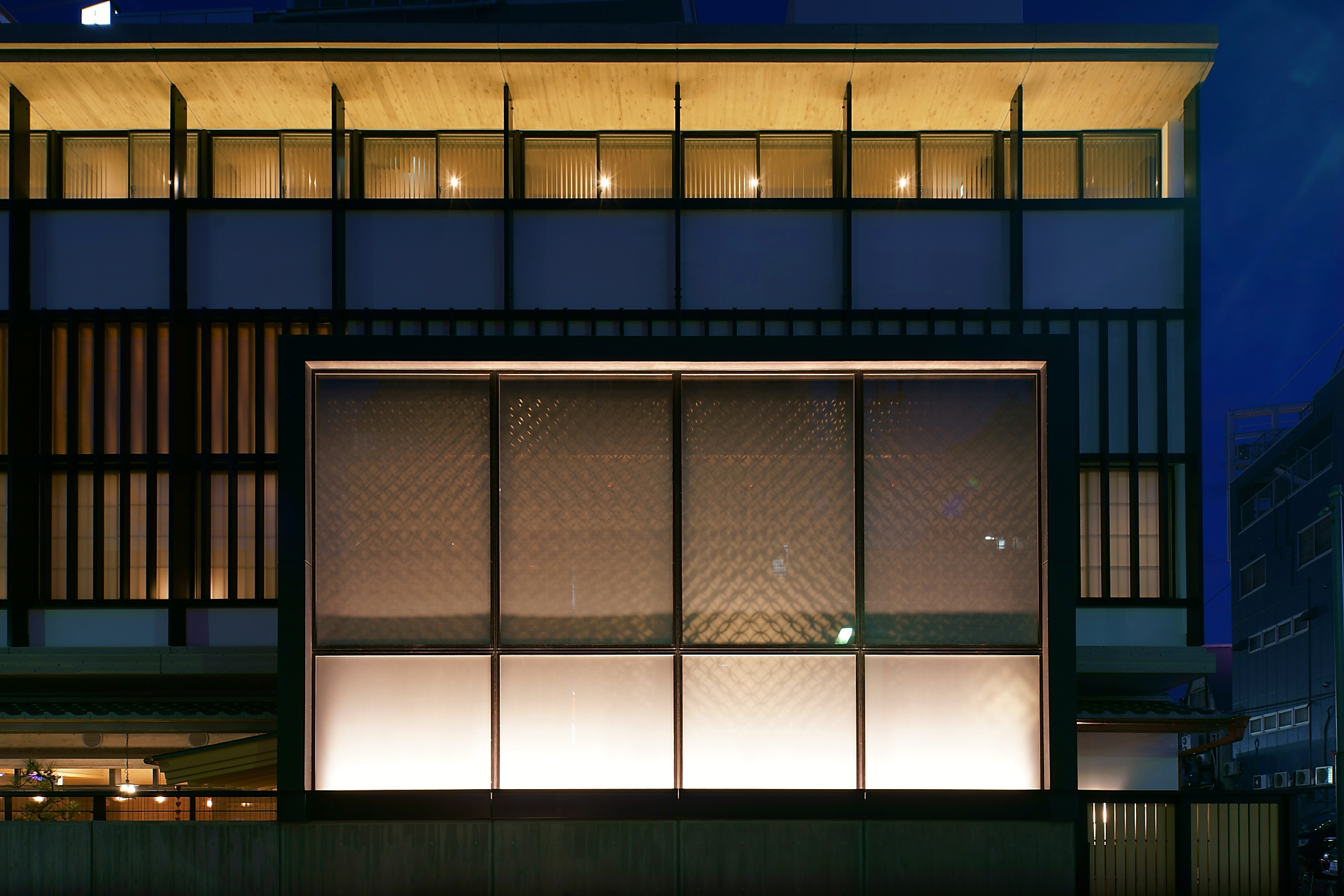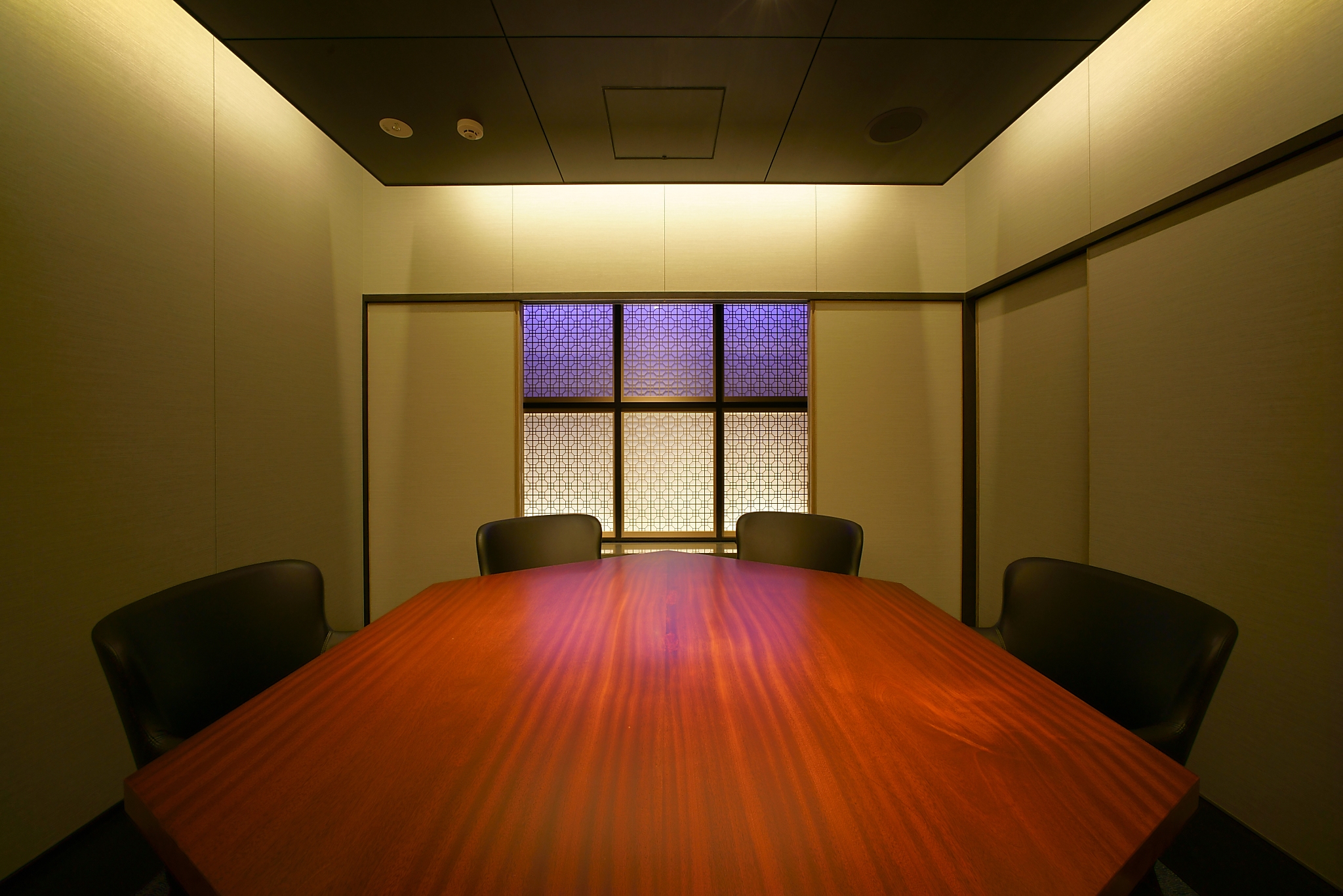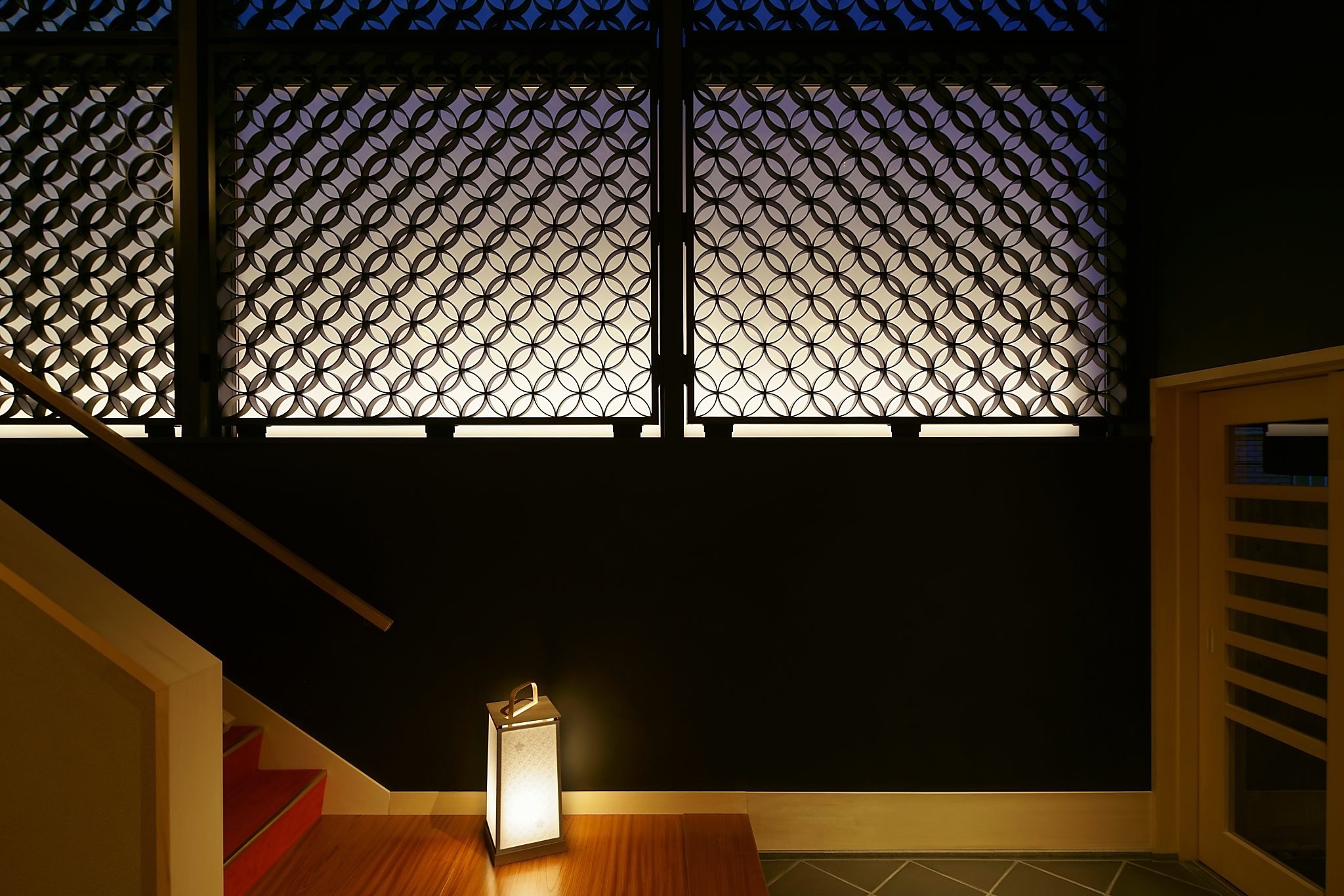 2層吹き抜けになっているエントランスホールに入ると、2階へ続く階段の大きな開口部に設けられた七宝模様の金属組子が迎えてくれる。金属組子の背面にある拡散フィルムを貼ったガラスを、外側から特殊な配光をもつLEDライン照明でライトアップすることで、室内から見るとガラスが光壁のように柔らかく発光し、七宝模様の金属組子のシルエットが美しく浮かび上がり、大きな行灯のようにエントランスホールを柔らかな光で包み込む。