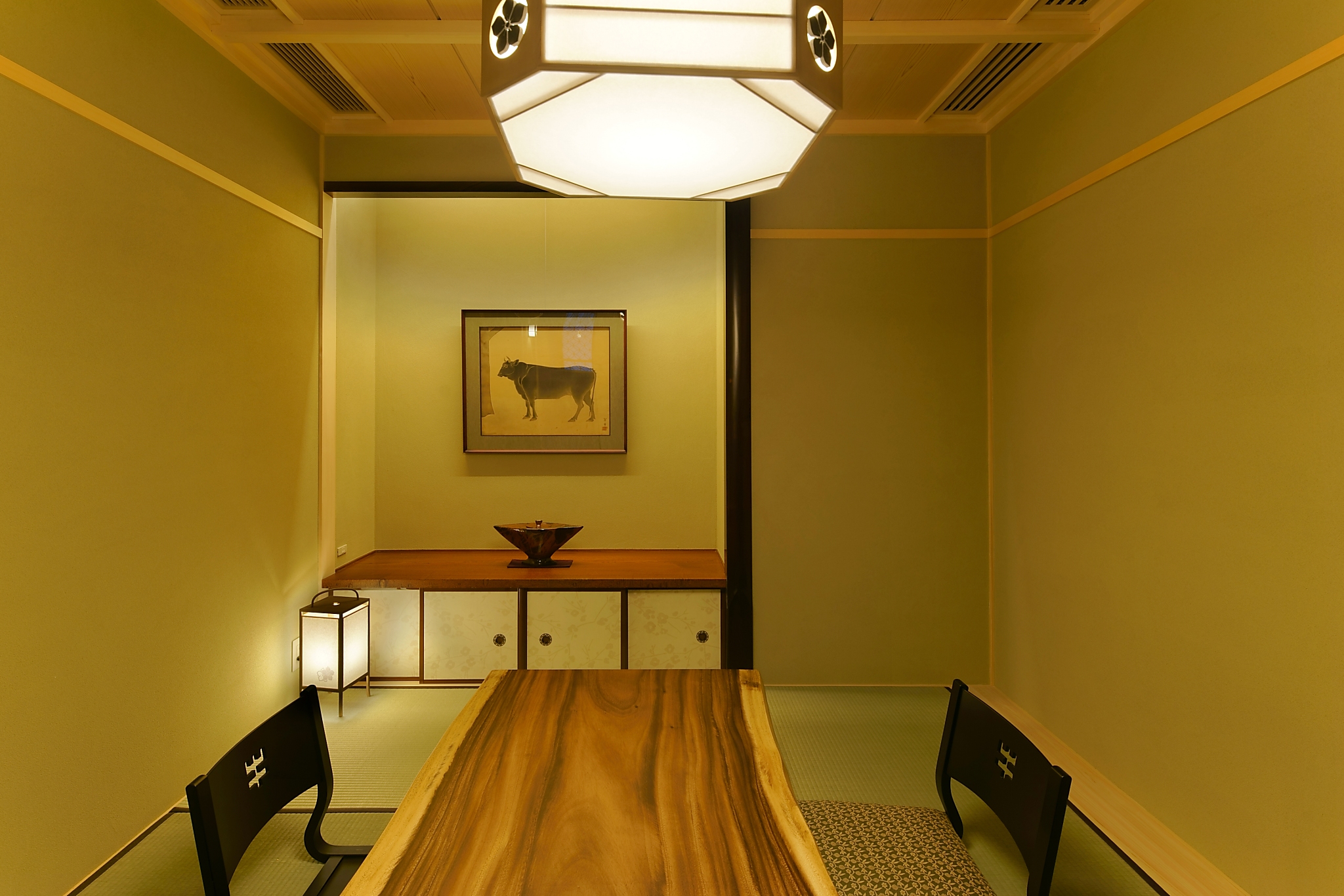 「宴の空間」である2Fは畳や木素材で構成された和の空間。それに合わせて照明は柔らかな拡散光を中心に構成されている。この空間の特徴の一つでもある和を意識した特注ペンダントには、LEDシーリングライトの光源ユニットを採用し調光調色が可能になっている。光源ユニットを覆う障子のような素材は耐熱・耐水性を考慮してワーロンシート採用するなど新しい技術を組み合わせた照明となっている。