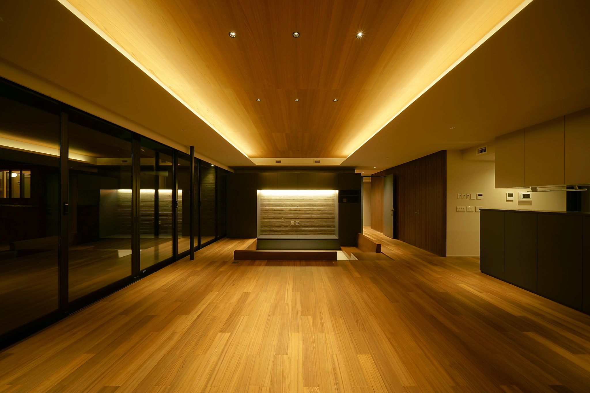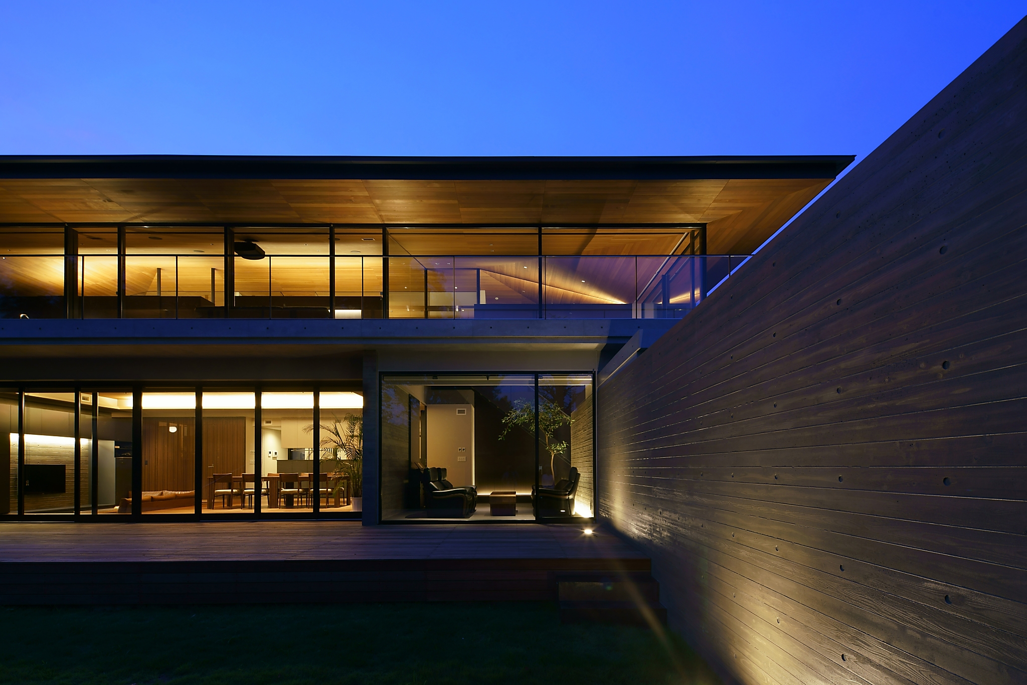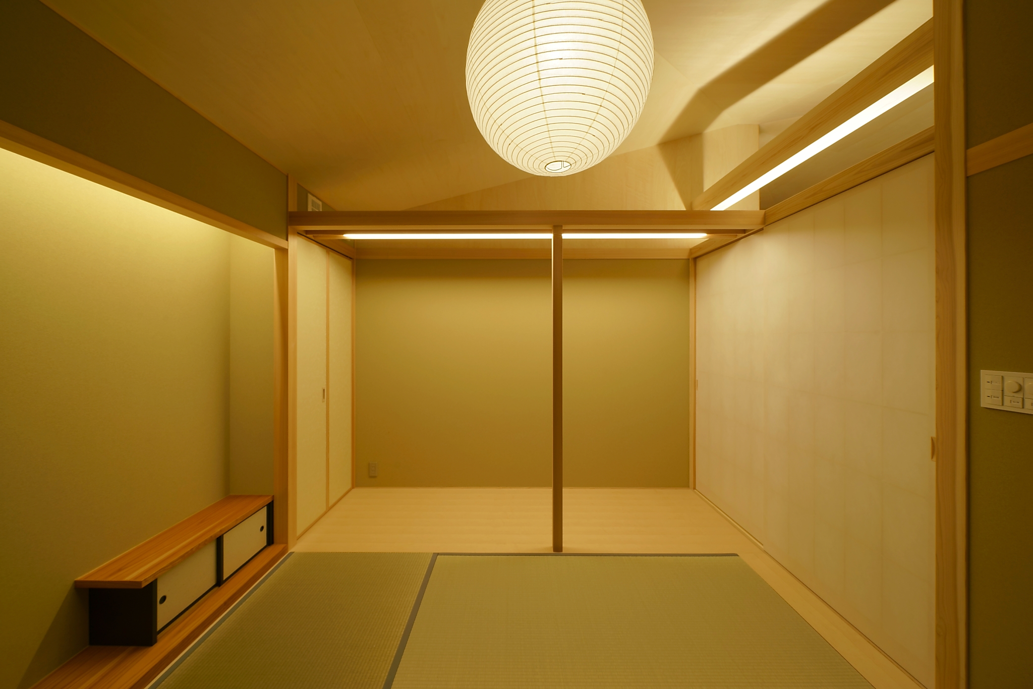 象徴的な大屋根を持つ2階建て2世帯住宅の母屋棟と、茶室を持つ平屋棟の2棟が広大な敷地に建つ個人住宅の照明計画。