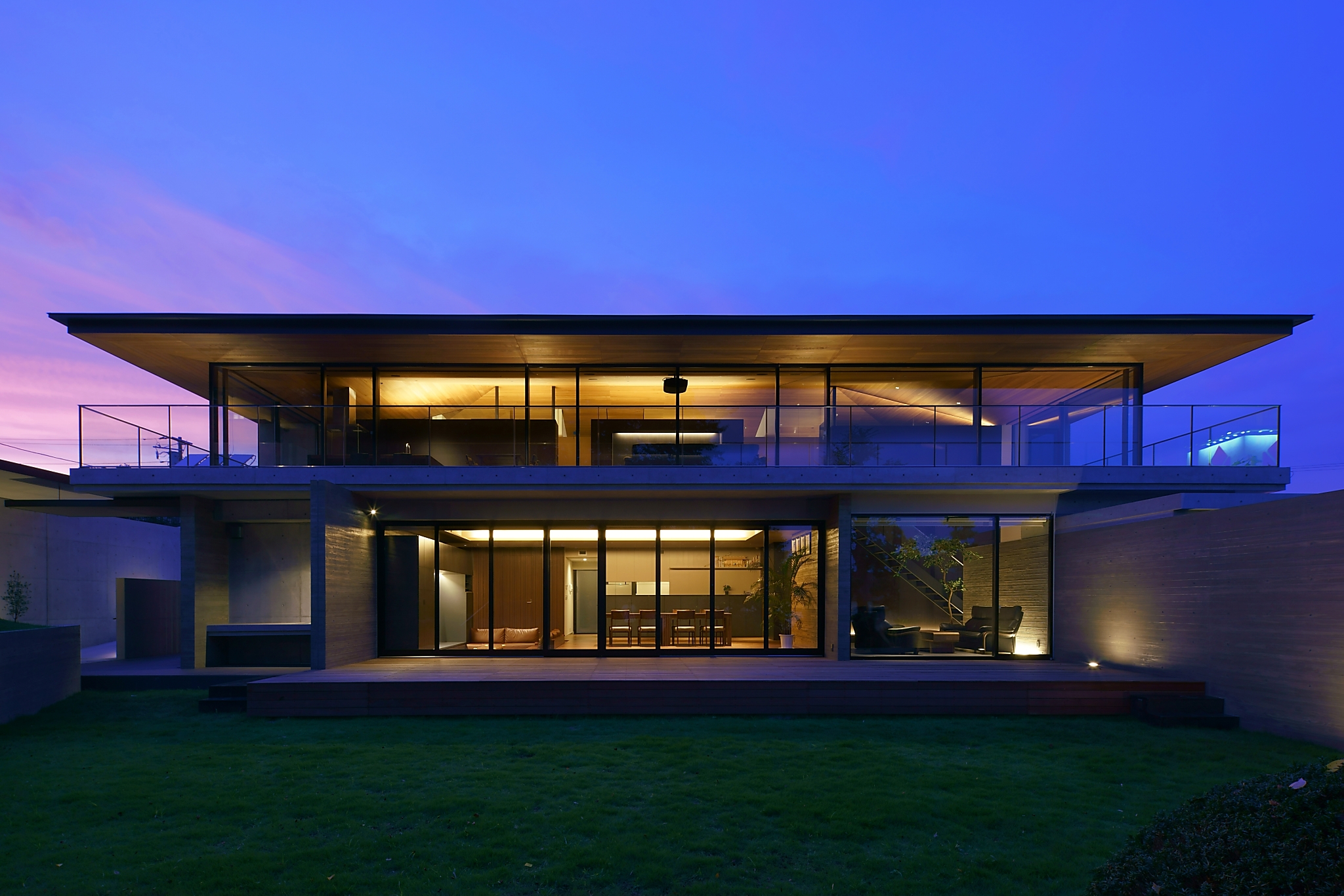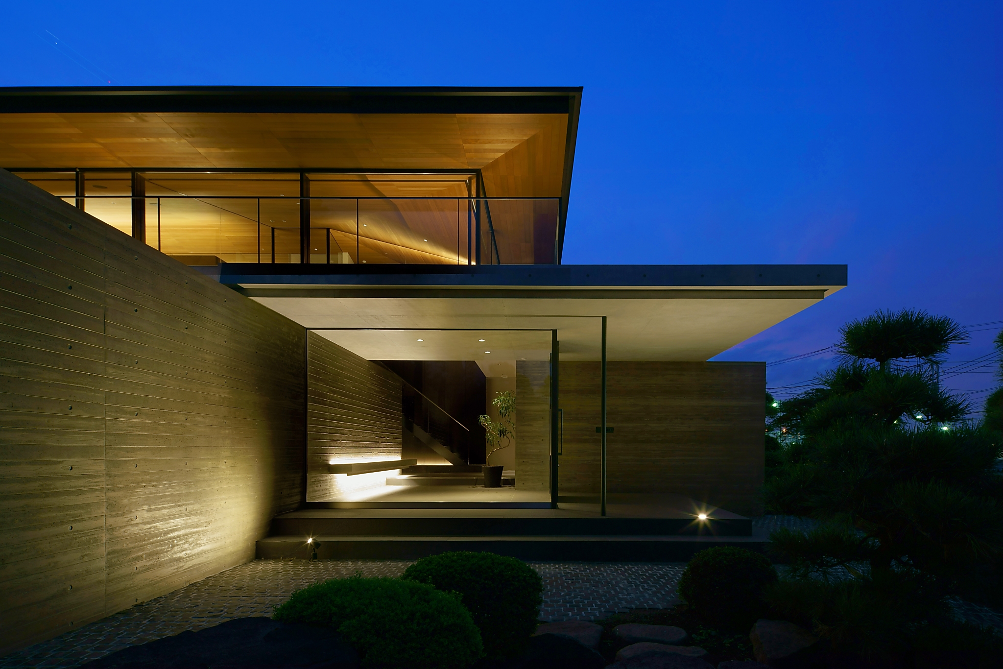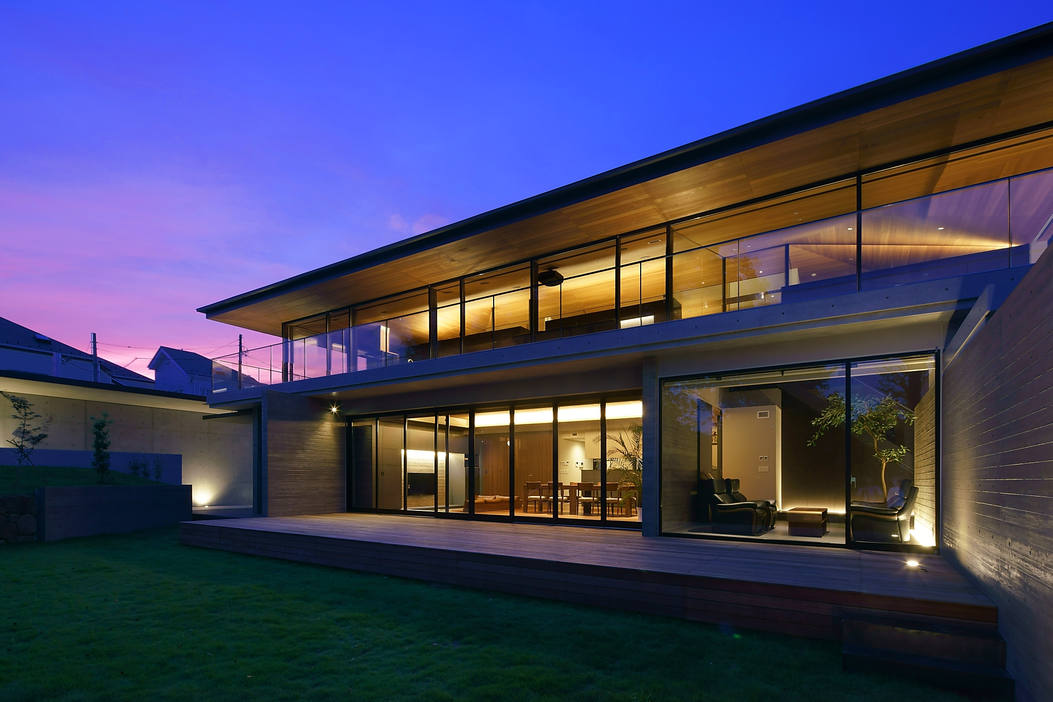 象徴的な大屋根を持つ2階建て2世帯住宅の母屋棟と、茶室を持つ平屋棟の2棟が広大な敷地に建つ個人住宅の照明計画。