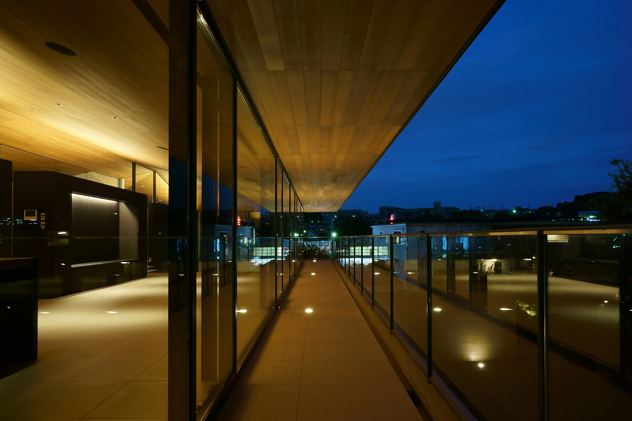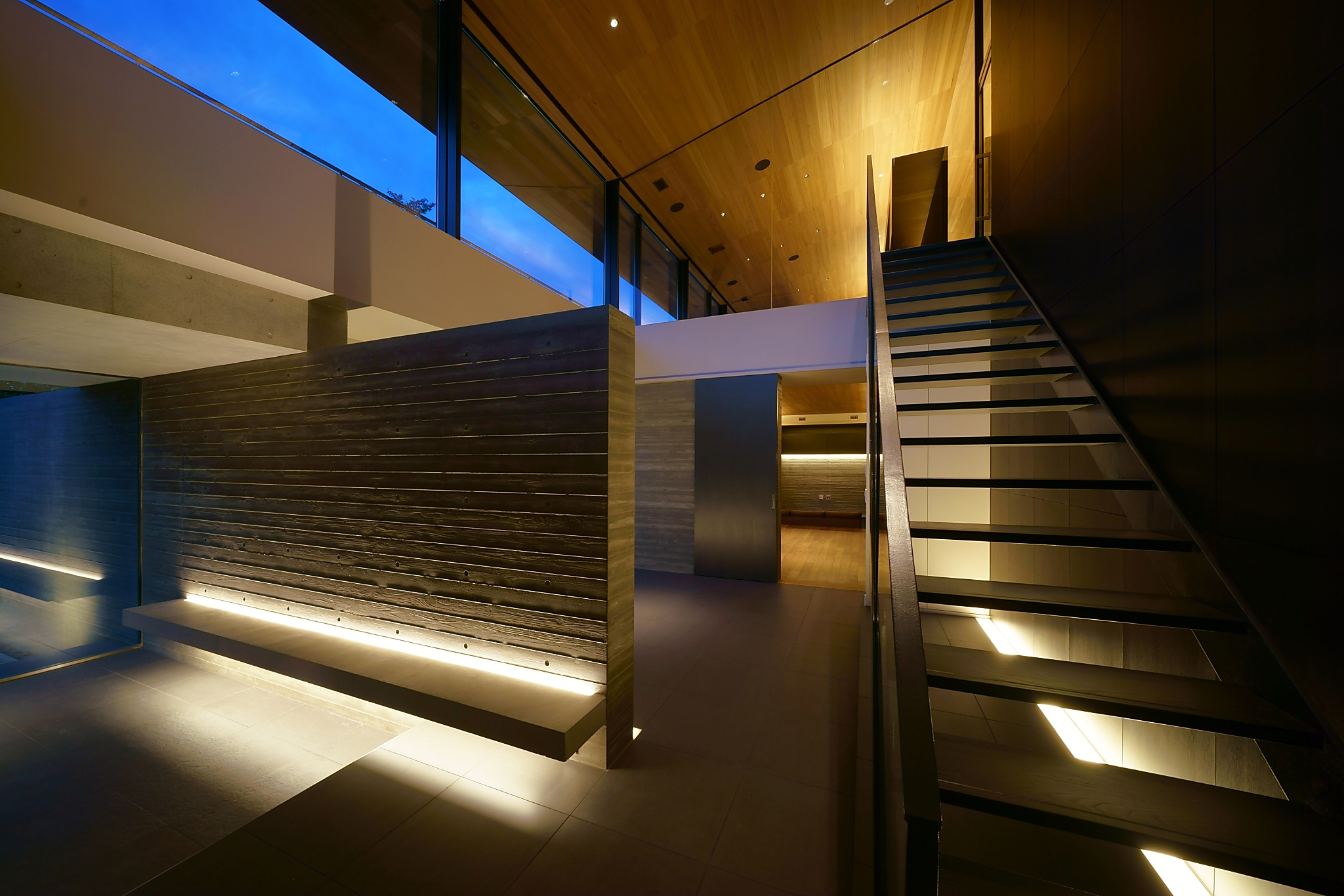 代々受け継がれてきた土地の記憶や歴史の継承をテーマに計画された重厚感のある母屋棟には、建物全体をやさしく包み込むように大屋根がかかる。その大屋根を室内からは天井を照らす間接照明で、2Fをぐるりと囲むバルコニーからは床に埋め込まれたアッパーライトを用いてライトアップし、日が沈むと周辺の景色にふわりと浮かんでいるかのような軽快感の演出と、木素材で構成された大屋根の暖かさを感じられるように心がけた。また、ダイナミックな空間の中で照明器具の存在感を極力感じさせないよう機能照明となるダウンライトは開口径Φ60のコンパクトサイズを用いている。少ない灯数でも明るさを感じられるよう、間接照明と組み合わせながら面を明るく見せる手法を積極的に採用している。