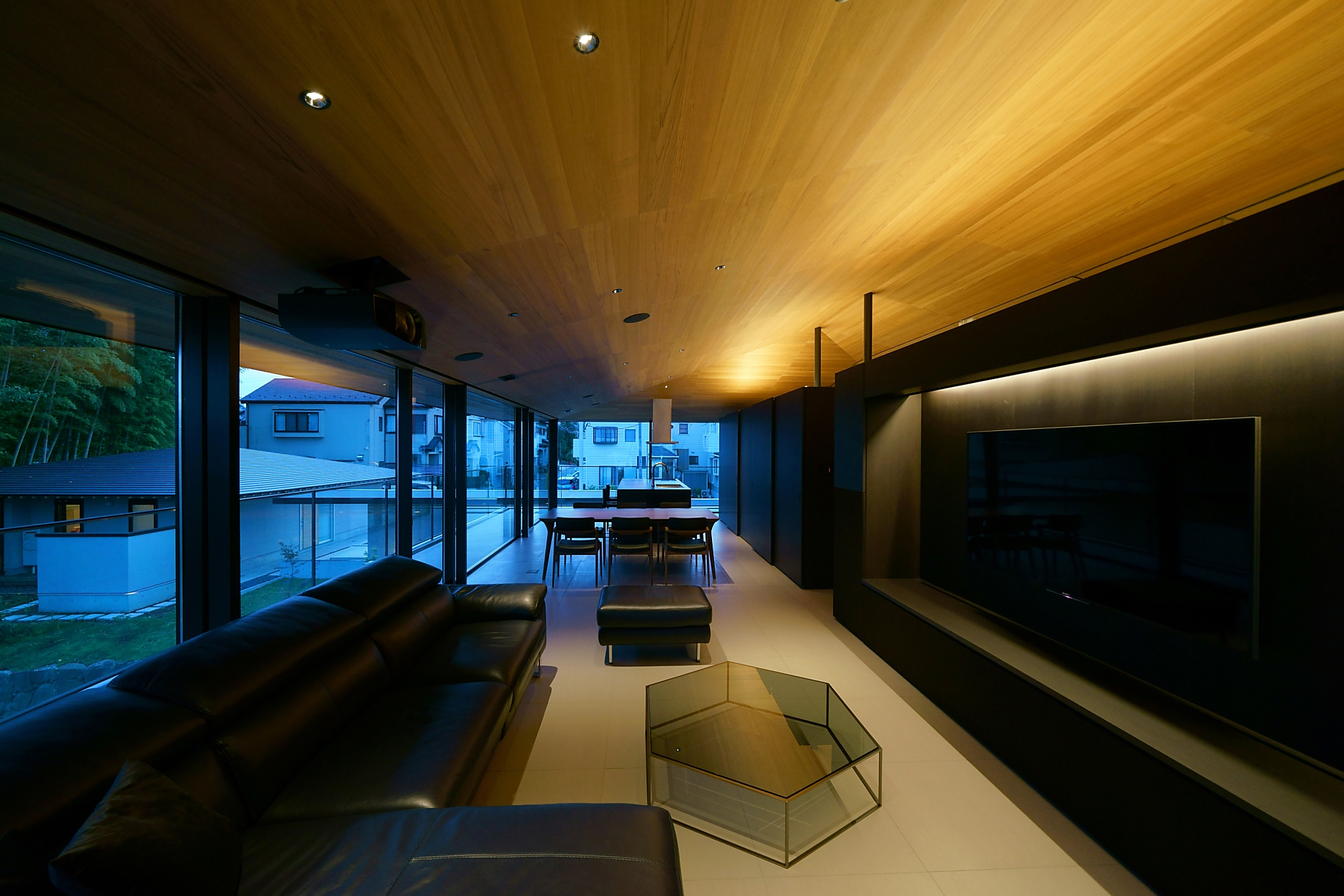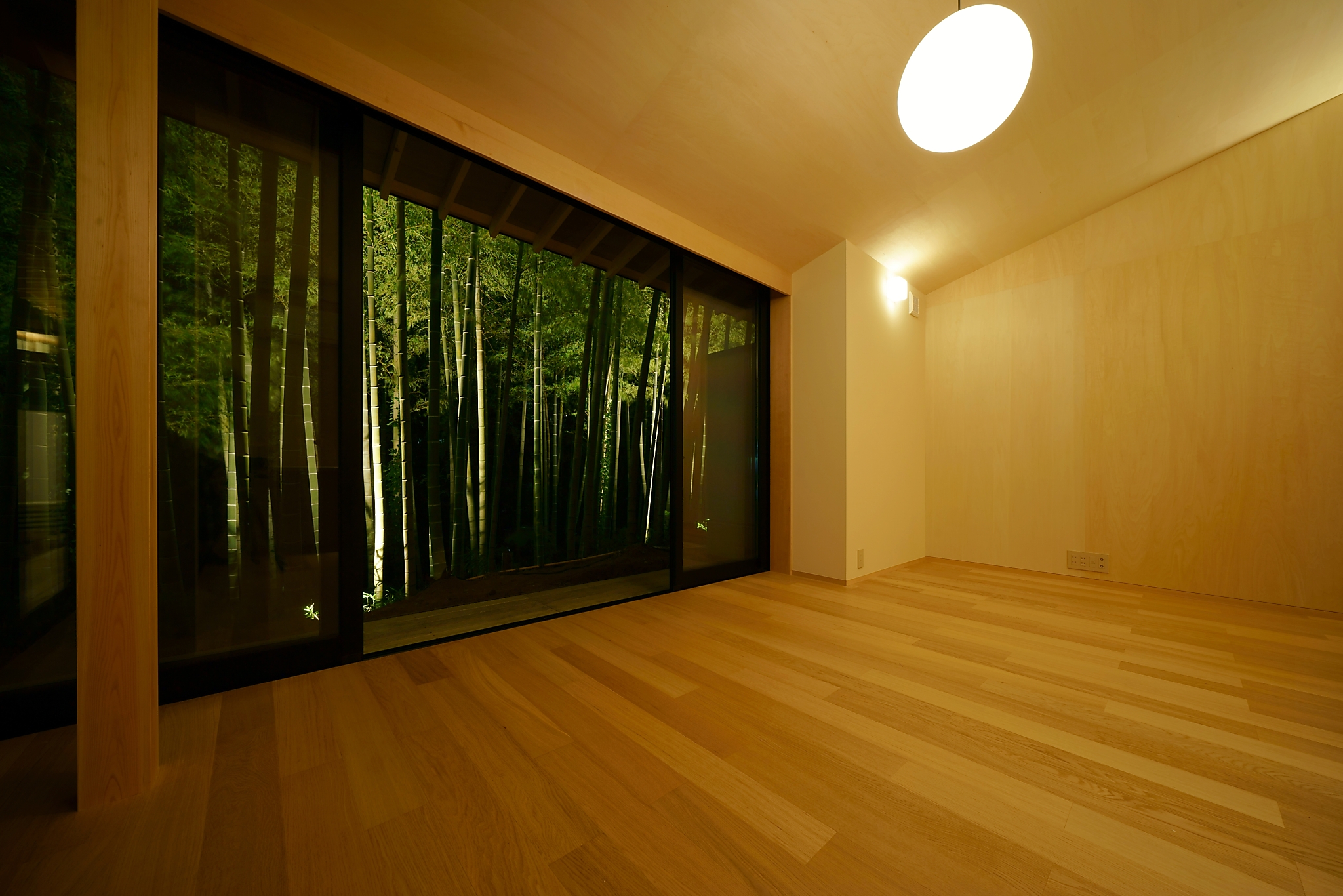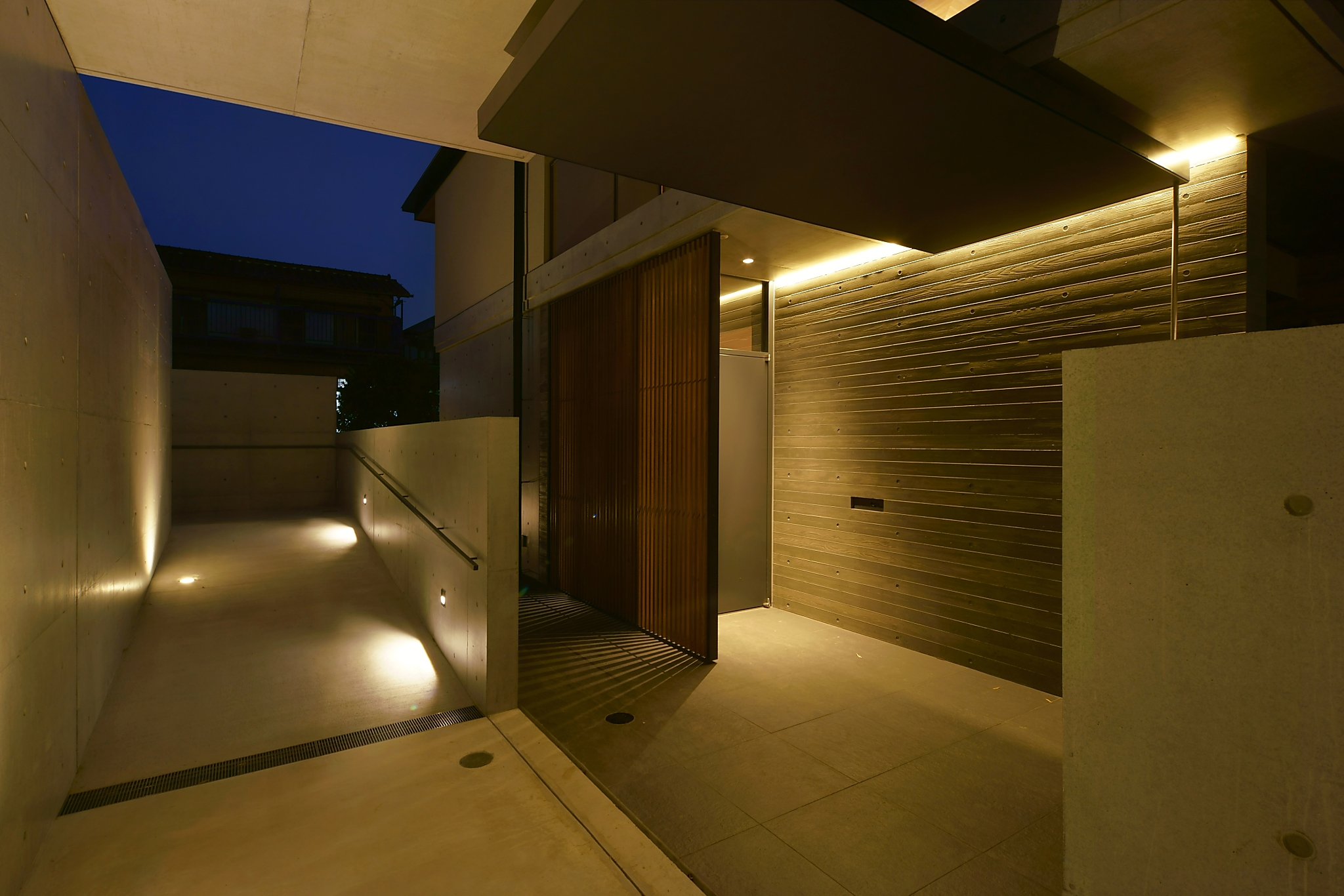 一方、茶室を持つ木造の平屋棟は和を意識した拡散光を中心とした柔らかな照明計画となっている。広大な庭にはシンボルツリーとなる桜や美しい竹林もあり、夜間はさりげなくライトアップされた庭園も見所の一つである。