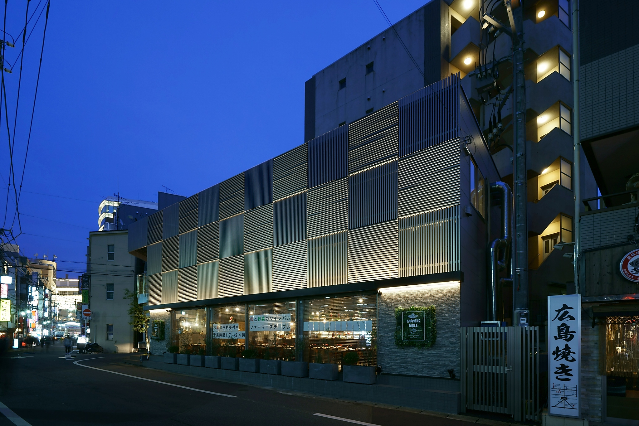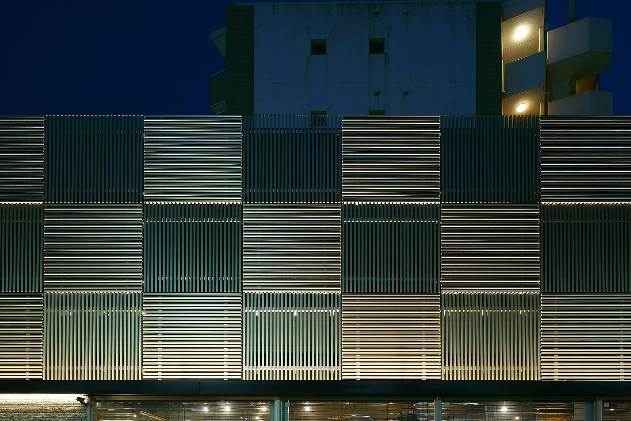 ルーバーの素材、色、設置方向、太さやピッチなど、デザイン性のみならずコストやメンテナンス性なども考慮し、複数の案の中から縦と横のルーバーを組み合わせた市松模様のデザインが採用された。市松模様のデザインは見る位置や角度によって光と影の表情が変化し、さまざまな商業ビルが建ち並ぶ商店街で一際存在感を放っている。