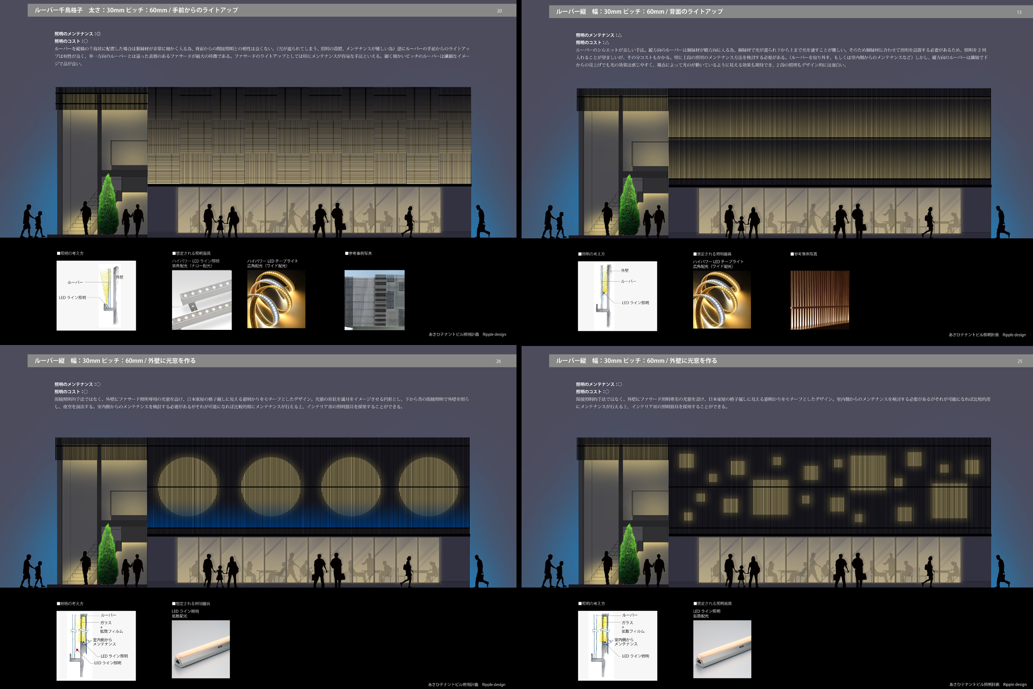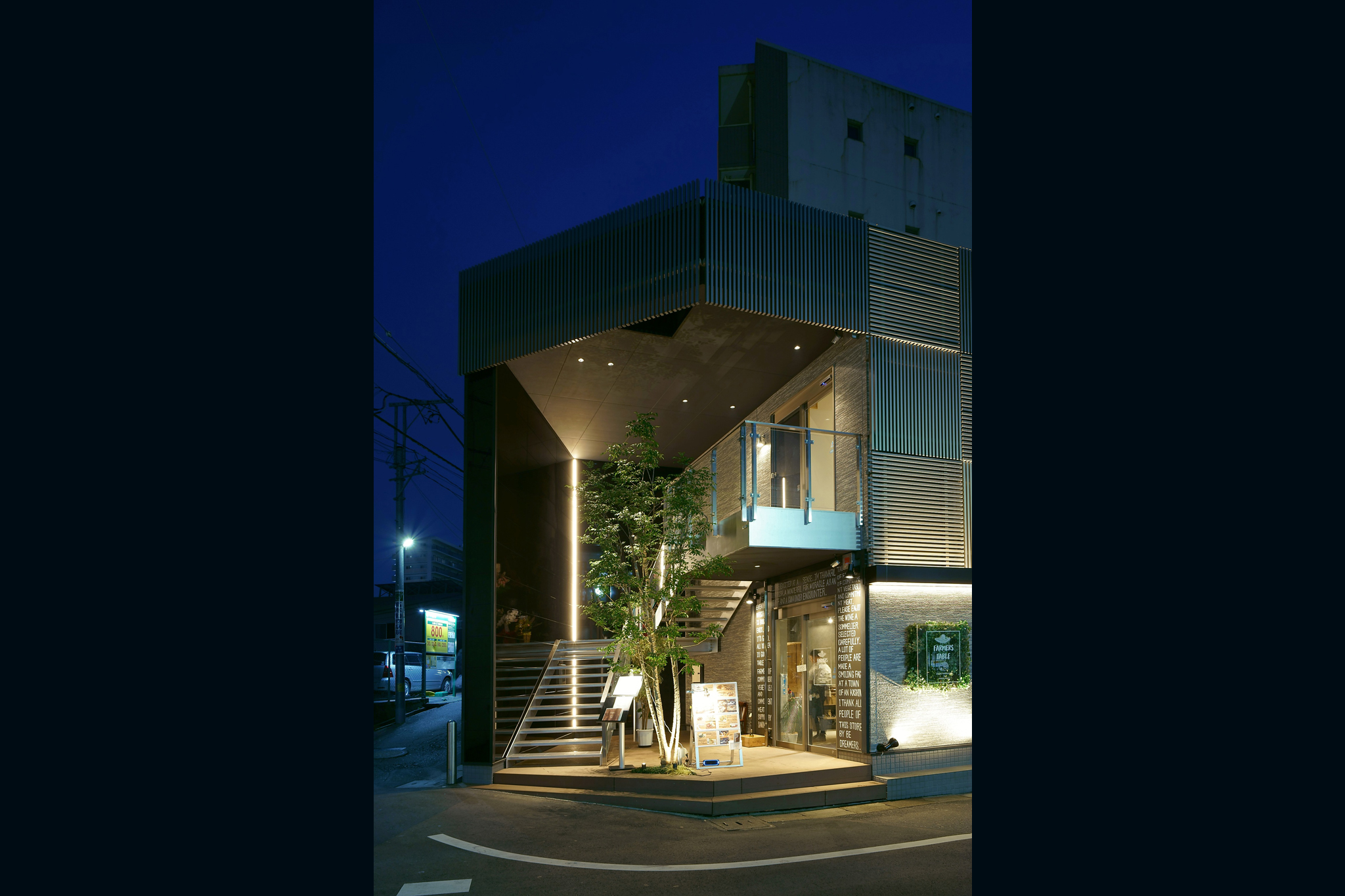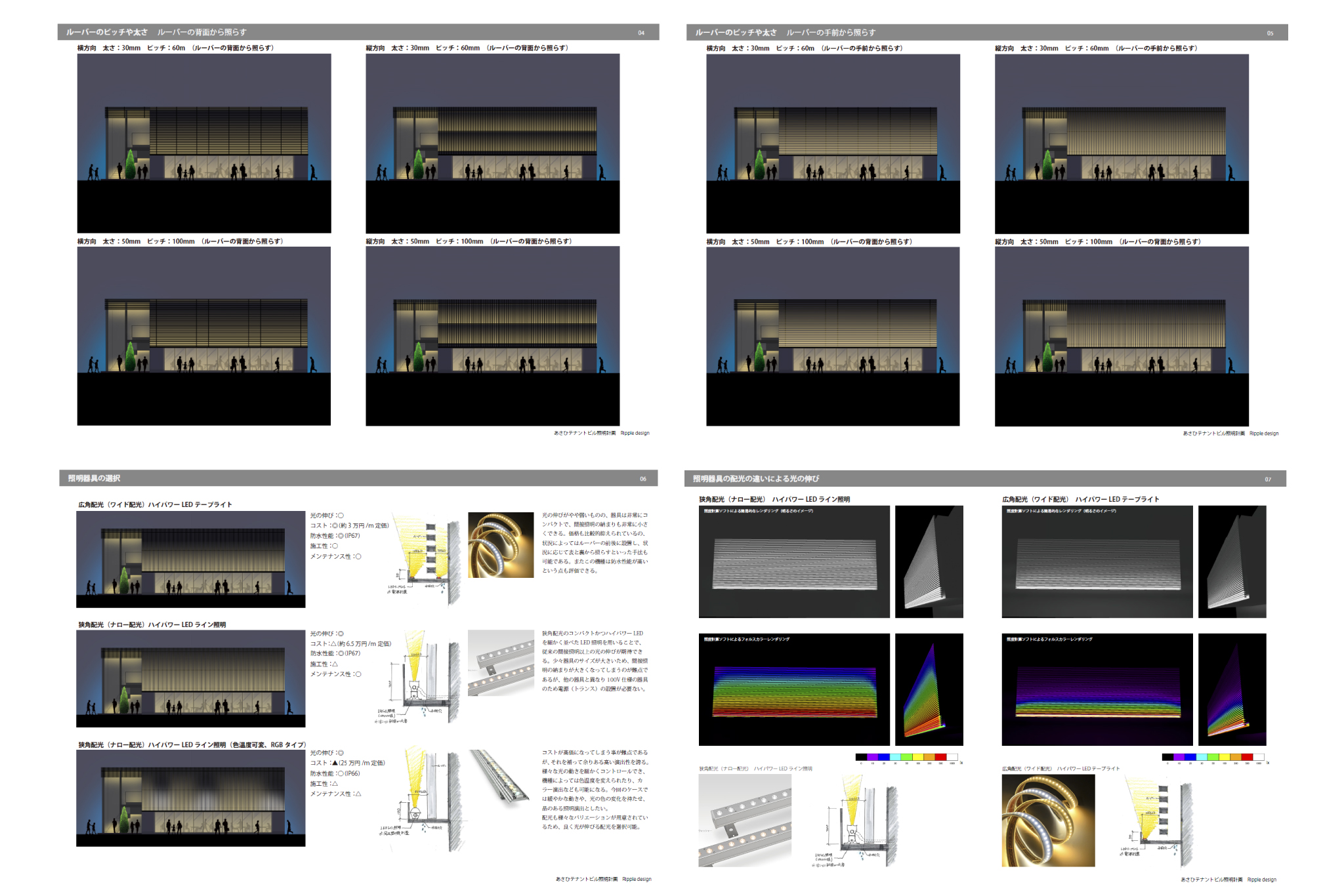 テナントビルのファサード照明デザインのプロジェクト。照明デザインの提案のみならず、ルーバーを用いたファサードそのもののデザイン提案も設計者と共に行った。