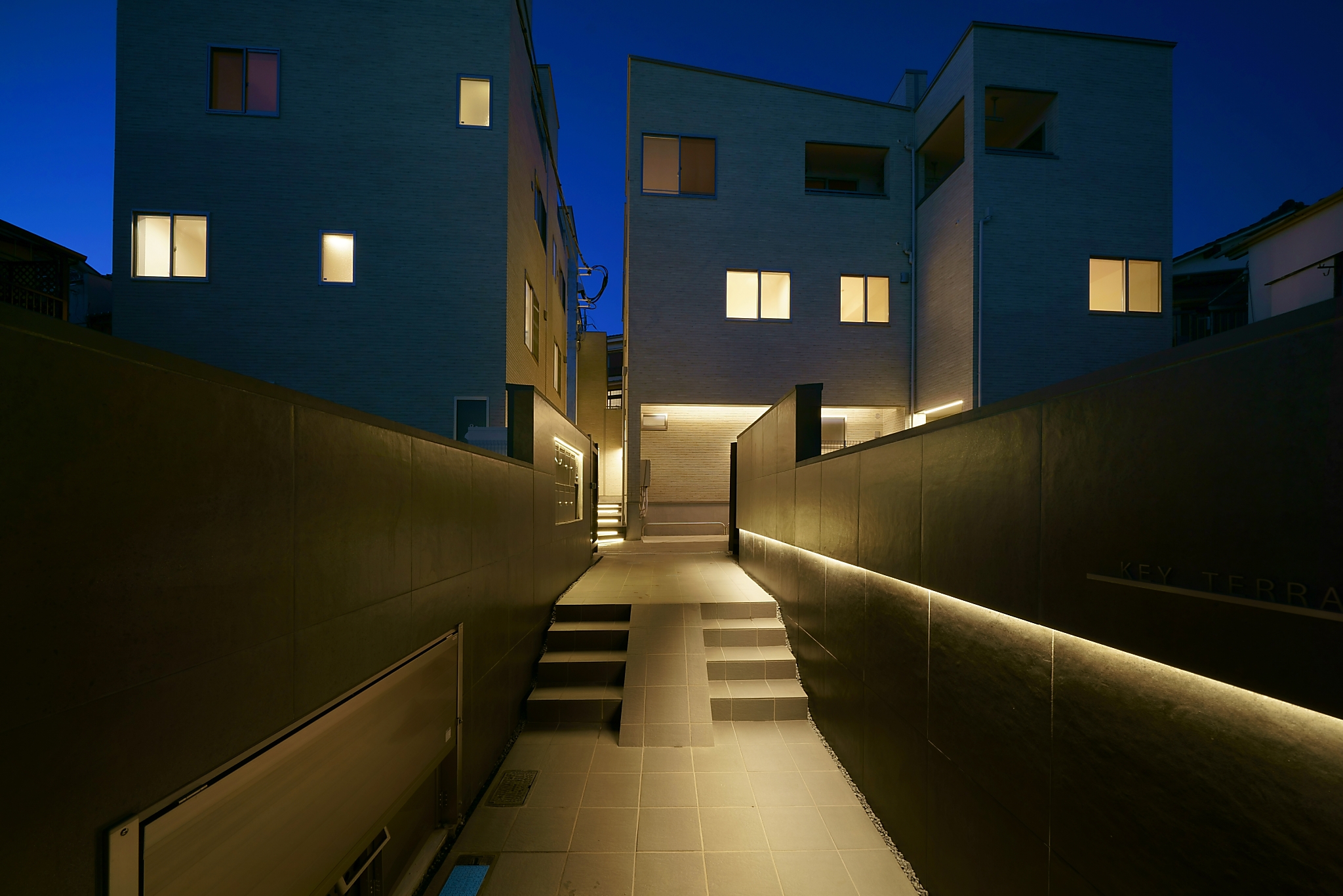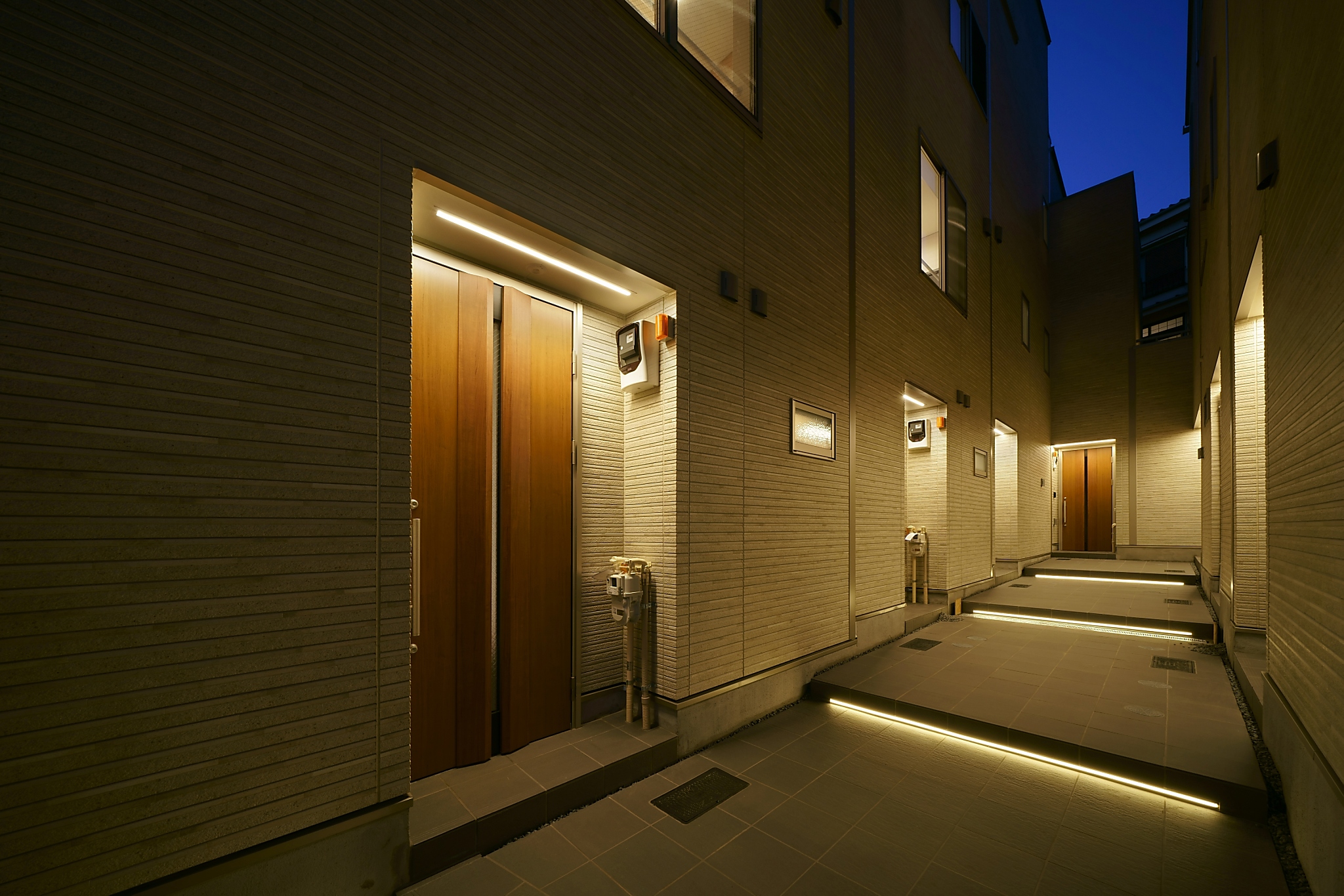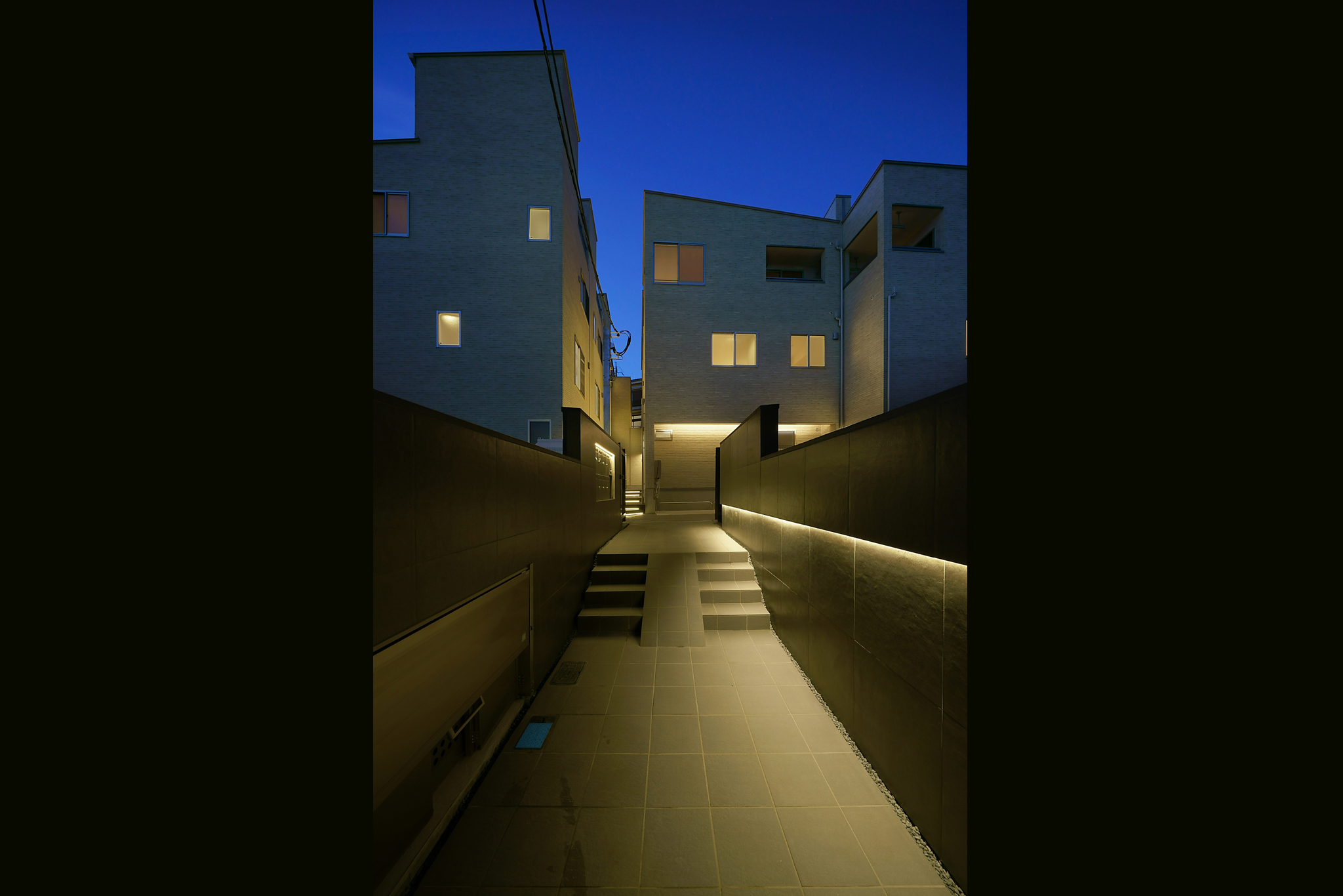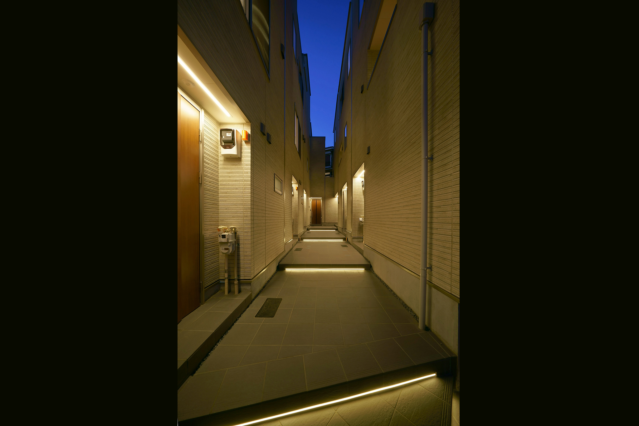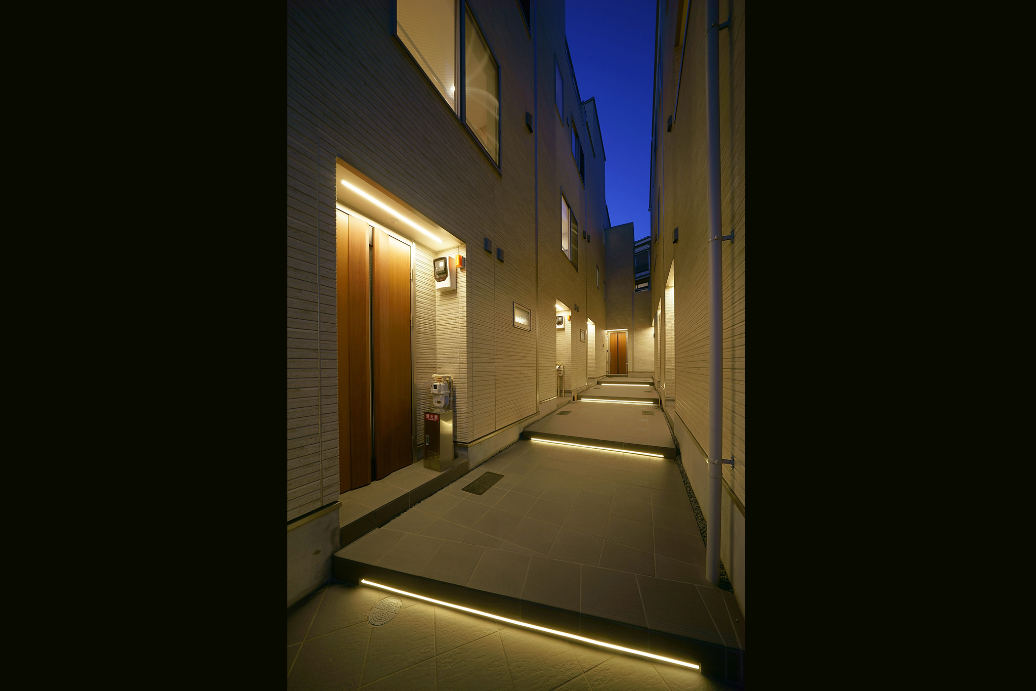 集合住宅のエントランス・アプローチの照明計画。入り組んだ敷地の奥の広い場所に建物が配置されているため、その条件をポジティブに捉えてデザインされた、余裕のある長いアプローチが特徴的な集合住宅となっている。照明はその個性に合わせてパースペクティブを強調し、より奥行き感を演出するため、「線の光」を用いたデザインを提案した。高い防水性を持つスリムなLEDライン照明を用いることで、これまでは難しかった床面スレスレの場所から石の素材を美しく、柔らかく照らしている。