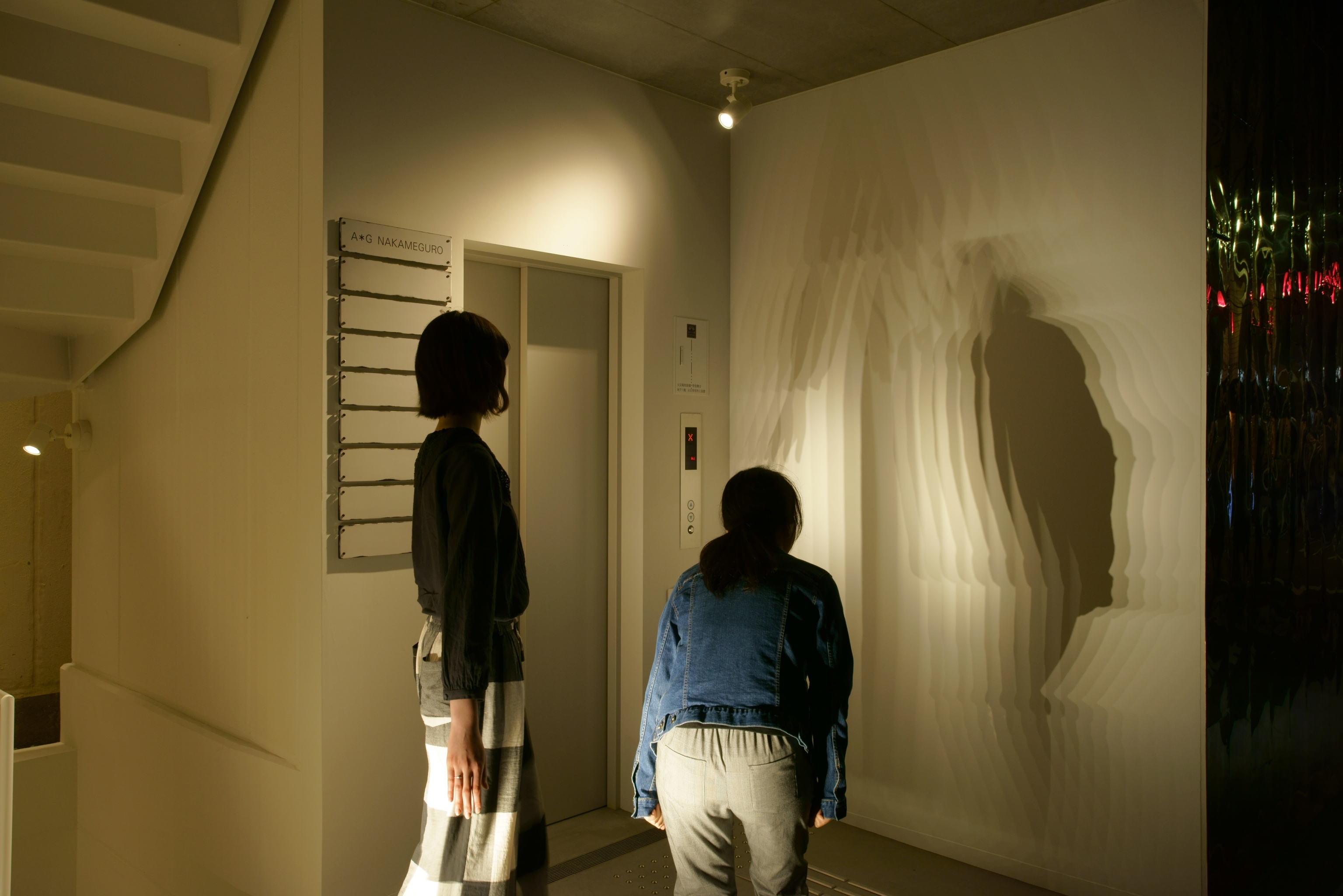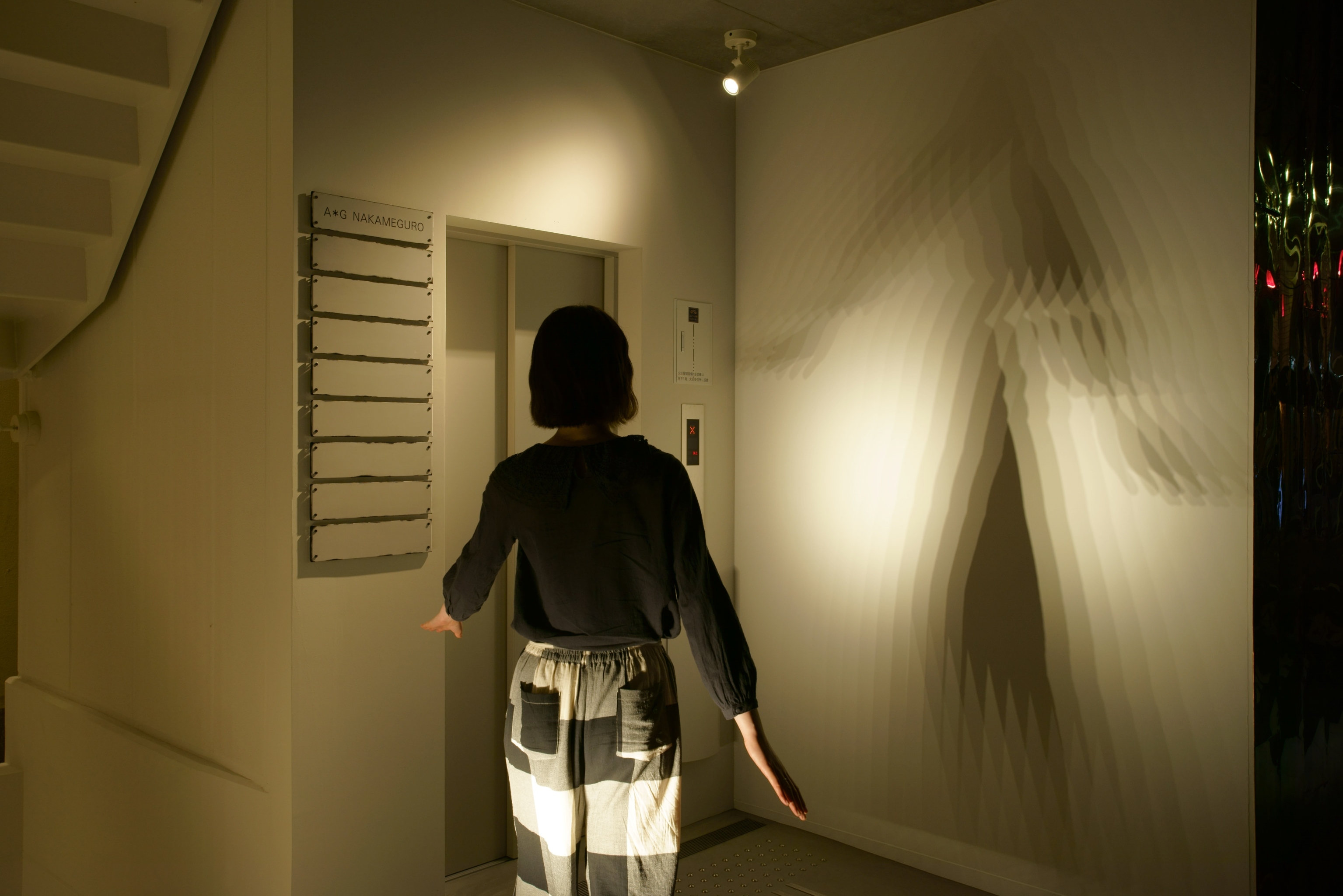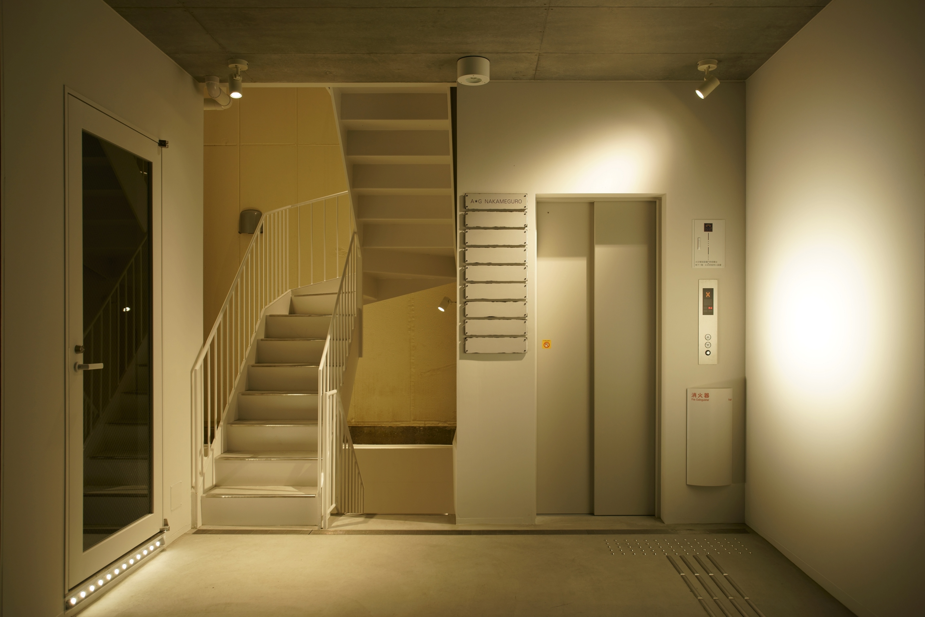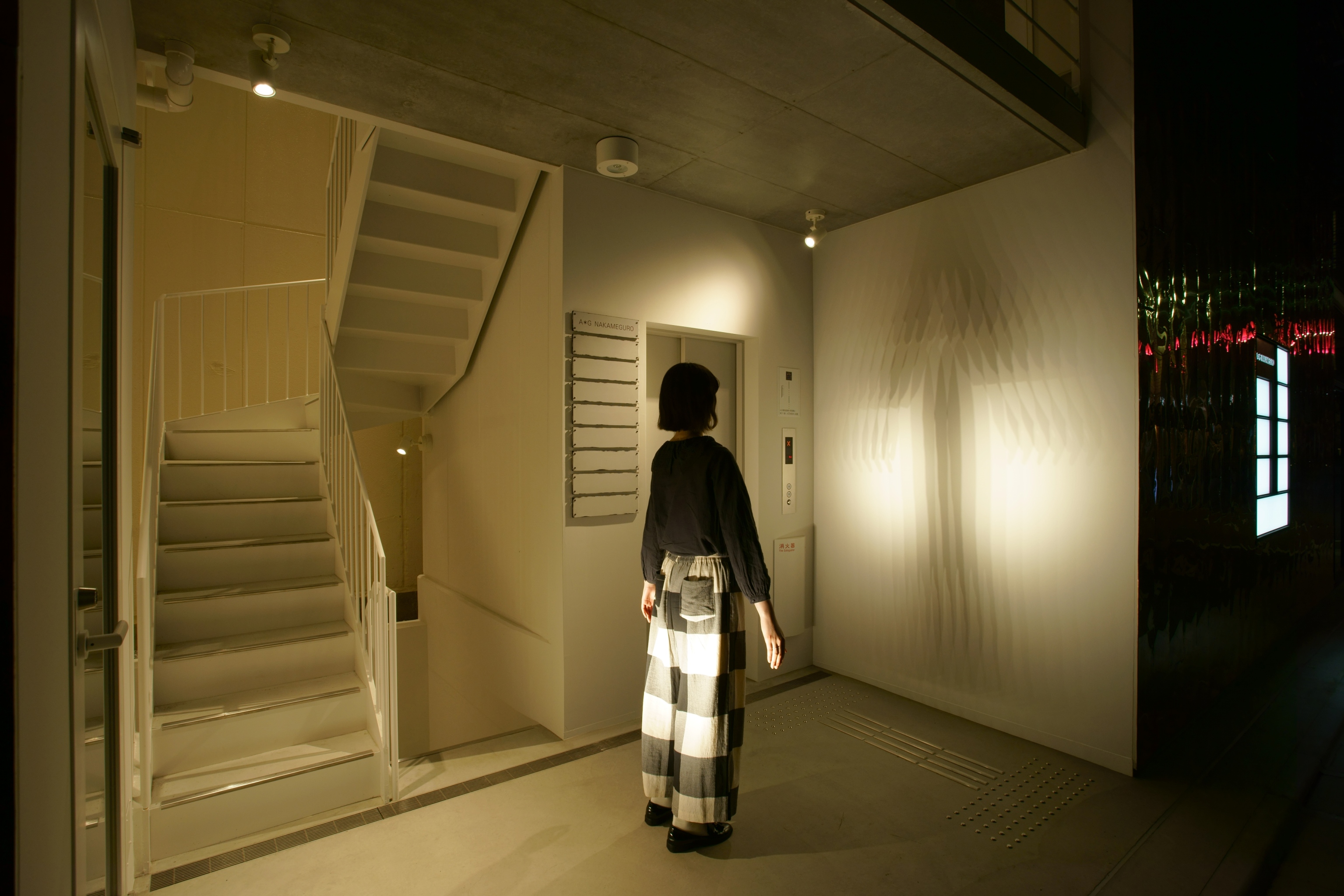 東京都内にある商業ビルの照明計画。弊社は共用部の照明計画を行った。1Fの共用部にはドットタイプのライン照明を低い位置に設置し、意図的に壁面にマルチシャドウ(幾重にも重なる影)を映し出す仕掛けを用意し、訪れる人を楽しませる。