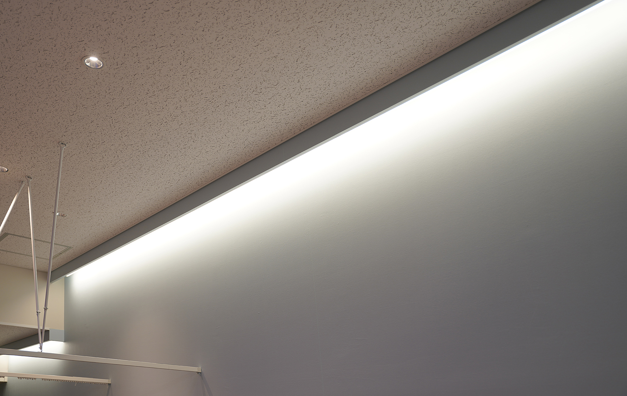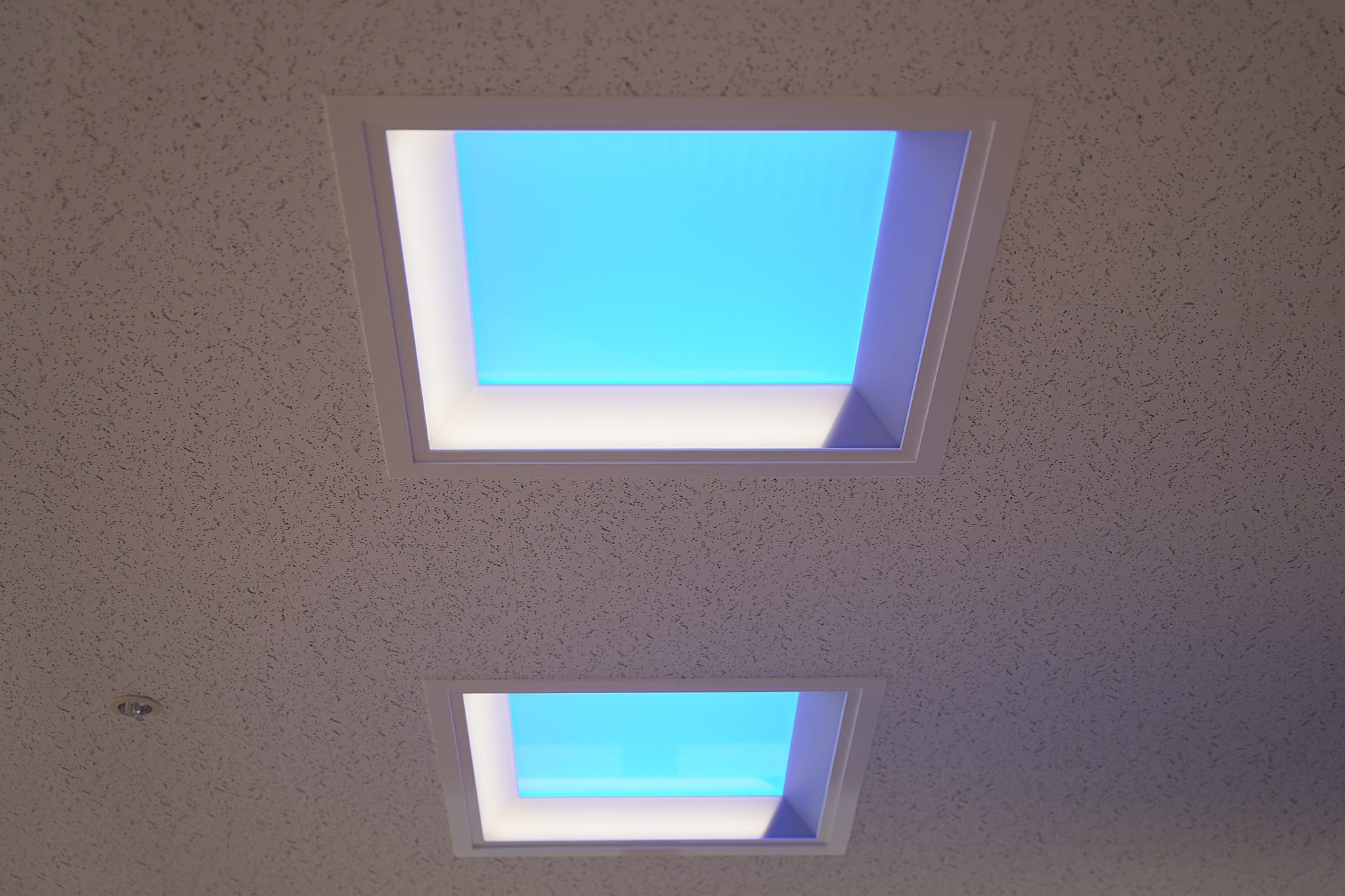また、間接照明で照らされた壁面の壁紙は空の青と横浜ベイエリアの海の青をイメージしたさわやかなライトブルーを採用し、天窓照明との組み合わせでたたかさがありながらも清涼感のある空間となっている。天窓照明だけでは不足する機能的な照度は高効率のグレアレスダウンライトで確保し、ダウンライトの眩しさを抑えることで天窓照明が空間の主役となるよう計画している。