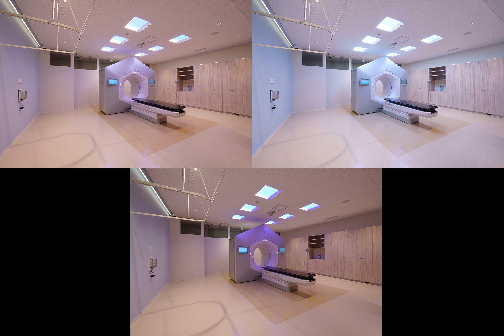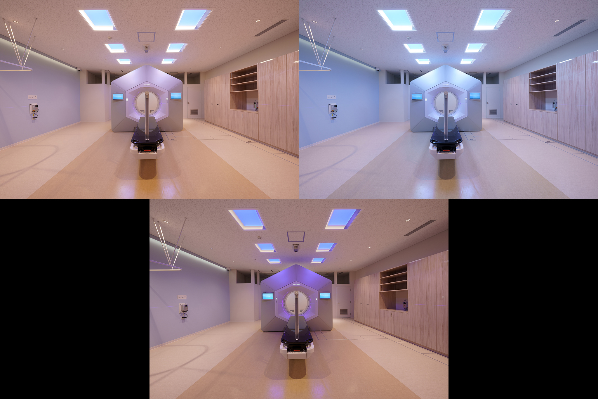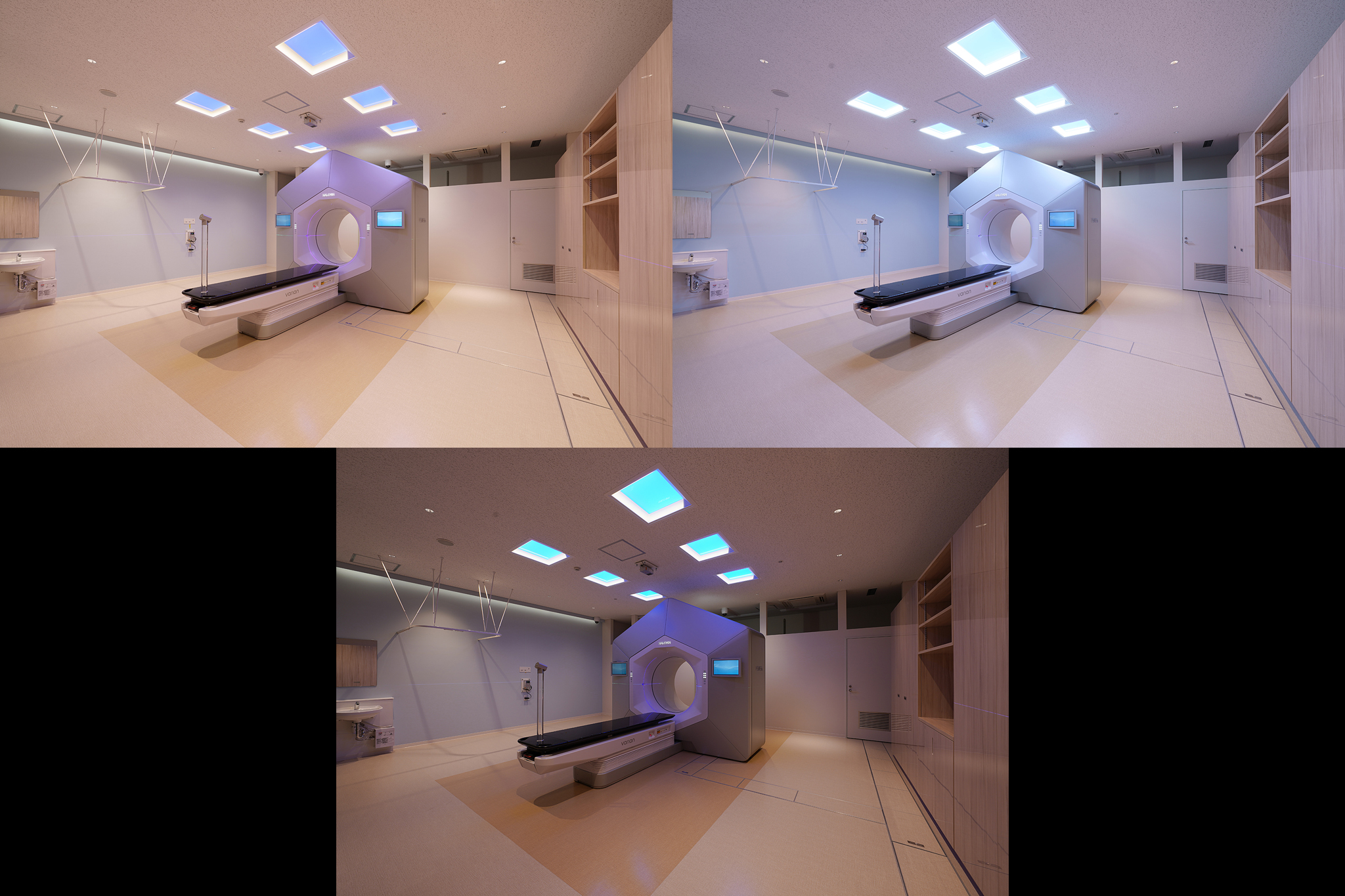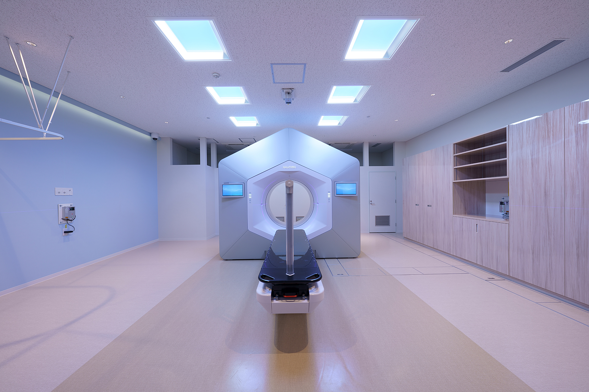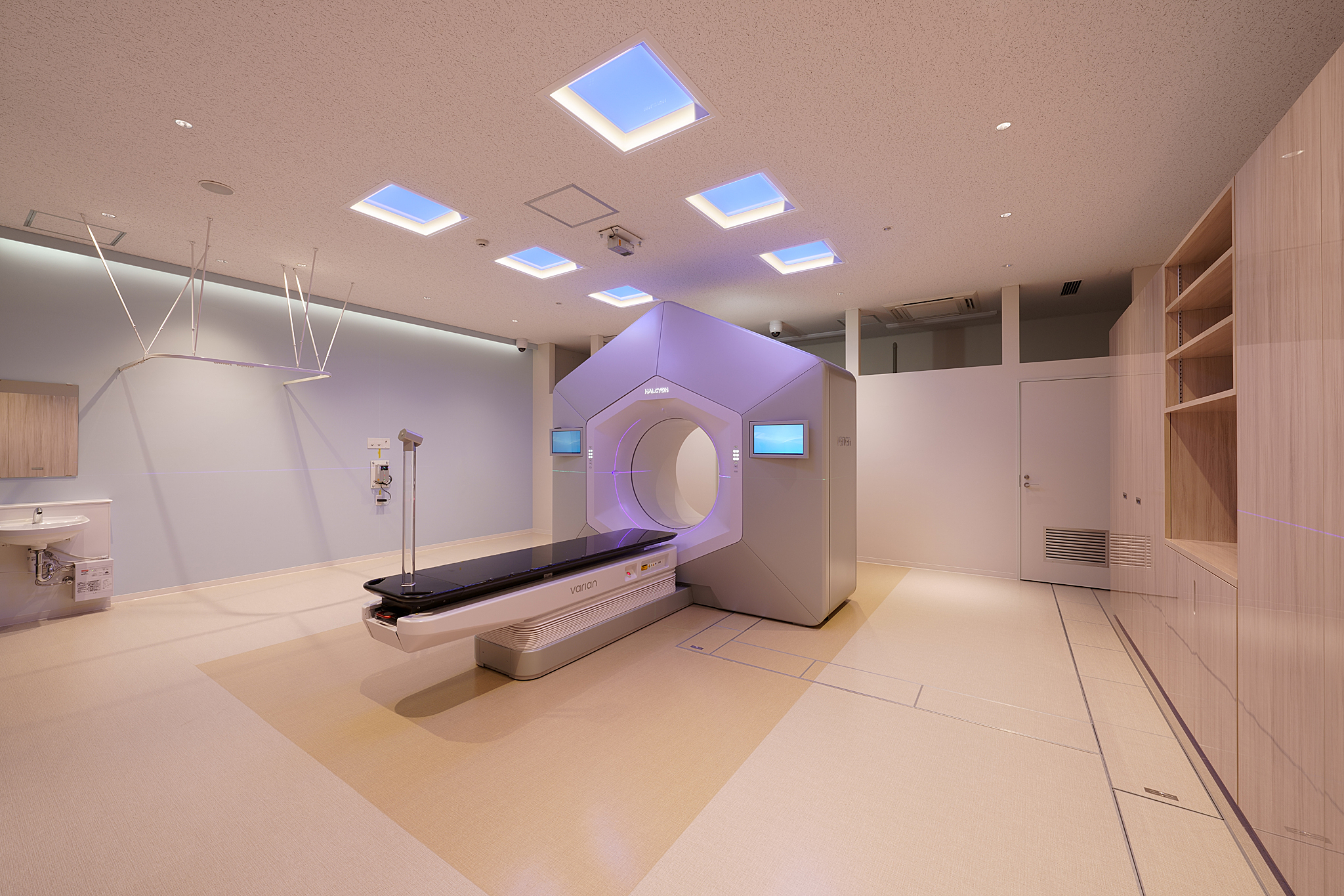 放射線治療室という空間は機能・性質上無窓空間になる場合がほとんどであり、大きな放射線治療装置が設置された空間は治療を受ける患者に圧迫感や緊張感を感じさせてしまう事も少なくない。本計画では三菱電機照明の天窓照明(青空照明)「misola」を採用する事で、無窓の放射線治療室にいながらもトップライトから差し込む太陽光を疑似的に体感し、患者の不安や緊張感を少しでも和らげる空間づくりを目指した。