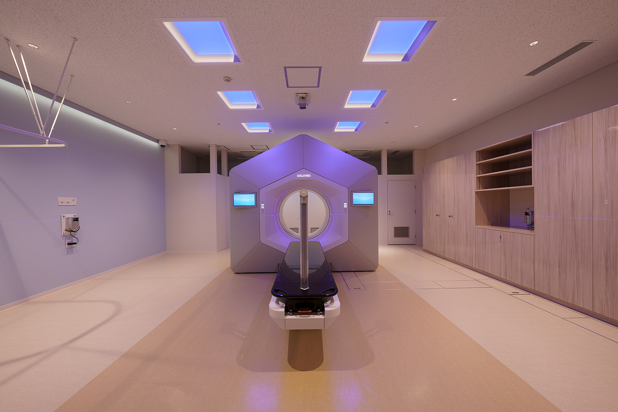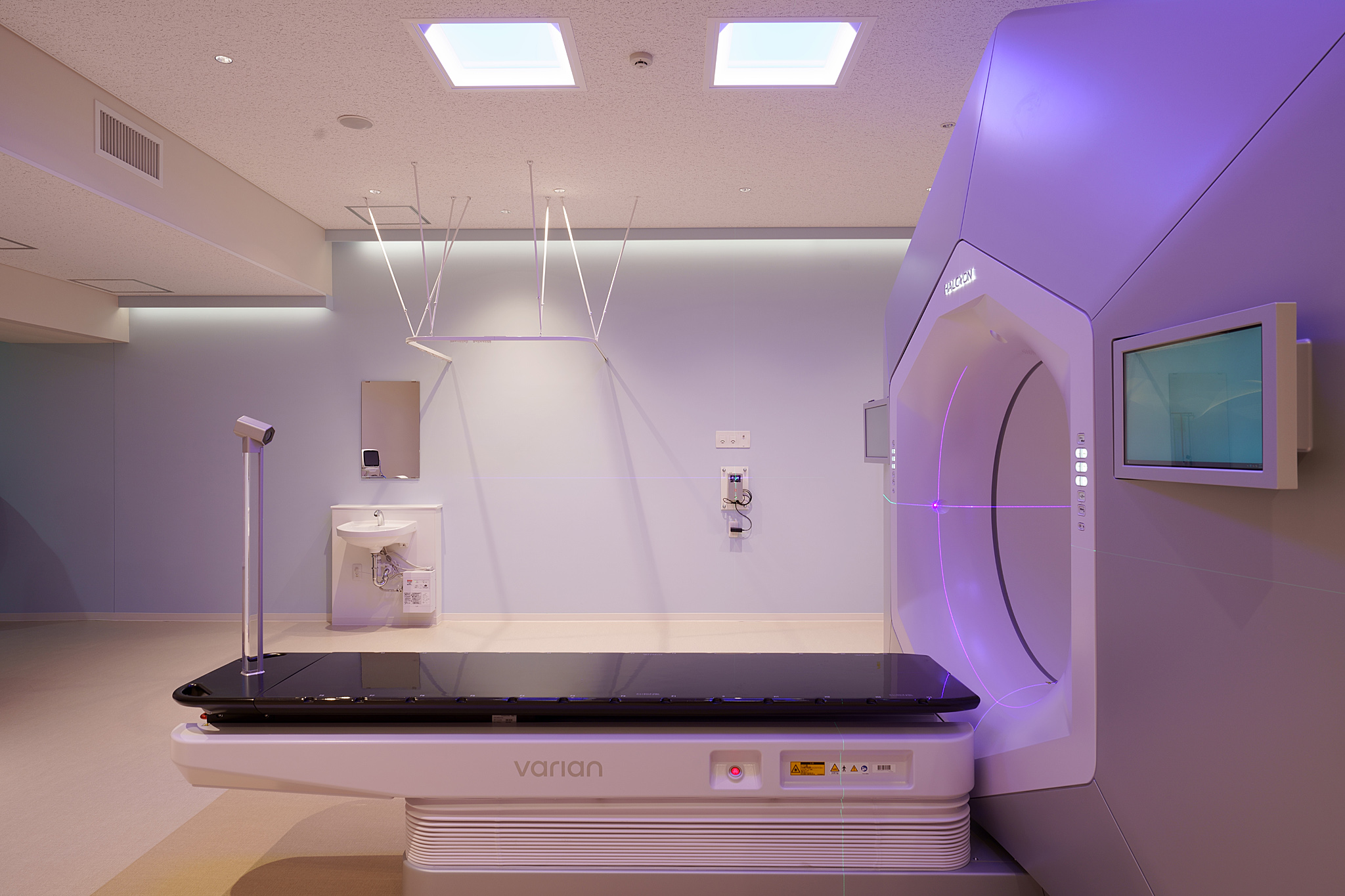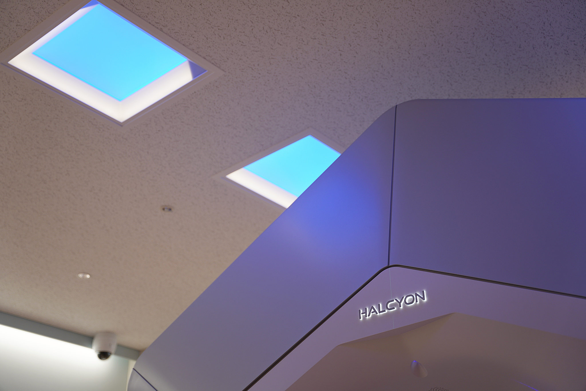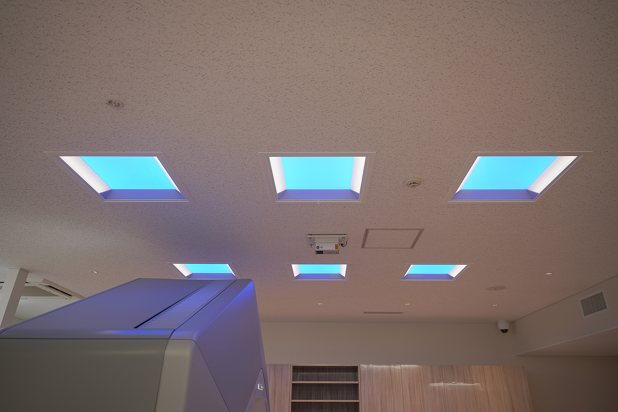 天窓照明は朝夕・昼・夜のシーンがセッティングされており、窓のない空間でも外光の変化を疑似体験する事ができる。先進的で丸みを帯びたやさしいデザインの放射線治療装置「HALCYON」は天窓照明との相性も良く、医療機器としての機能だけでなく、従来の放射線治療室とは一線を画す不安を感じさせない空間づくりの重要な要素の一つでもある。